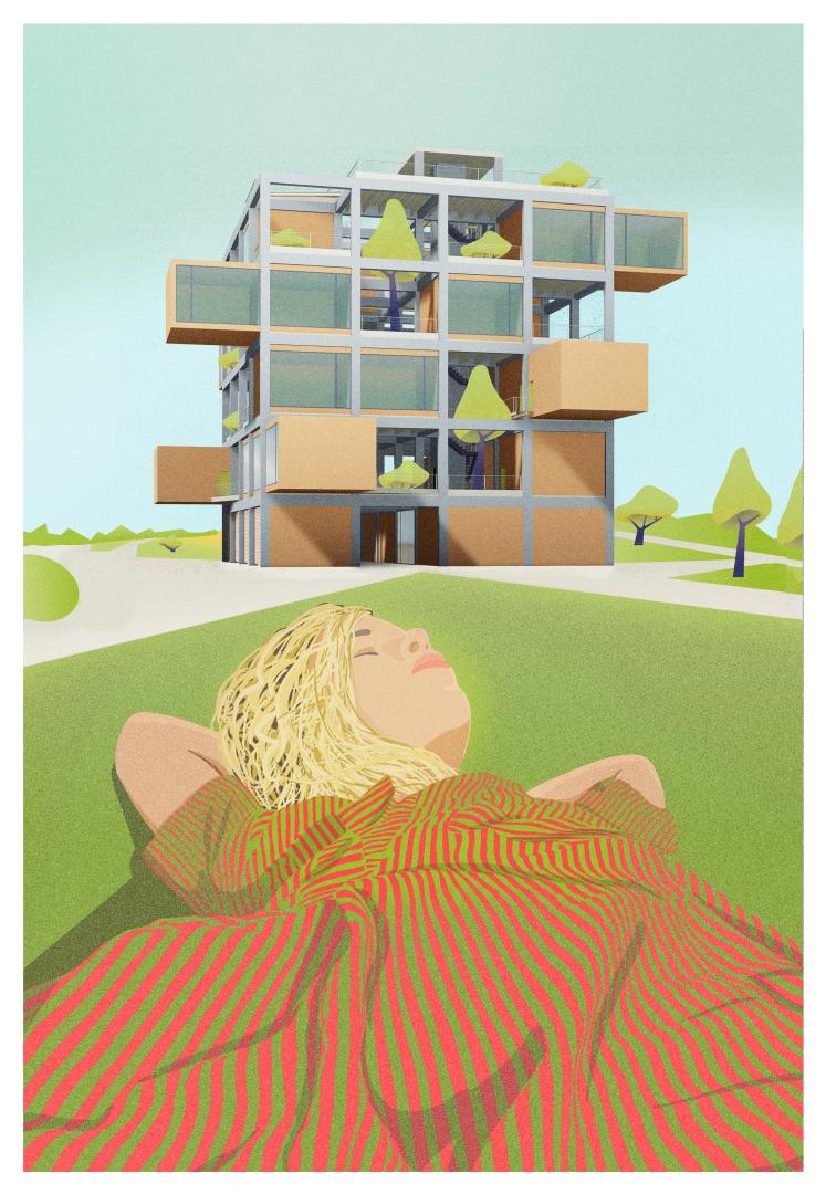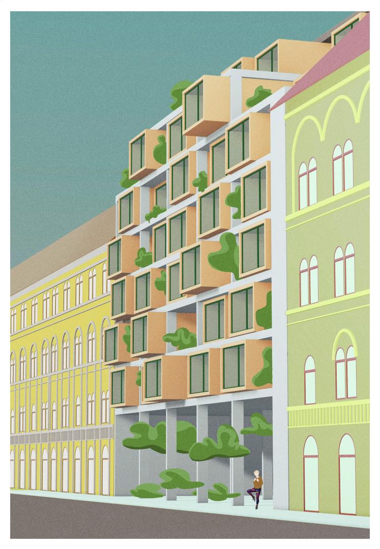 The innovation lies in the fact that one of the greatest handicaps of residential buildings is their inability to adapt to changing situations and handle changes in the size of the family flexibly - so the common habit in such cases is to move. The housing boxes, on the other hand, adapt to the grid of the existing reinforced concrete pillar frame structure and can accommodate different apartment sizes, which can be reduced or increased later by opening or closing the boxes together. Another way could be the possibility of exchanging apartments within the house. A forum can function within the house, in which the residents can plan and indicate their long-term apartment size needs. For example, an older couple living in a larger apartment, from which the children have already flown out, can exchange their apartment with a young couple living in a smaller box who are about to have children. The good functioning of this is facilitated by the large common terraces, which provide the opportunity for the development of a well-functioning residential community through meetings, where the intention to help each other is strongly present, not necessarily only when it comes to exchanging apartments.