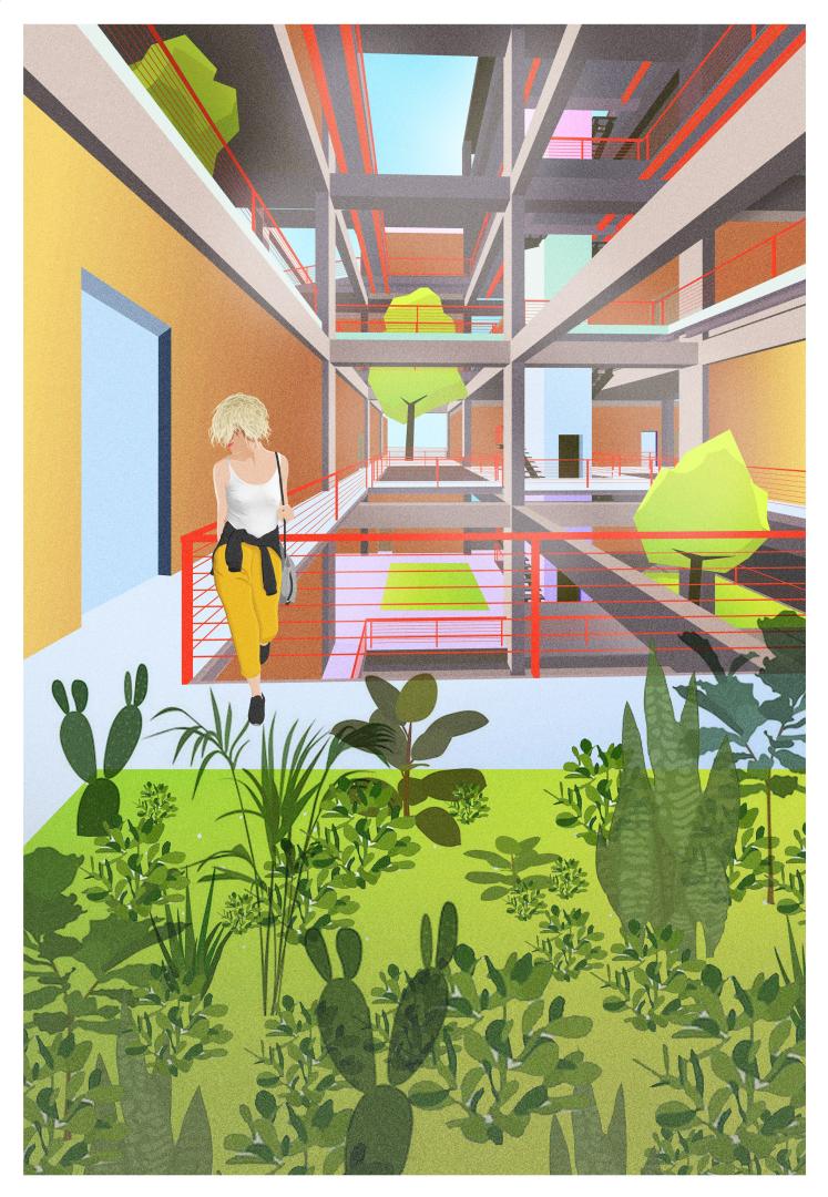 I used a framework for making interior spaces, but it leaves so many spaces open. The open spaces could give place for social things. I try to show in thistale: