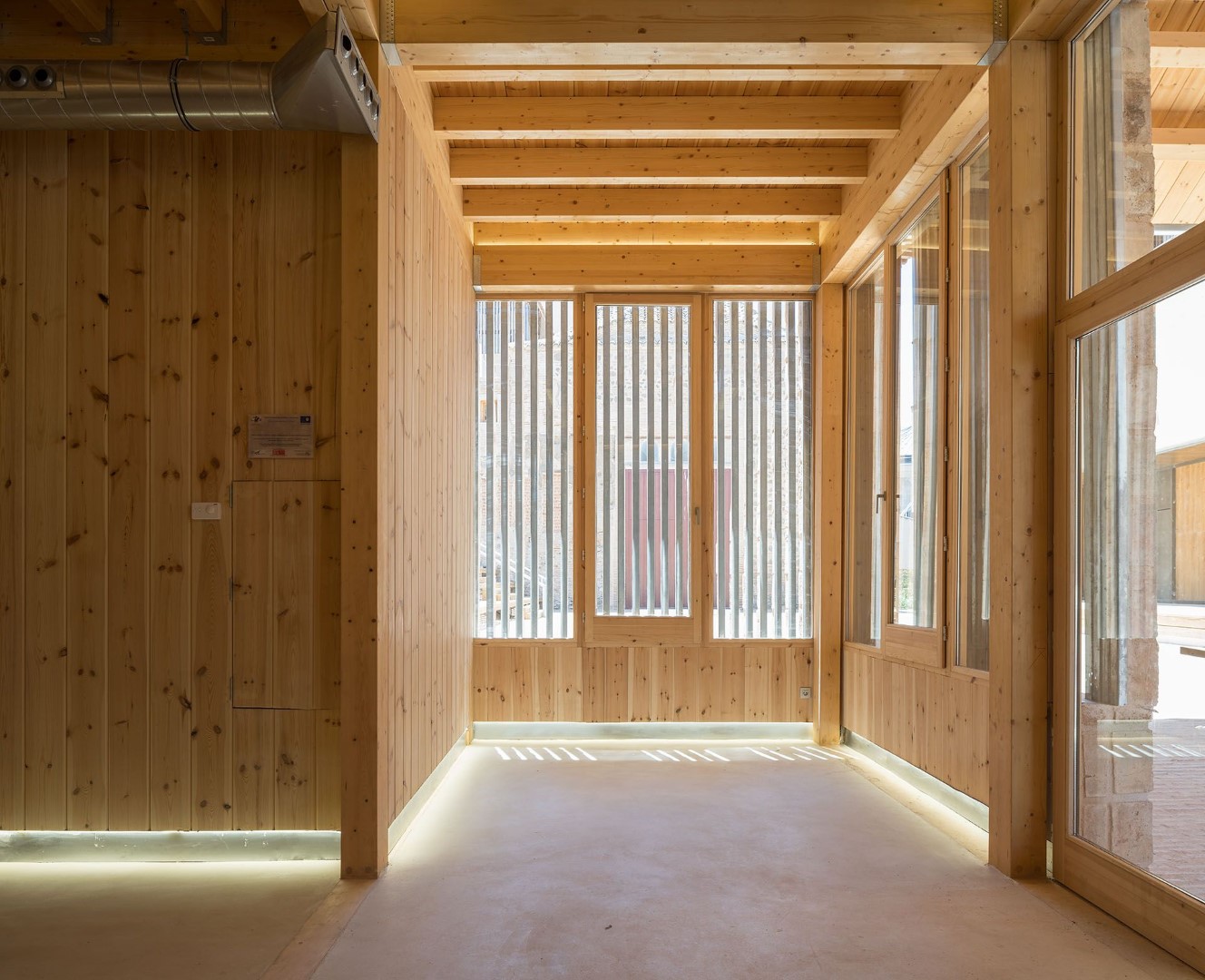 The project seeks to promote the presence of animal species that are beneficial to the environment, including swifts and bats. These species carry out biological control in the environment, as they feed on insects that are potential pest spreaders. To achieve this objective, openings have been made in the eaves of the new wooden building, giving these species a place to shelter.
