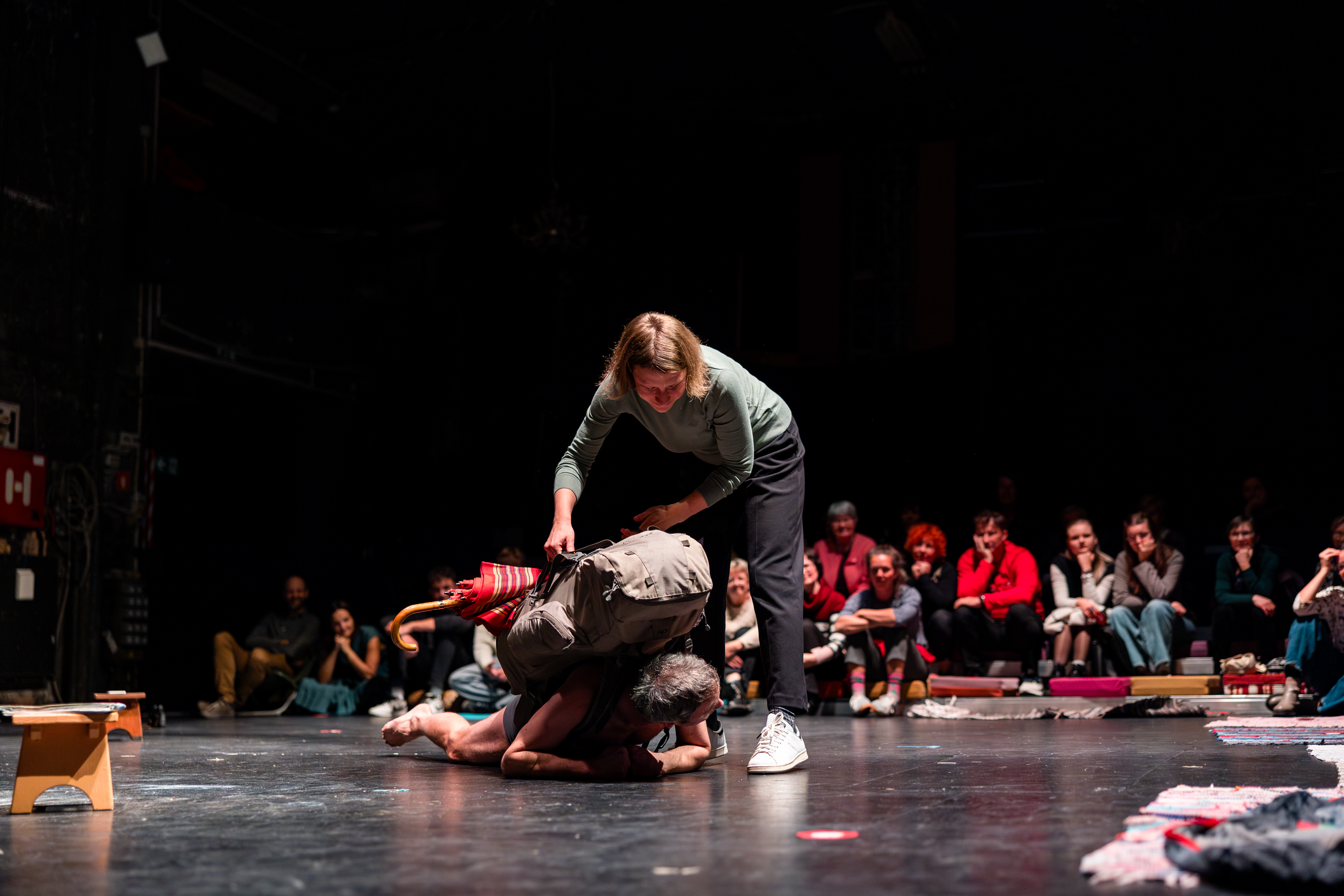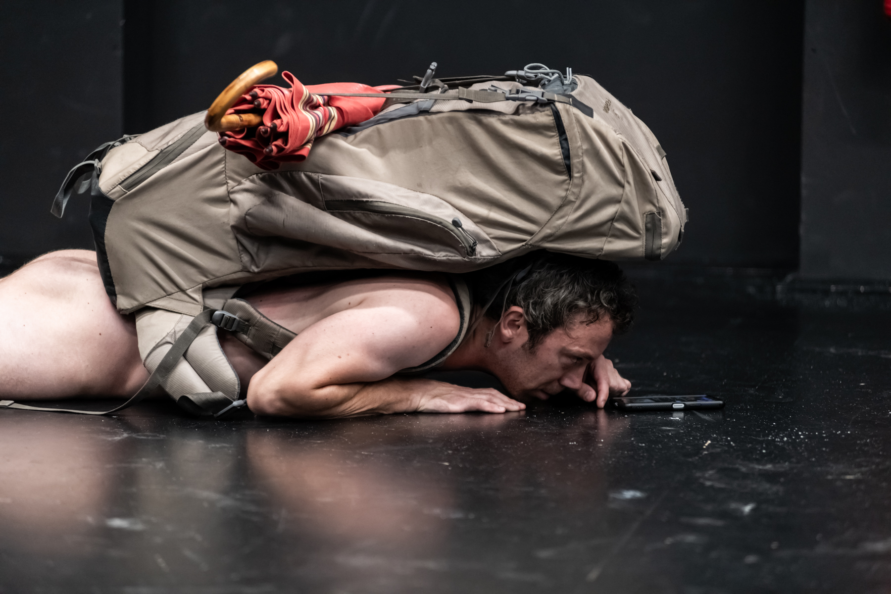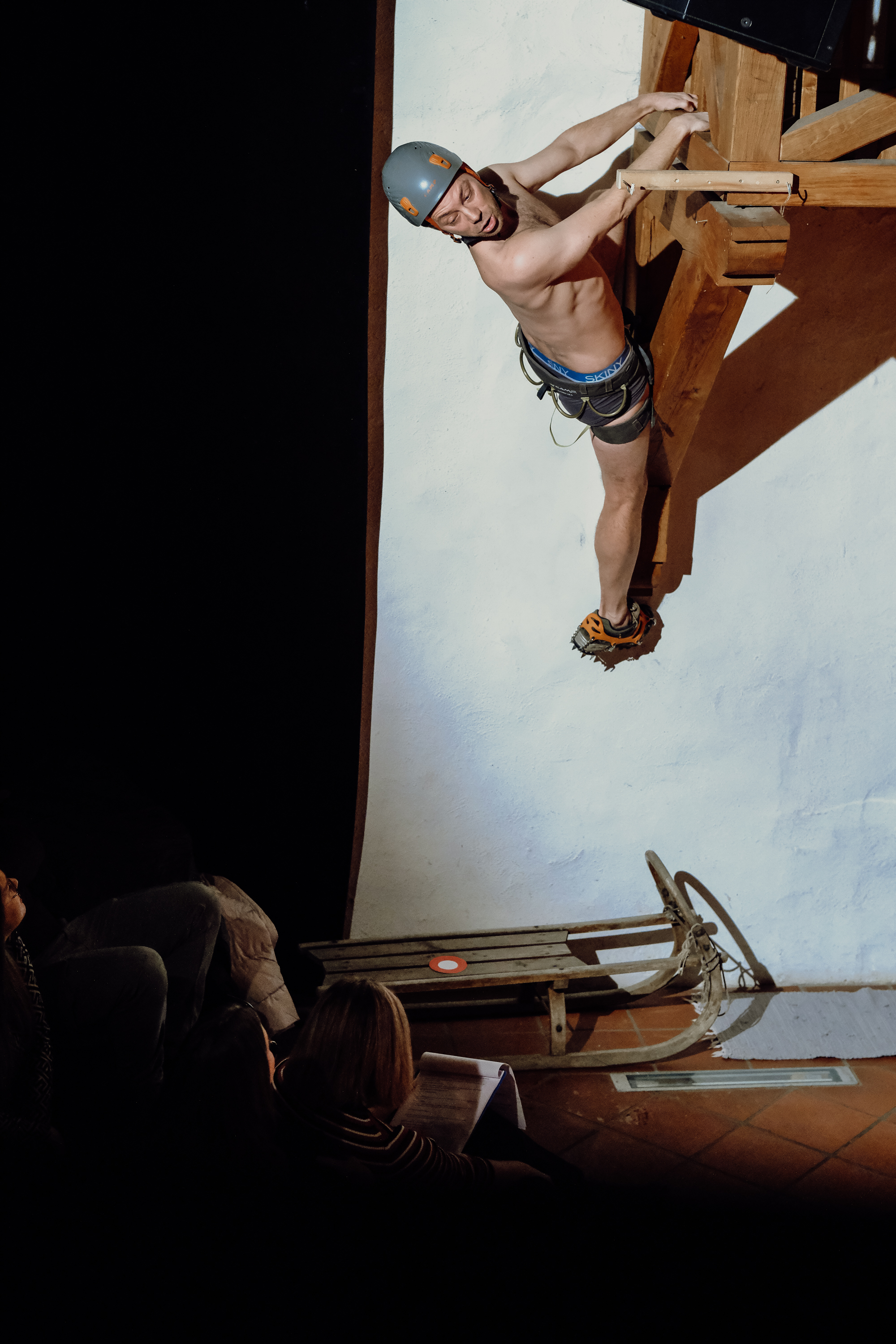 By merging site-specific movement with extreme physical adaptation, this project redefines performative space. Instead of fixed stage designs, it incorporates the natural and architectural elements of mountain huts, trails, and shelters, transforming them into active components of the performance. The vertical and horizontal dimensions of each space shape the movement vocabulary, making every performance distinct. Rather than relying on a predetermined stage, the performer engages with gravity, elevation, and terrain, continuously shifting between climbing, crawling, descending, and traversing surfaces. The backpack serves both as a functional object and a performative device, reinforcing themes of endurance, adaptation, and transition. A central innovation lies in the interaction between performance and environment, where movement through space is not just a choreographic decision but a necessity dictated by the landscape. This approach shifts the focus from theatrical illusion to real-time negotiation with the surroundings. Unlike conventional theater, where audiences remain passive, here spectators engage actively, following the performance as it unfolds. Their perspectives are constantly challenged—they must move, shift viewpoints, or physically reposition themselves to track the action. This direct involvement fosters a collective experience, transforming spectatorship into an act of presence and engagement. By fusing elements of mountaineering, climbing, endurance, storytelling, physical theater, and performance art, the project creates a hybrid form that challenges disciplinary boundaries. Rejecting traditional venues in favor of unpredictable, natural settings expands the concept of performative space, democratizing access to contemporary performance and bringing it to audiences in remote and unconventional locations. The constant negotiation between the body, environment, and audience blurs the line between performer and observer.