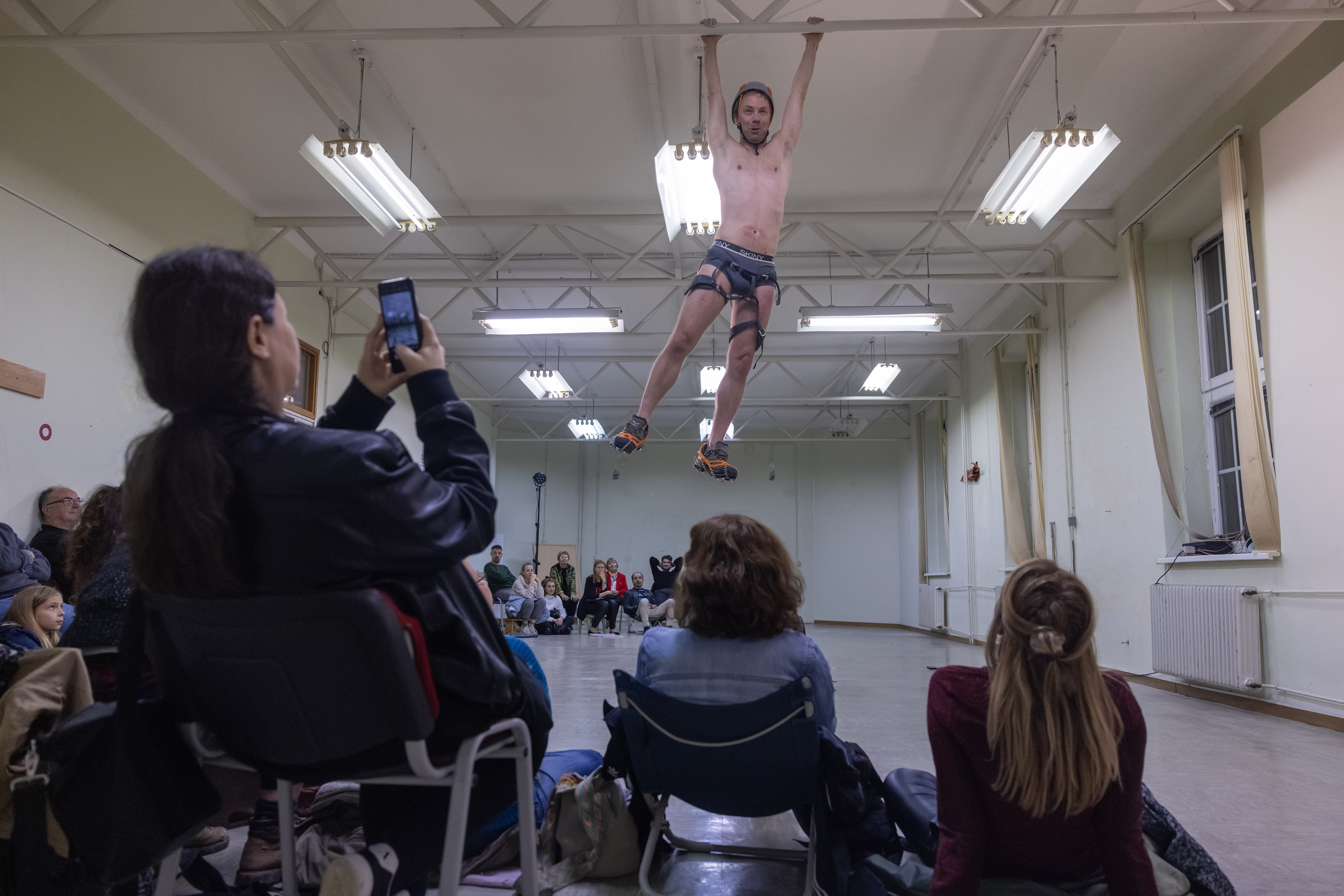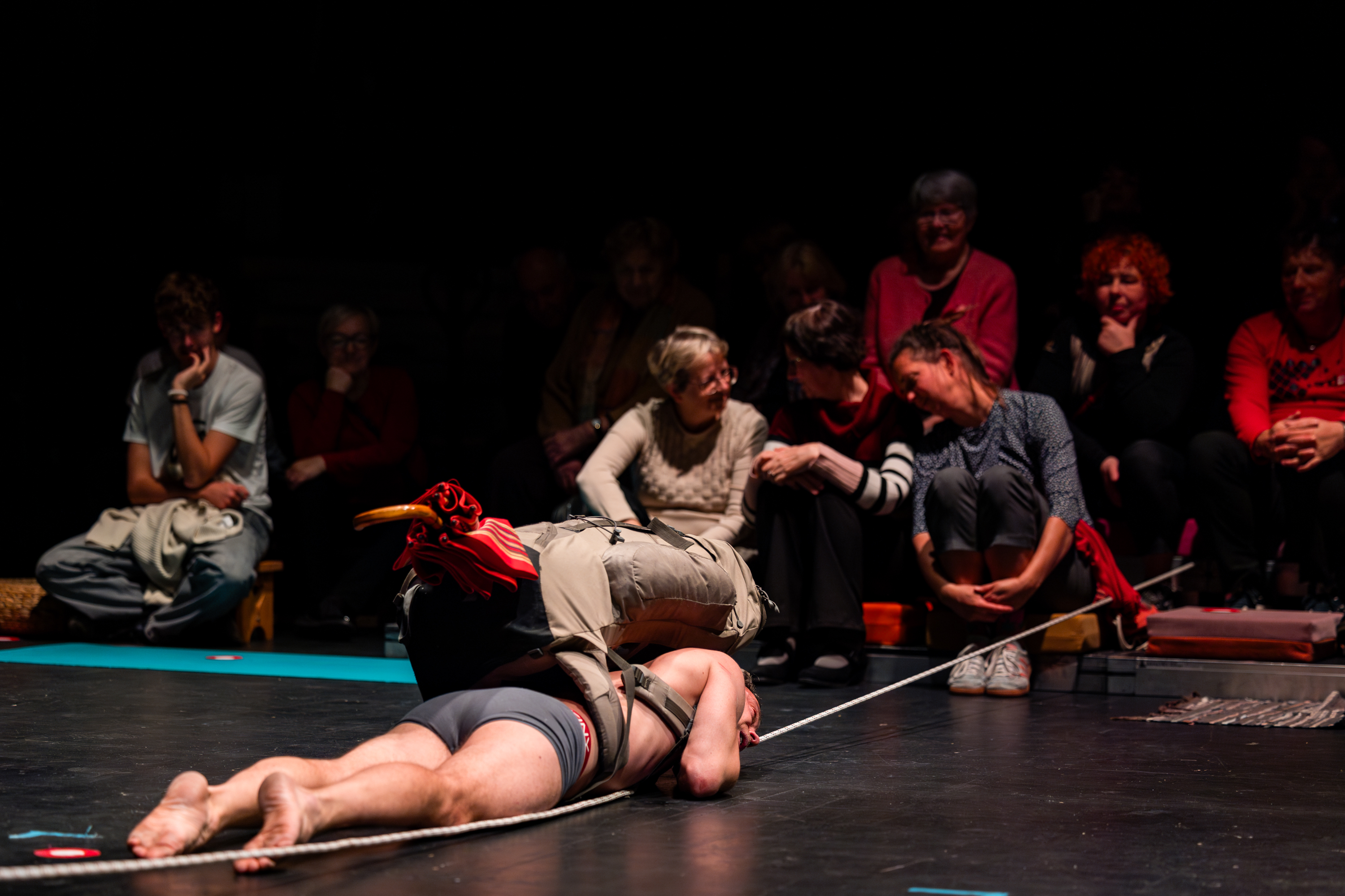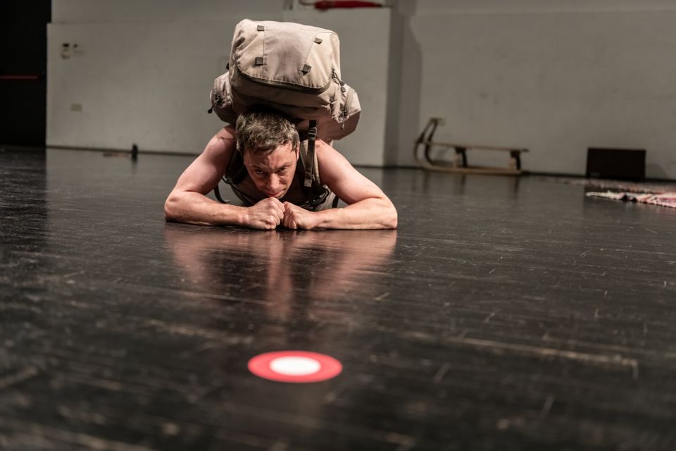 By merging site-specific movement with extreme physical adaptation, this project redefines performative space. Instead of fixed stage designs, it incorporates the natural and architectural elements of mountain huts, trails, and shelters, transforming them into active components of the performance. The vertical and horizontal dimensions of each space shape the movement vocabulary, making every performance distinct. Rather than relying on a predetermined stage, the performer engages with gravity, elevation, and terrain, continuously shifting between climbing, crawling, descending, and traversing surfaces. The backpack serves both as a functional object and a performative device, reinforcing themes of endurance, adaptation, and transition. A central innovation lies in the interaction between performance and environment, where movement through space is not just a choreographic decision but a necessity dictated by the landscape. This approach shifts the focus from theatrical illusion to real-time negotiation with the surroundings. Unlike conventional theater, where audiences remain passive, here spectators engage actively, following the performance as it unfolds. Their perspectives are constantly challenged—they must move, shift viewpoints, or physically reposition themselves to track the action. This direct involvement fosters a collective experience, transforming spectatorship into an act of presence and engagement. By fusing elements of mountaineering, climbing, endurance, storytelling, physical theater, and performance art, the project creates a hybrid form that challenges disciplinary boundaries. Rejecting traditional venues in favor of unpredictable, natural settings expands the concept of performative space, democratizing access to contemporary performance and bringing it to audiences in remote and unconventional locations. The constant negotiation between the body, environment, and audience blurs the line between performer and observer.
