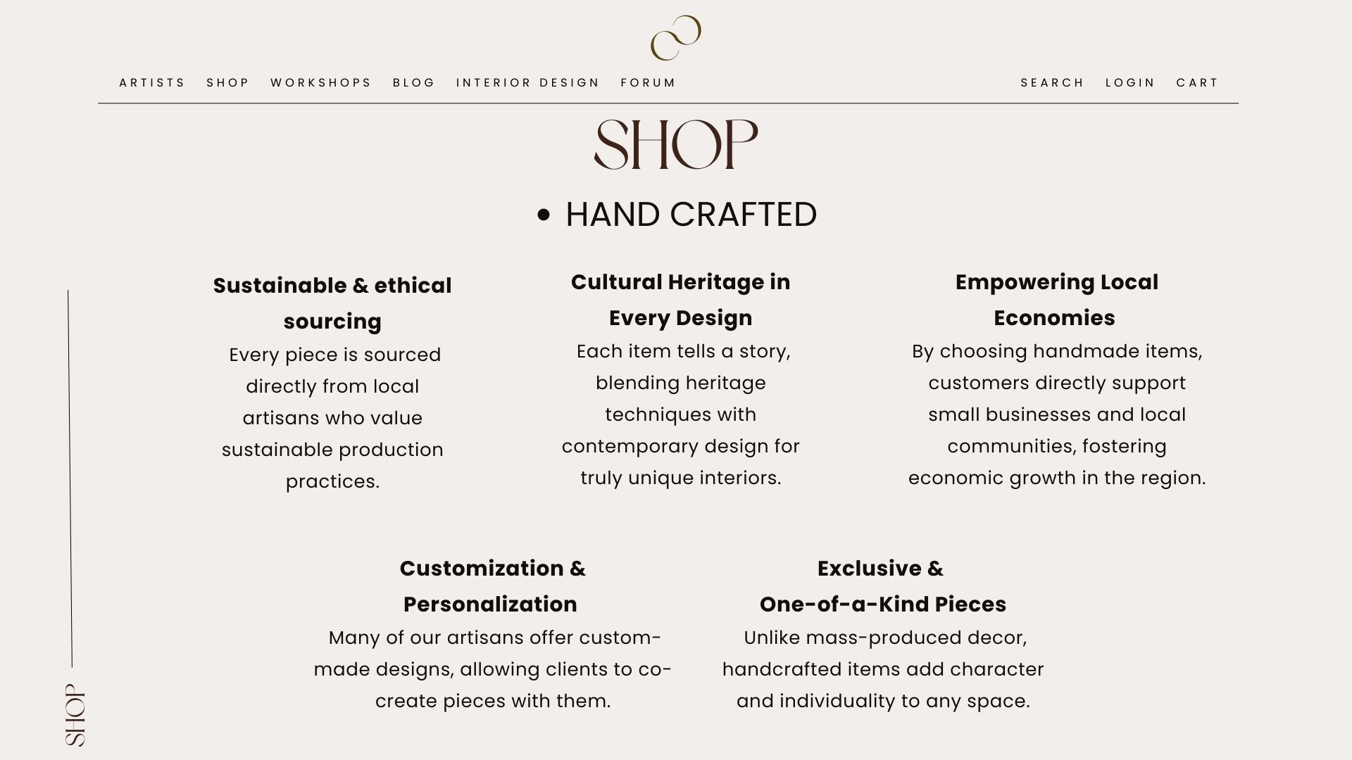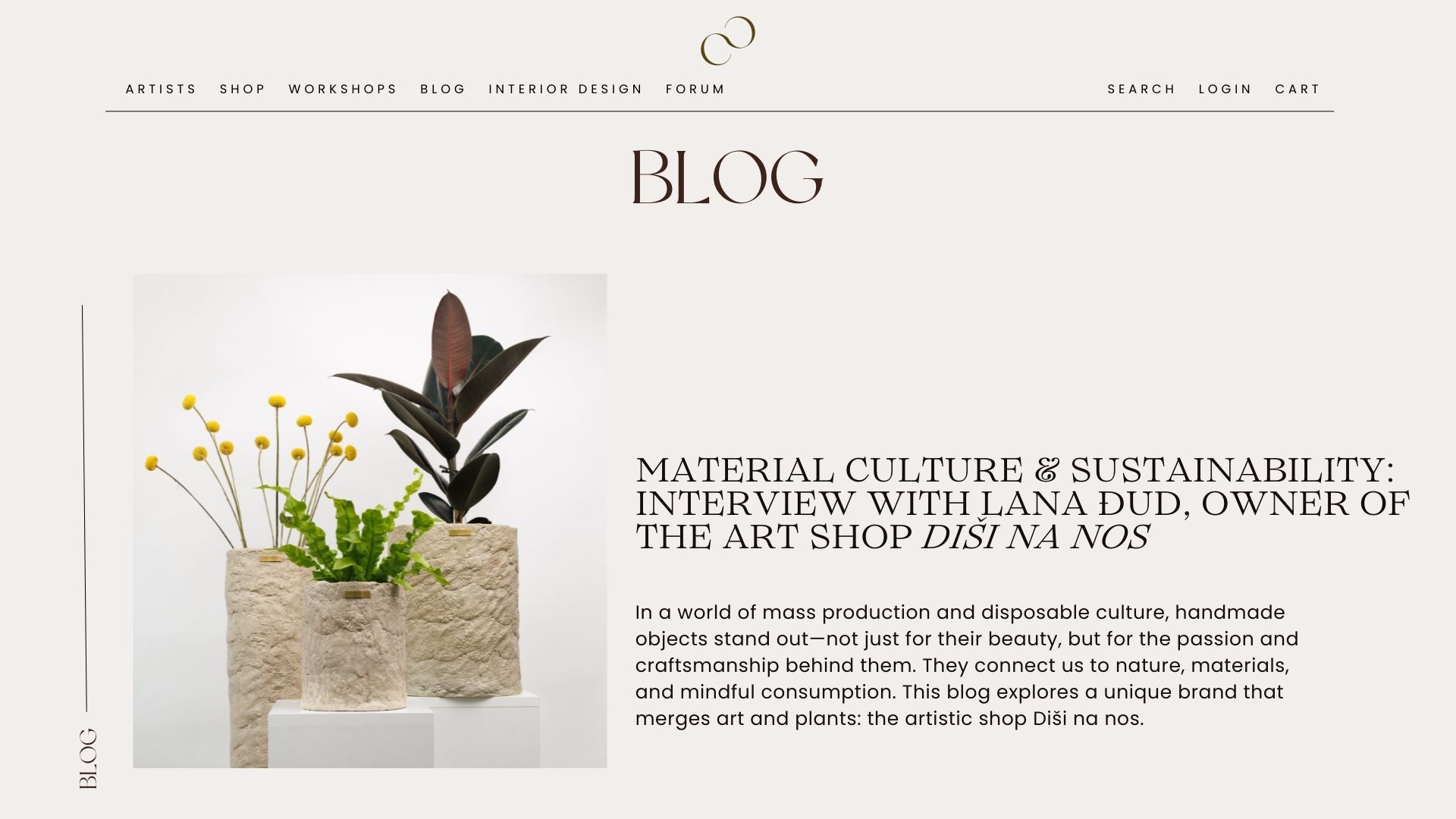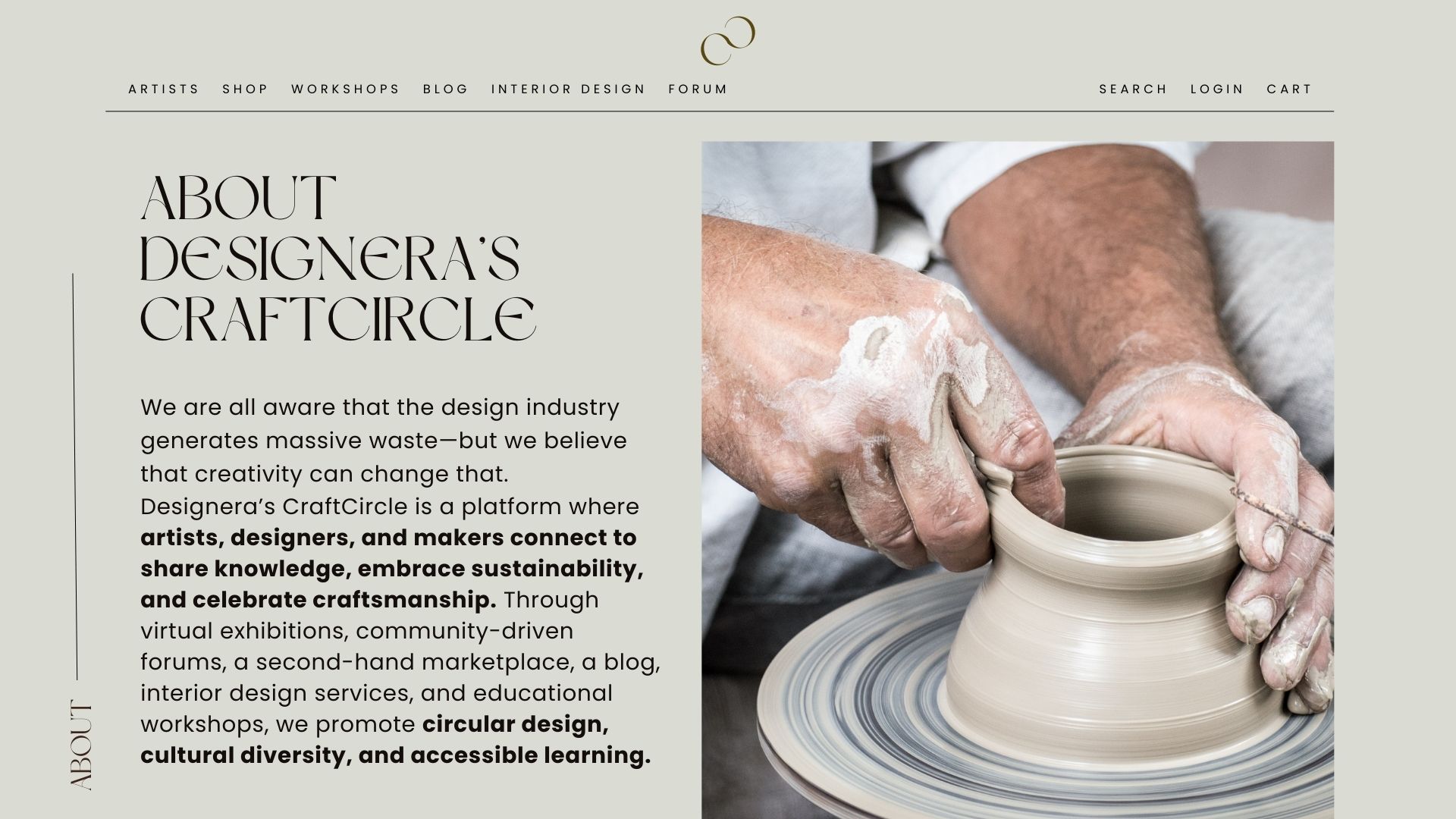 Designera's CraftCircle would offer a visually engaging experience, celebrating highly aesthetic design while promoting cultural diversity, sustainability and craftmanship. The platform’s design and cultural focus are rooted in three core objectives: 1. Promote Beautiful, Sustainable Design: CraftCircle highlights designs that are not only functional but also aesthetically beautiful, long-lasting, and environmentally responsible. These are carefully selected by an expert interior designer. The virtual gallery showcases high-quality designs and creative processes, while the platform's intuitive interface enhances user engagement, encouraging exploration of sustainable practices. 2. Cultural Benefits and Diversity: CraftCircle celebrates cultural diversity by featuring regional artisans and promoting traditional crafts alongside contemporary design. The platform highlights Croatia’s cultural heritage and encourages users to explore various design practices. It fosters collaboration, amplifying the unique characteristics of different artistic cultures and enriching the user experience with diverse design techniques. This inclusive approach allows users to connect with artisans from various backgrounds. 3. User-Centric, Intuitive Experience: CraftCircle creates a seamless platform for both beginners and professionals to easily discover content, browse the marketplace, or participate in workshops. Its simple navigation and filtering options help users find specific skills, such as upcycling or sustainable materials. The platform integrates workshops, blogs, and the marketplace into a cohesive design, providing a smooth user journey. The virtual gallery and marketplace create emotional connections to sustainable and culturally significant works, while interior design service help in choosing home goods. Designera's CraftCircle exemplifies how a thoughtful and intuitive design can be a catalyst for beauty, sustainability, inclusivity, and cultural appreciation.