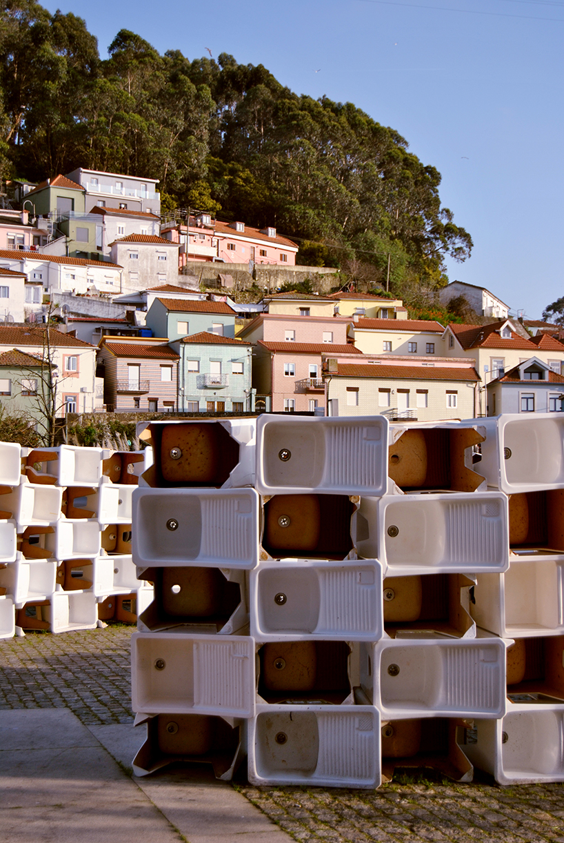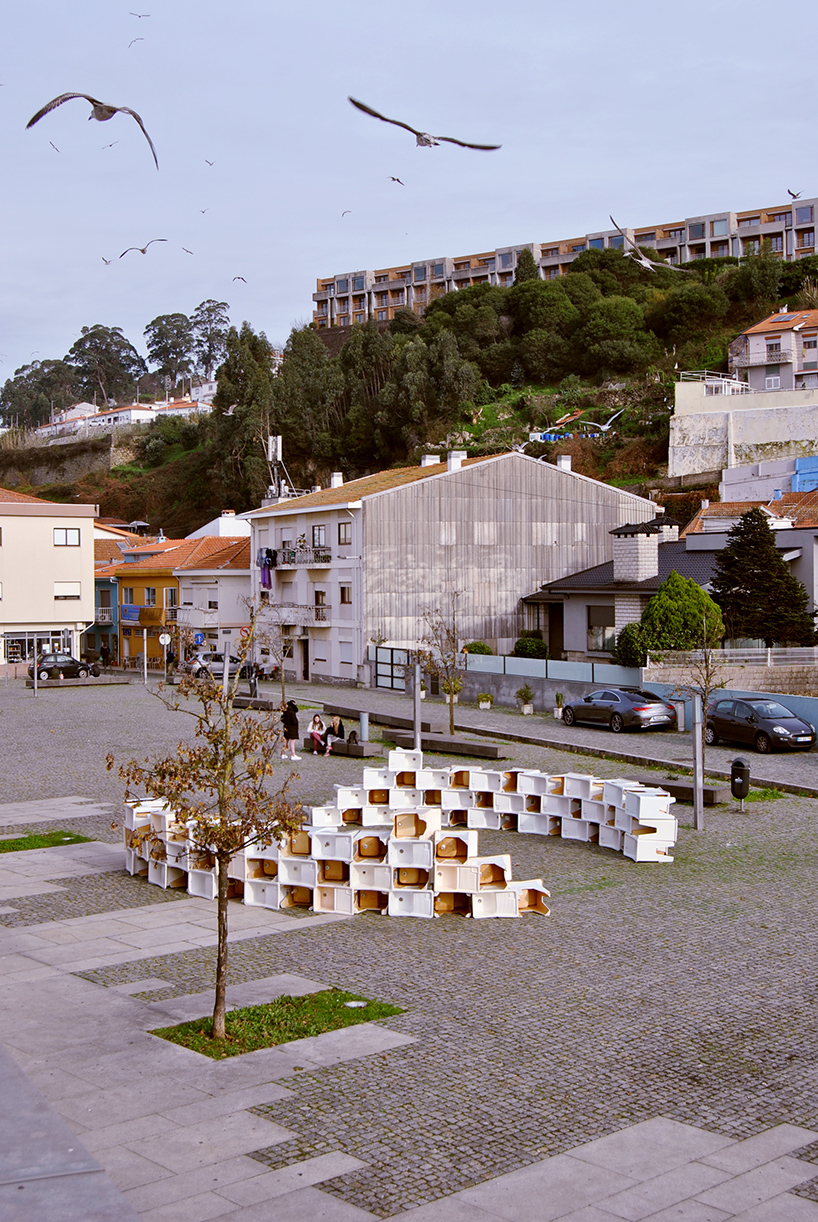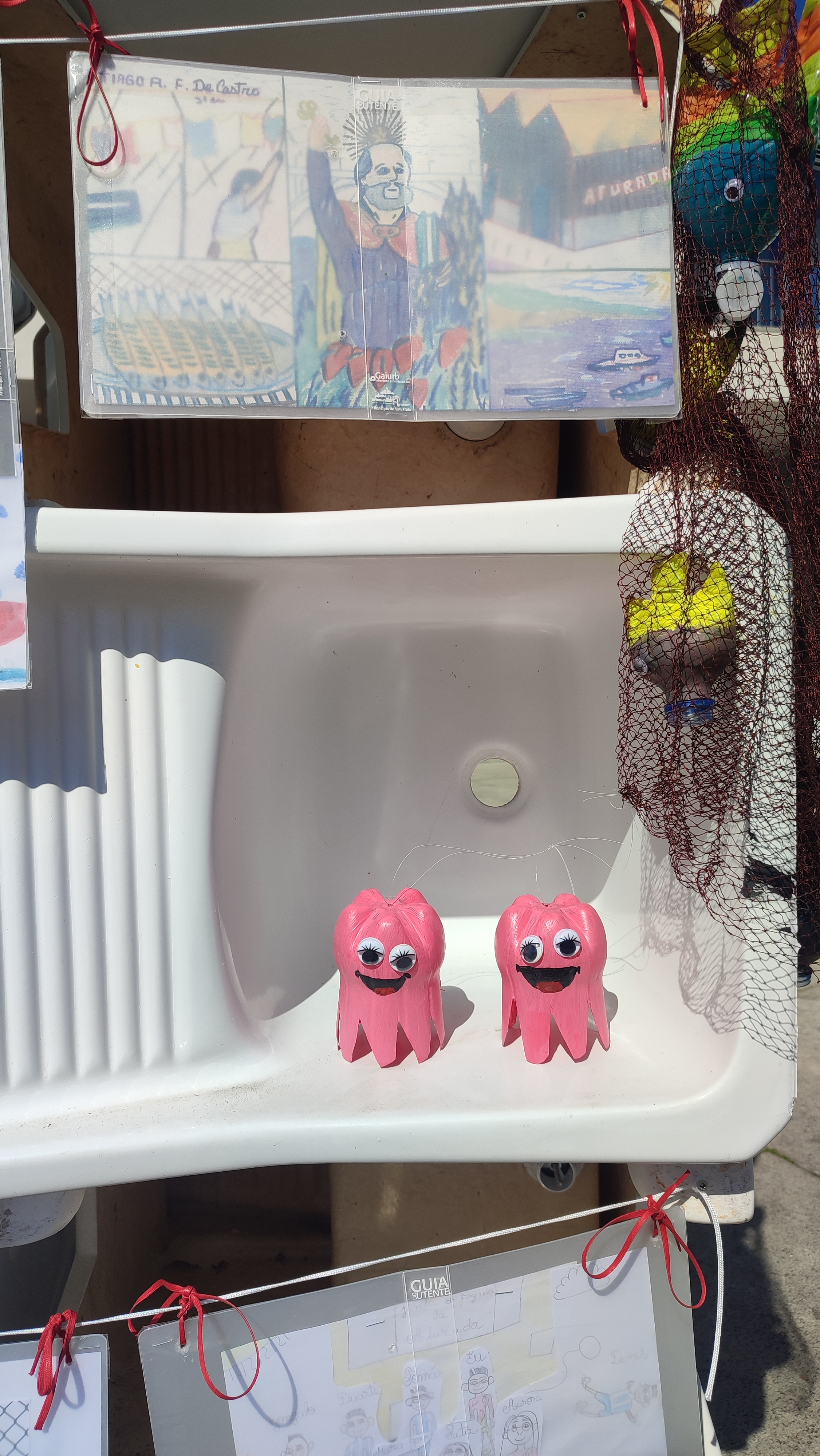 The project took an everyday object in traditional Portuguese houses, the washing tank, and elevates it into a sculptural and symbolic form. Once associated with domestic labor and shared social rituals, these tanks are reassembled into a striking urban landscape that invites contemplation, interaction, and participation. The result is an installation that is both unexpected and deeply familiar, challenging perceptions of what constitutes art in public space.The installation was conceived as a collective canvas, where local residents and schoolchildren were invited to contribute artistic elements. Through workshops, participants and students created collages, drawings, poetry, and personal testimonies that were later incorporated into the artwork, turning the structure into a patchwork of community voices. Additionally, discarded fishing nets and repurposed textiles were integrated into the installation, adding layers of color and texture that visually connected the piece to Afurada’s rich maritime identity.