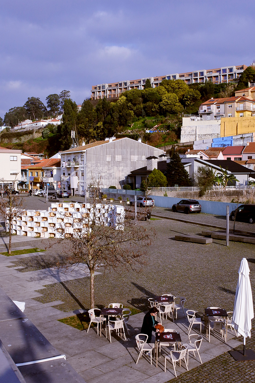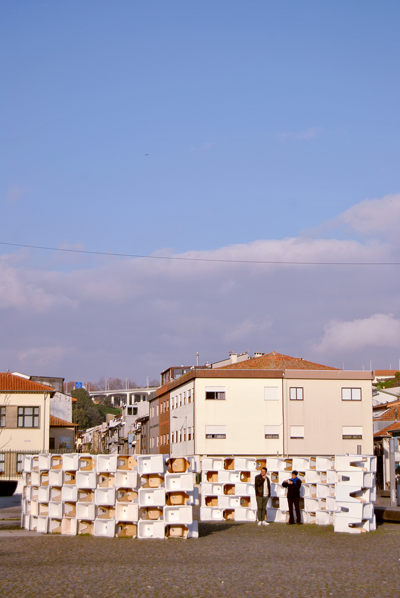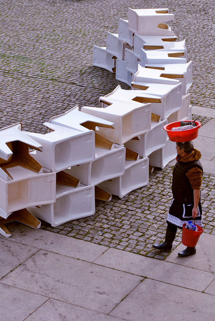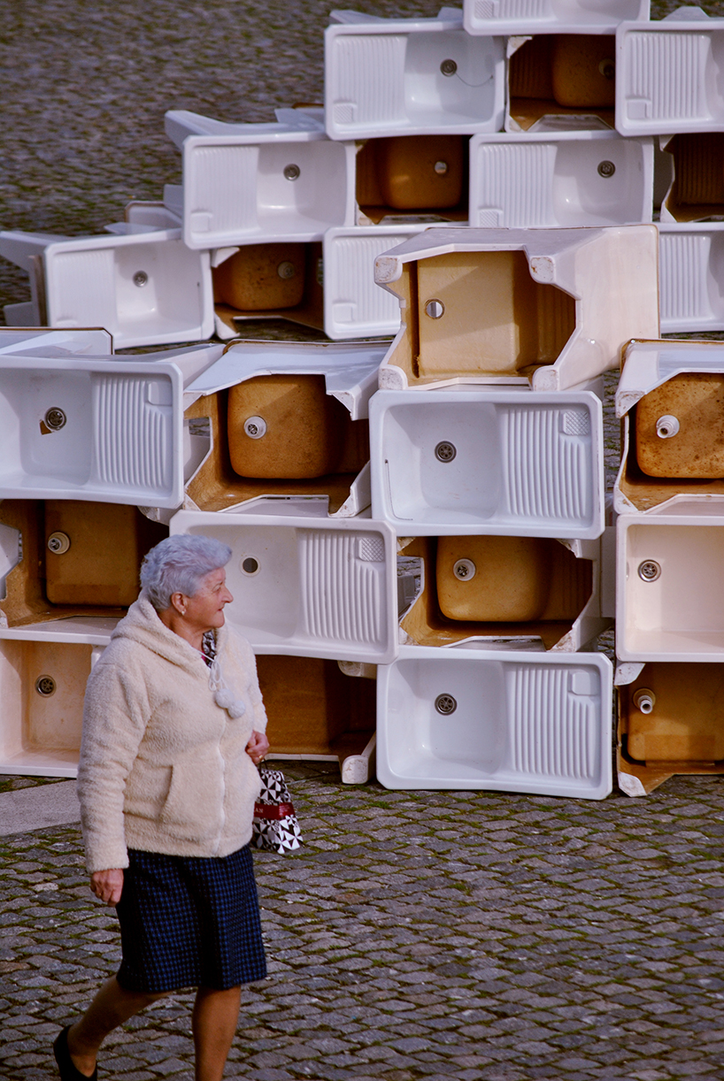 The project took an everyday object in traditional Portuguese houses, the washing tank, and elevates it into a sculptural and symbolic form. Once associated with domestic labor and shared social rituals, these tanks are reassembled into a striking urban landscape that invites contemplation, interaction, and participation. The result is an installation that is both unexpected and deeply familiar, challenging perceptions of what constitutes art in public space.The installation was conceived as a collective canvas, where local residents and schoolchildren were invited to contribute artistic elements. Through workshops, participants and students created collages, drawings, poetry, and personal testimonies that were later incorporated into the artwork, turning the structure into a patchwork of community voices. Additionally, discarded fishing nets and repurposed textiles were integrated into the installation, adding layers of color and texture that visually connected the piece to Afurada’s rich maritime identity.