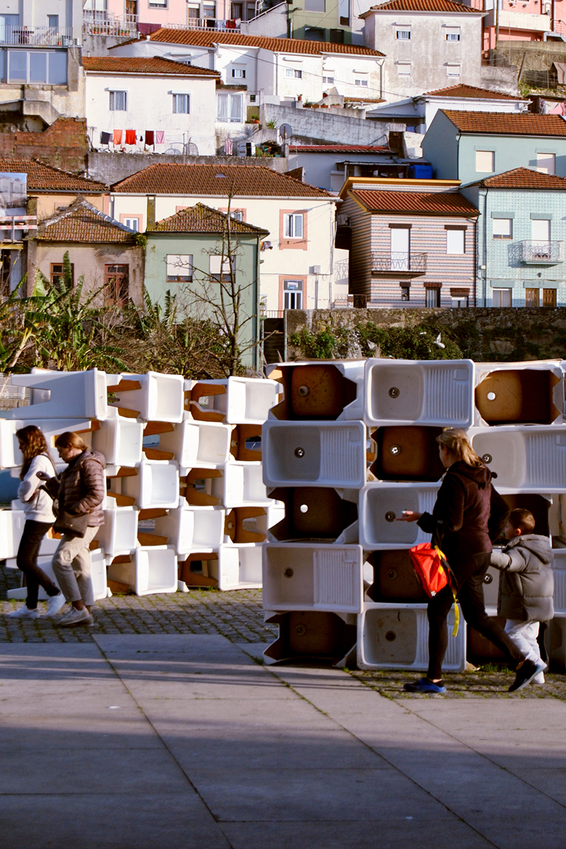 Sabão exemplified sustainable urban intervention by repurposing 150 washing tanks that would otherwise have become waste. The project embraced circular economy principles by transforming these discarded objects into the building blocks of a public artwork, reducing environmental impact and promoting material reuse. Lightweight, reversible assembly methods ensured minimal alteration to the urban fabric, while locally sourced materials, such as reclaimed fishing nets, reinforced environmental responsibility.