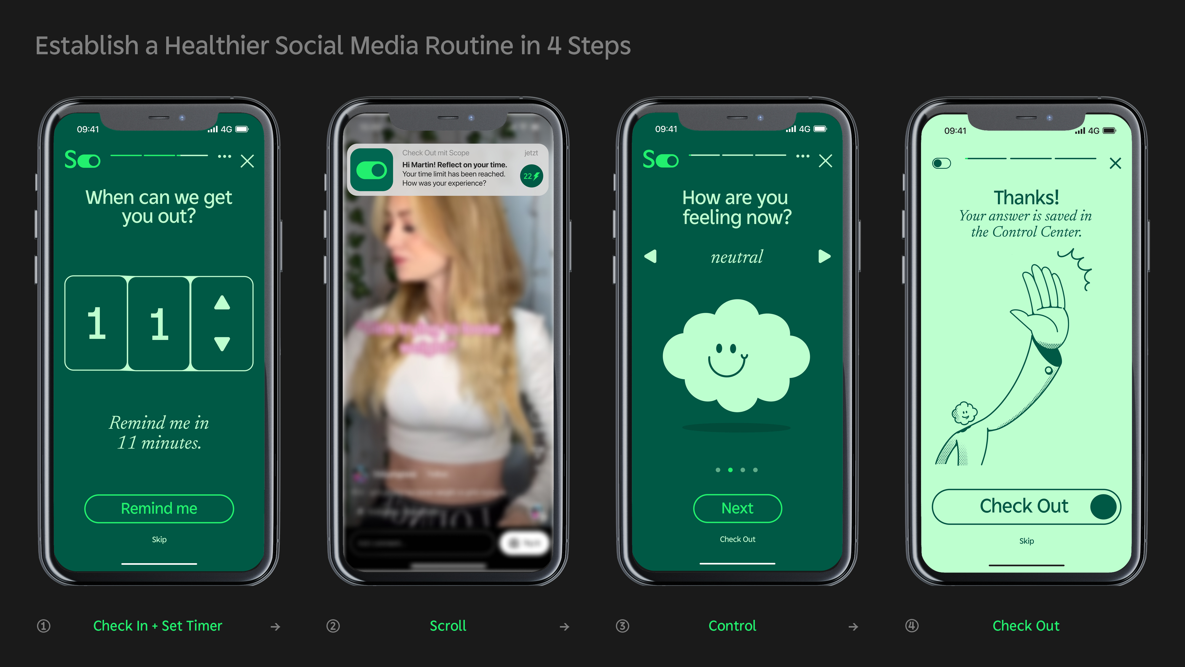 Scope tackles these issues, by redesigning how we engage with use social media. It introduces a structured routine around our daily consumption, incorporating a mental health check-in before and a debriefing after each social media session.