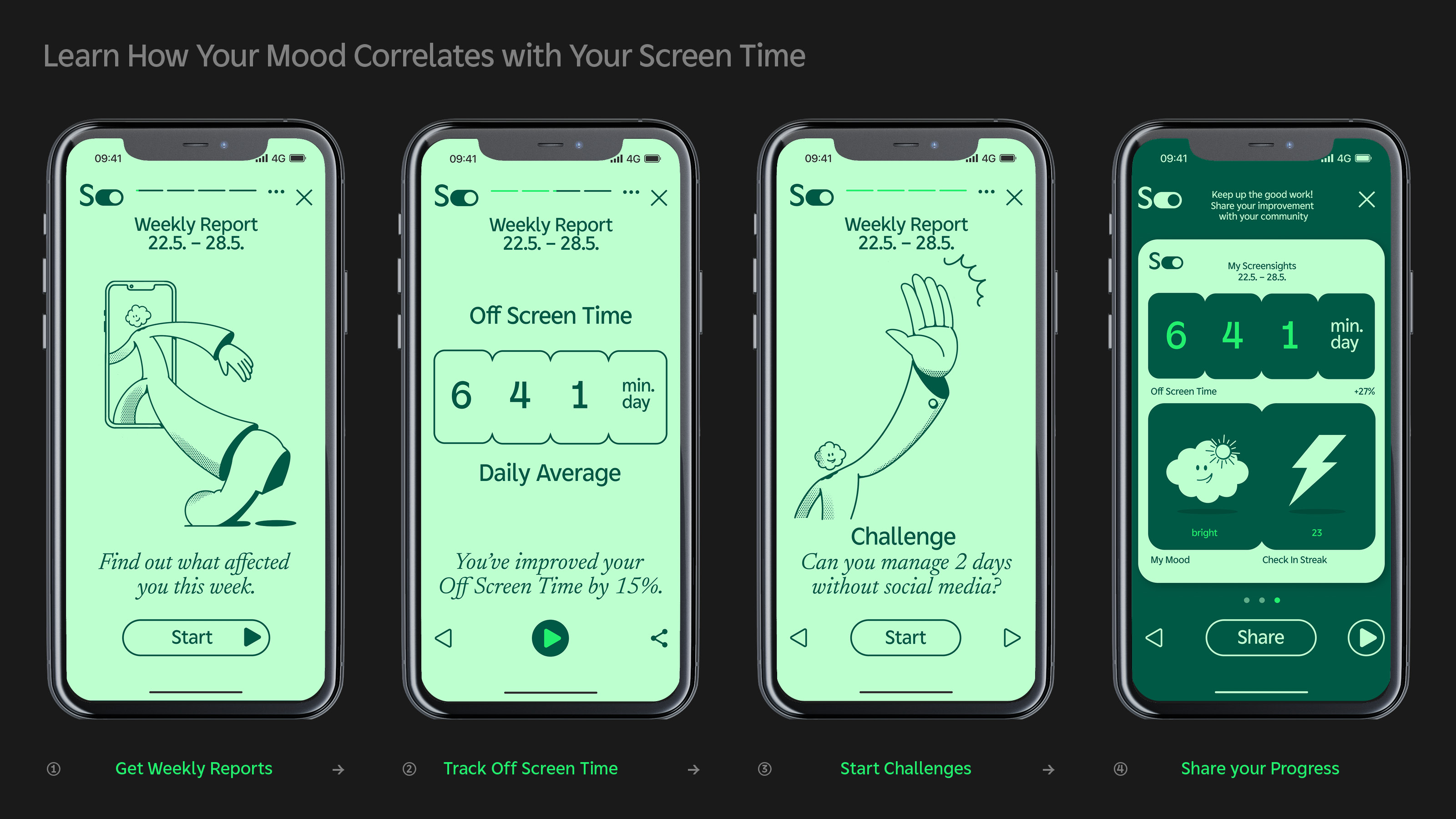 The app’s USP is in the combination of a mood journal and a screentime tracking tool, directly linked to social media consumption. This innovative concept allows for a deep, data-based analysis on the interdependence of online activity and wellbeing – all while remaining highly functional and accessible to it's users.