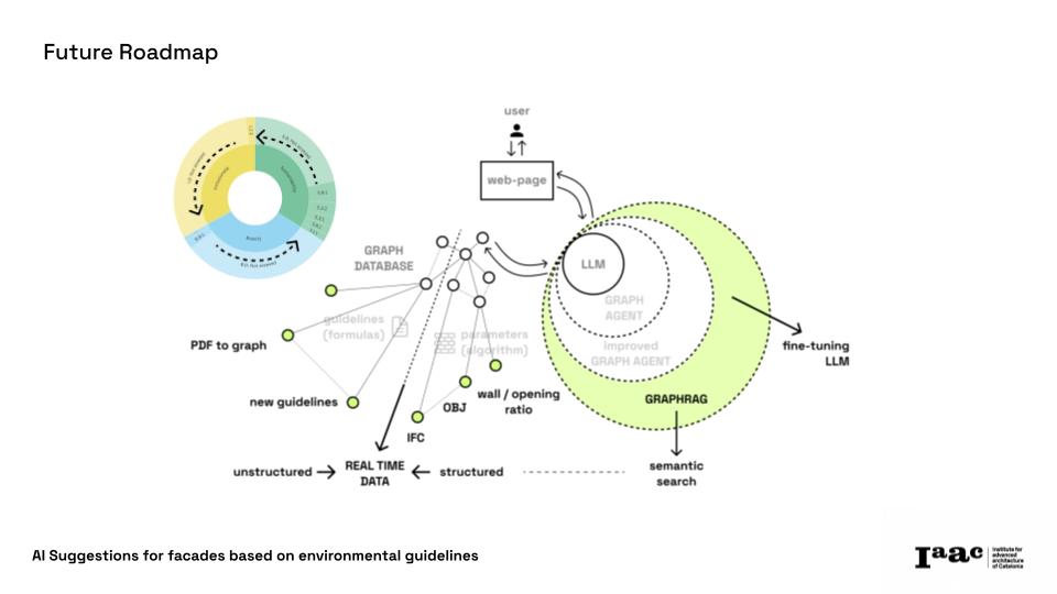 By focusing on façade design—responsible for 17% of NEB’s sustainability impact—the platform optimizes carbon reduction, material efficiency, and energy performance in early design phases, where impact is greatest. It integrates detailed material datasets, including those from the Building Transparency Organization, and employs an advanced graph database to establish semantic relationships between materials, performance metrics, and design criteria.