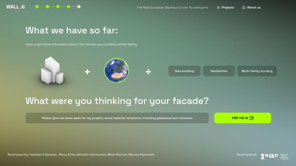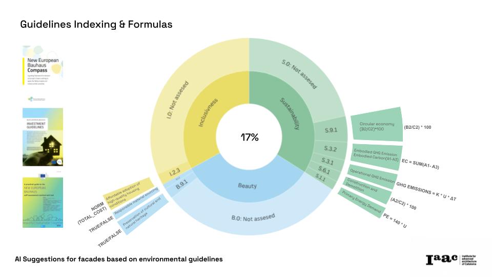 AI Suggestions for Façades Based on Environmental Guidelines is an online platform that helps architects design sustainable facades by providing data-driven material recommendations. Developed at IAAC’s Master in AI for Architecture and the Built Environment, the tool translates New European Bauhaus (NEB) guidelines into a machine-readable format, allowing architects to align projects with sustainability goals.