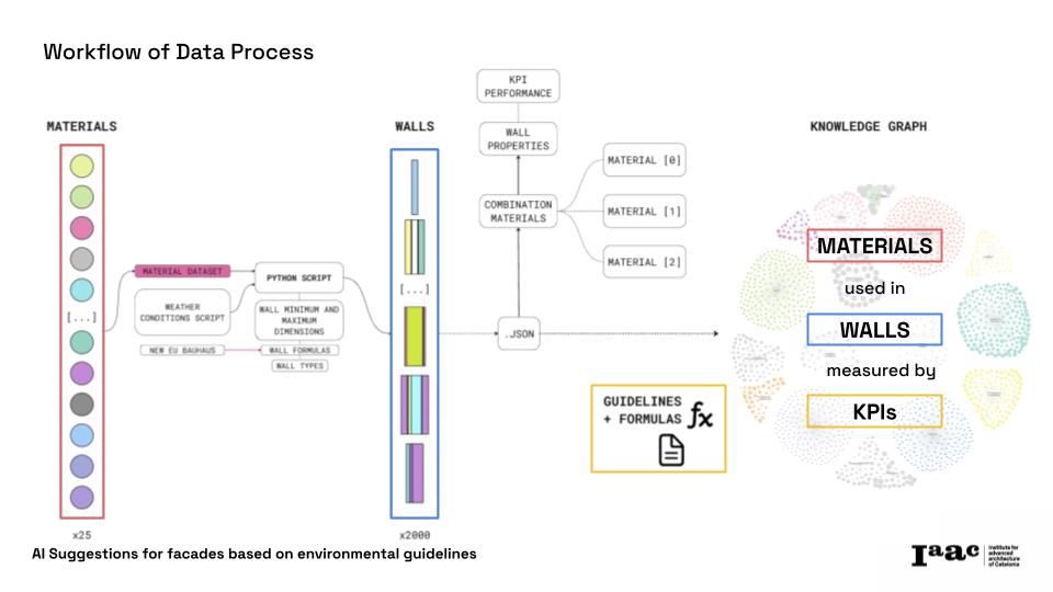 Our project, AI Suggestions for Façades Based on Environmental Guidelines, helps architects make informed, sustainable design choices using a data-driven approach. By combining computational design, machine learning, and knowledge graphs, we optimize façade materials early in the design process, where carbon reduction has the most significant impact. Our methodology follows three structured phases: