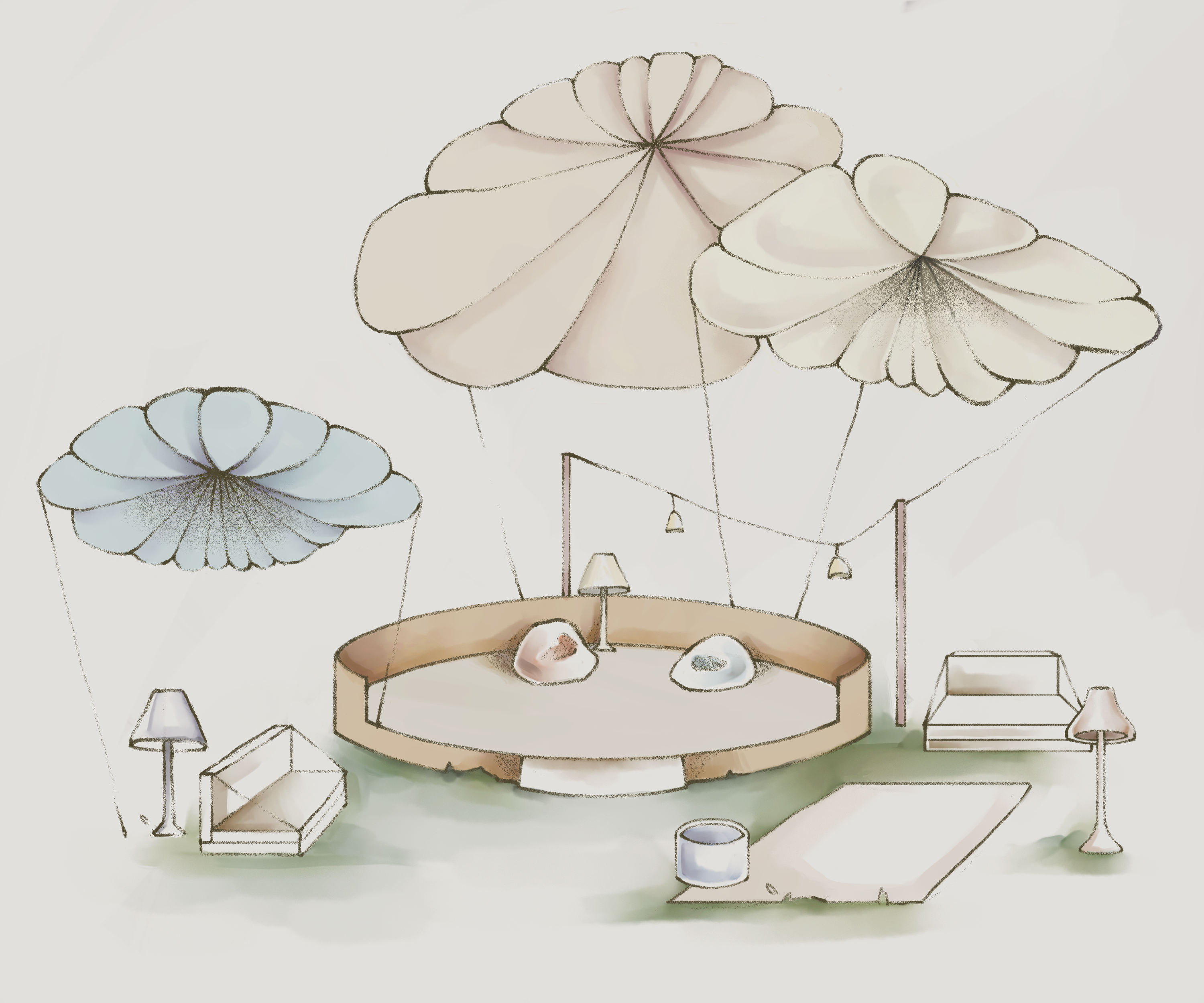 An oval stage is planned for construction in front of the remnants of the castle walls. Large semi-transparent structures, resembling parachutes, will be stretched from the stage across the surrounding area, providing shade and creating a cozy atmosphere while adding brightness and originality to the space. Lamps with repurposed lampshades will be installed throughout the area, offering a soft, warm glow in the evening. Relaxation zones near the stage will feature garden chairs, wicker furniture, or soft poufs.