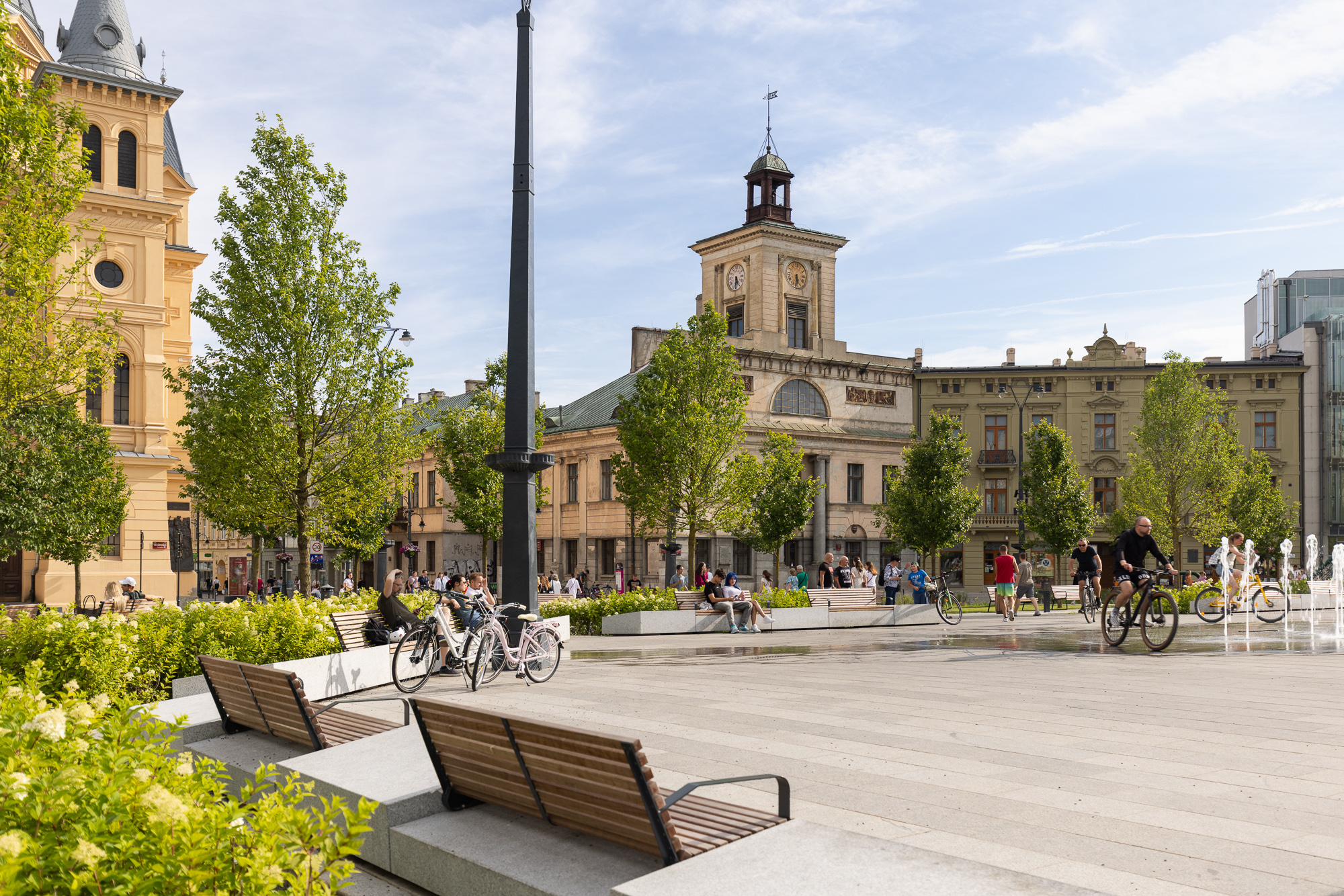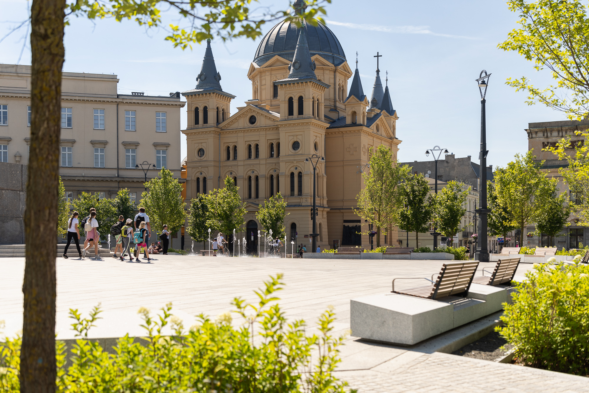 The redevelopment of Freedom Square in Łódź aimed to restore the historical significance and social functionality of one of the city's most iconic public spaces. Once dominated by tram tracks and vehicular traffic, the square was transformed into a vibrant, pedestrian-friendly area that enhances urban life. The comprehensive redevelopment, completed in the spring of 2024 under the Łódź Area Revitalization Program, introduced 64 trees, rain gardens, and permeable surfaces reducing the urban heat island effect. The square now includes dedicated areas for recreation, relaxation, and cultural events, making it accessible and welcoming to all demographic groups, including children, seniors, and individuals with mobility challenges. The target groups of the project include Łódź residents, visitors, and local businesses, who benefit from a revitalized urban center that fosters social interactions and improves quality of life. Specific objectives included increasing the biologically active area, promoting sustainability through innovative water management systems, and preserving the historical character of the space. The redevelopment of Freedom Square also shifted the focal point of Łódź’s city center, integrating areas that were previously fragmented into isolated pockets. By enhancing pedestrian connectivity between these spaces, the project has transformed the movement dynamics of residents, encouraging sustainable, active mobility. This seamless integration fosters a more cohesive urban experience, where walking and cycling become natural choices, reducing reliance on vehicular transport and promoting a healthier, more connected city life. The square now hosts cultural events, encourages everyday activities, and serves as a platform for community interactions. This project harmoniously combines historical preservation with modern urban sustainability principles, establishing Square as a model of sustainable urban regeneration.