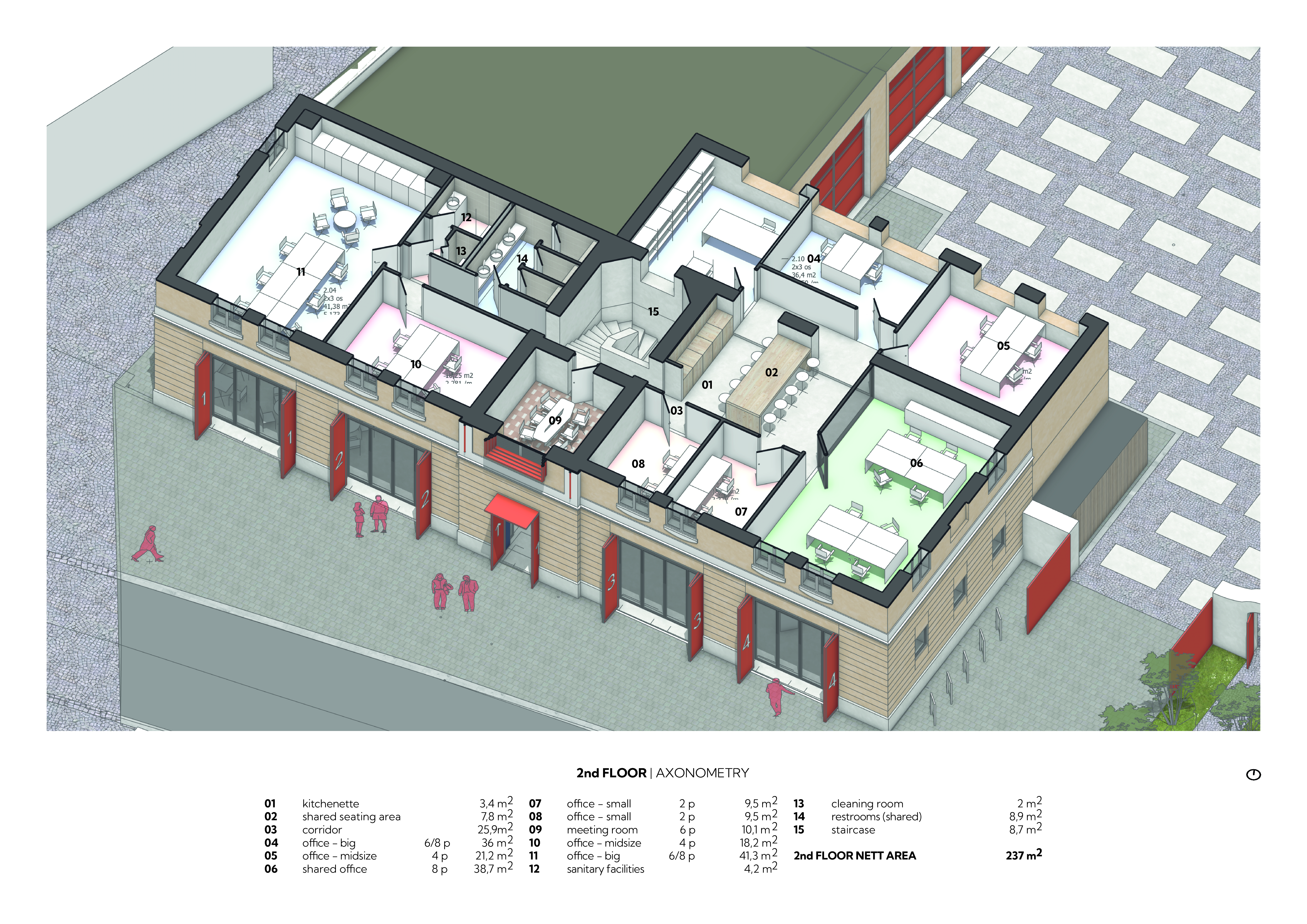 • Ground Floor: The gastro operation, multifunctional hall, and exhibition space are highly accessible to the public. The gastro operation serves as a social hub where residents and visitors naturally meet, while the multifunctional hall hosts community events, workshops, and pop-up gatherings that draw diverse audiences. The exhibition space provides a dynamic platform for local artists and cultural projects, inviting dialogue and creative expression.