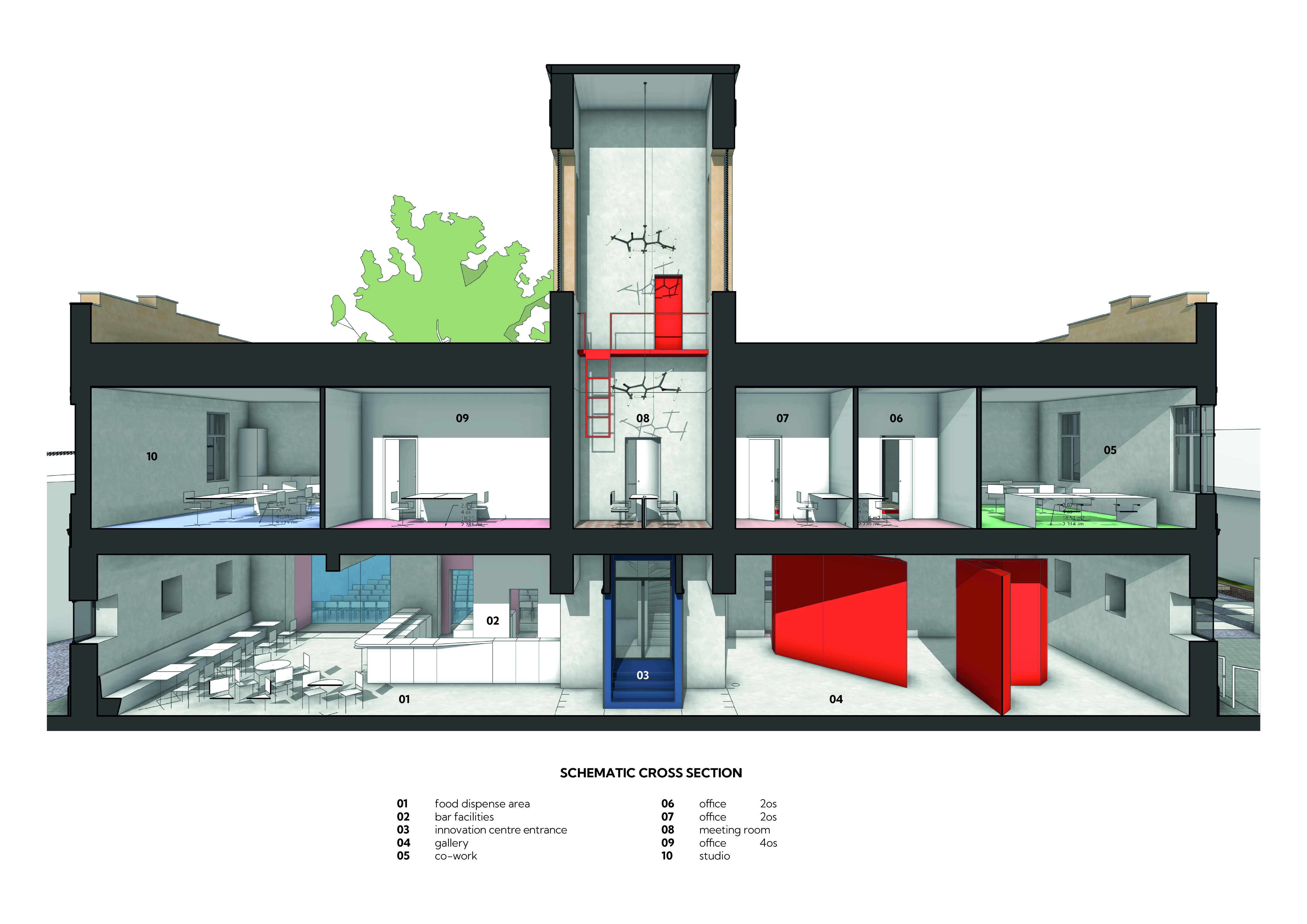 • First Floor: Offices, coworking spaces, and meeting rooms are dedicated to creative professionals and micro-businesses. These spaces facilitate planned interactions through networking sessions, brainstorming workshops, and collaborative meetings, enabling participants to exchange ideas, forge partnerships, and work on joint projects. The space is also designed to accommodate national institutions, NGOs, and universities, further enhancing collaborative opportunities.