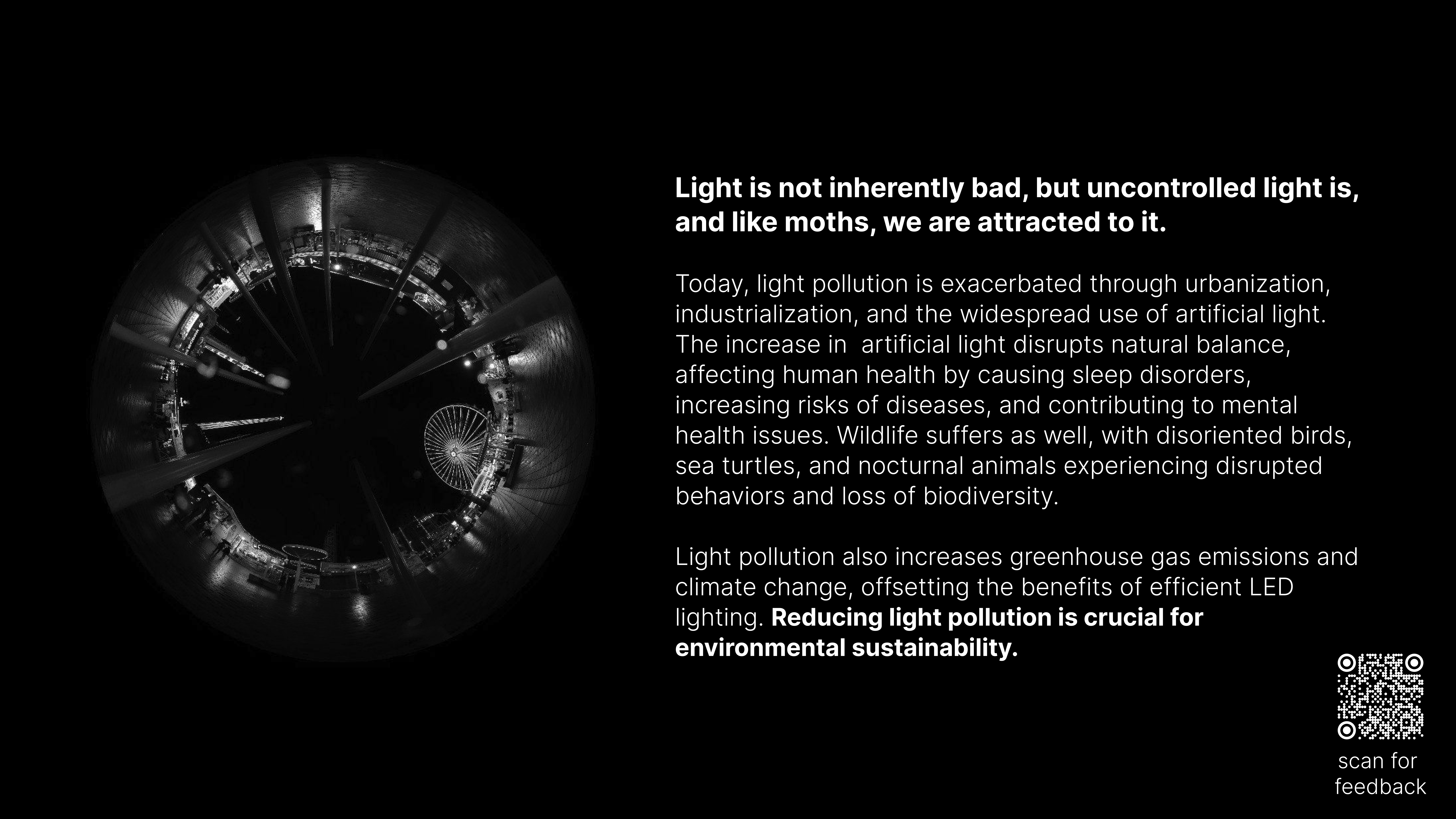 Going Dark actively engaged diverse participants across multiple locations, gathering feedback during both prototype and implementation phases to ensure a broad range of perspectives. Participants offered valuable insights into public awareness of light pollution and their willingness to take action. This feedback serves as a benchmark for understanding awareness levels and informs future iterations of the project, which could shape how urban lighting policies might evolve. The installation encouraged participants to assess responsible outdoor lighting through practical exercises, prompting them to observe and evaluate local lighting practices. It provided links to resources for reporting lighting issues and contributing to ordinance enforcement, as well as directing visitors to the Artificial Light at Night Database for further reading. These tools helped translate awareness into tangible, science-backed solutions for reducing light pollution in their own environments.