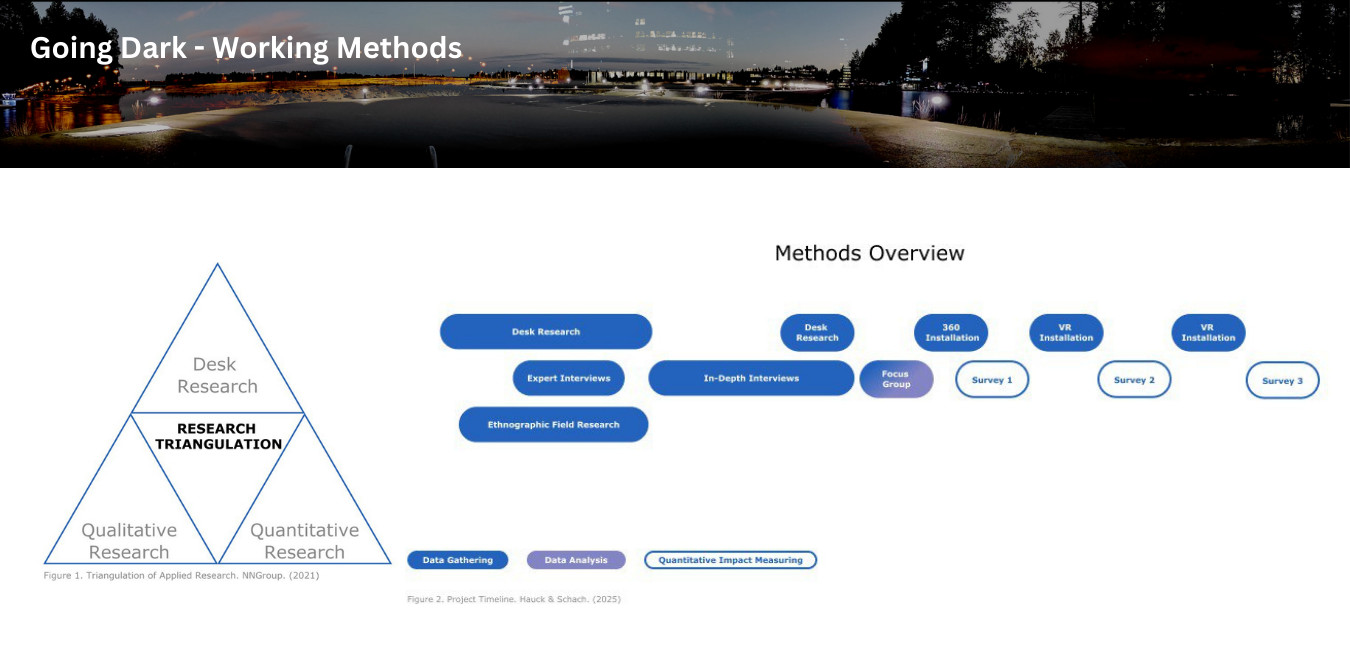 The development of Going Dark was rooted in artistic and transformative research methods, combining experiential installation design with community-based approaches. This artistic research sought to communicate the issue of light pollution in a way that was both engaging and accessible. In addition to this, the project employed triangulation as a guiding principle, utilizing multiple research methods to ensure a comprehensive understanding of public perceptions and engagement with the topic.