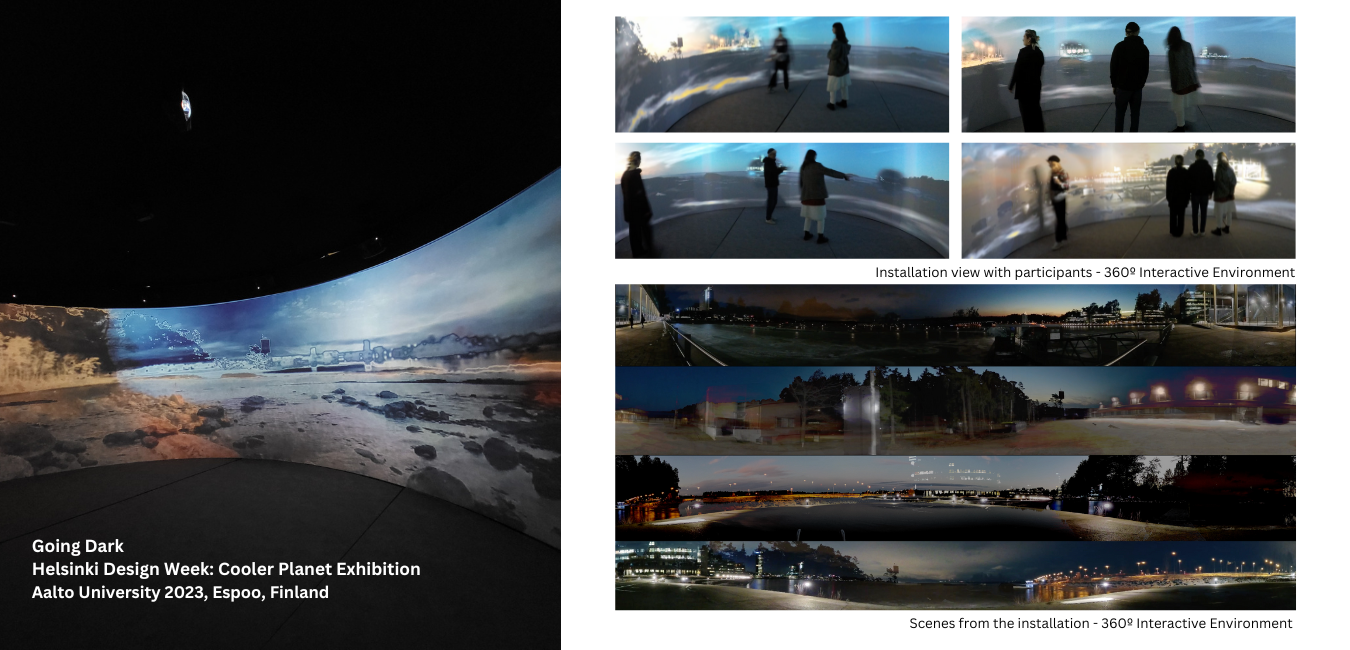 Going Dark is a system of interactive installations designed to raise awareness about the negative impacts of light pollution in urban centers. The installation features two formats; a 360º immersive audiovisual display and a virtual reality experience. Footage captured from the Helsinki region transitions from urban and rural views of the night sky, highlighting the differences between light polluted areas and a naturally darker sky. Depending where they look and move, participants trigger reactive elements that display information about the harmful effects of light pollution and practical tools for identifying excessive public lighting.