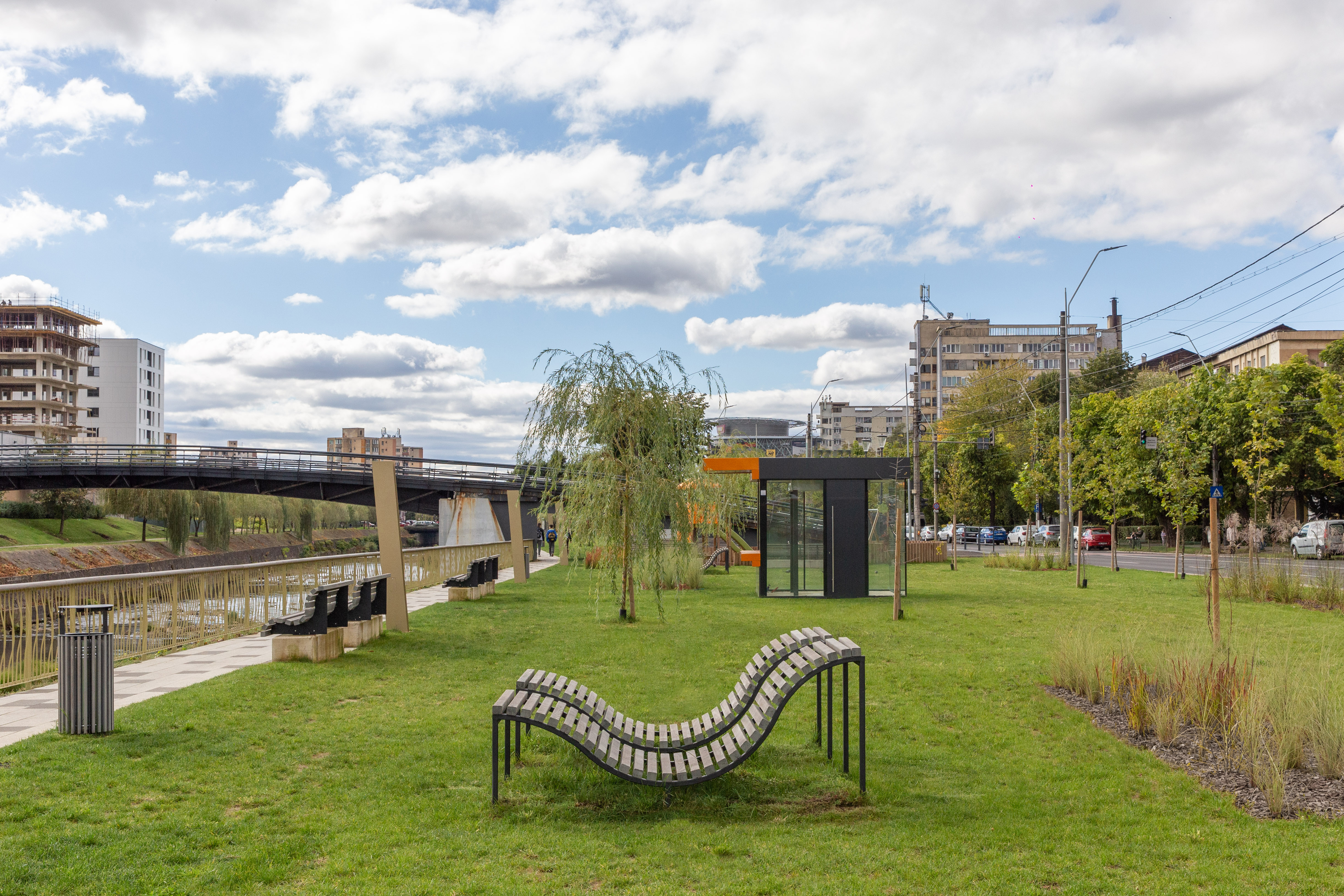 Our project analyzed about 2 km of the river banks, gathered data about movement, accessibility, and landmarks, and developed a global strategy of a model that can be implemented on both riverbanks. The implemented design represents the kernel of future development for the shores. Considering the high value of the context, we can observe that after less than a year, people started to develop an attachment to the place, returning with recurrence and finding new ways to interact with the landscape. Different types of urban furniture are used flexibly (such as relaxing urban sofas, observatory points, spaces for improvising urban dancing, etc.). The entire project can be replicated along the river based on our model. The handrail is a soft intervention topped with natural wood that offers promenade support and character. The broad handrail attracts citizens to stay and contemplate the waterfronts using friendly materials, shapes, and colors. The sinus benches became an instant attractor because of the possibility of using them in different ways, but also because the idea of scattering them in the landscape, in the middle of planted space, and under trees played an essential part in making them attractive.