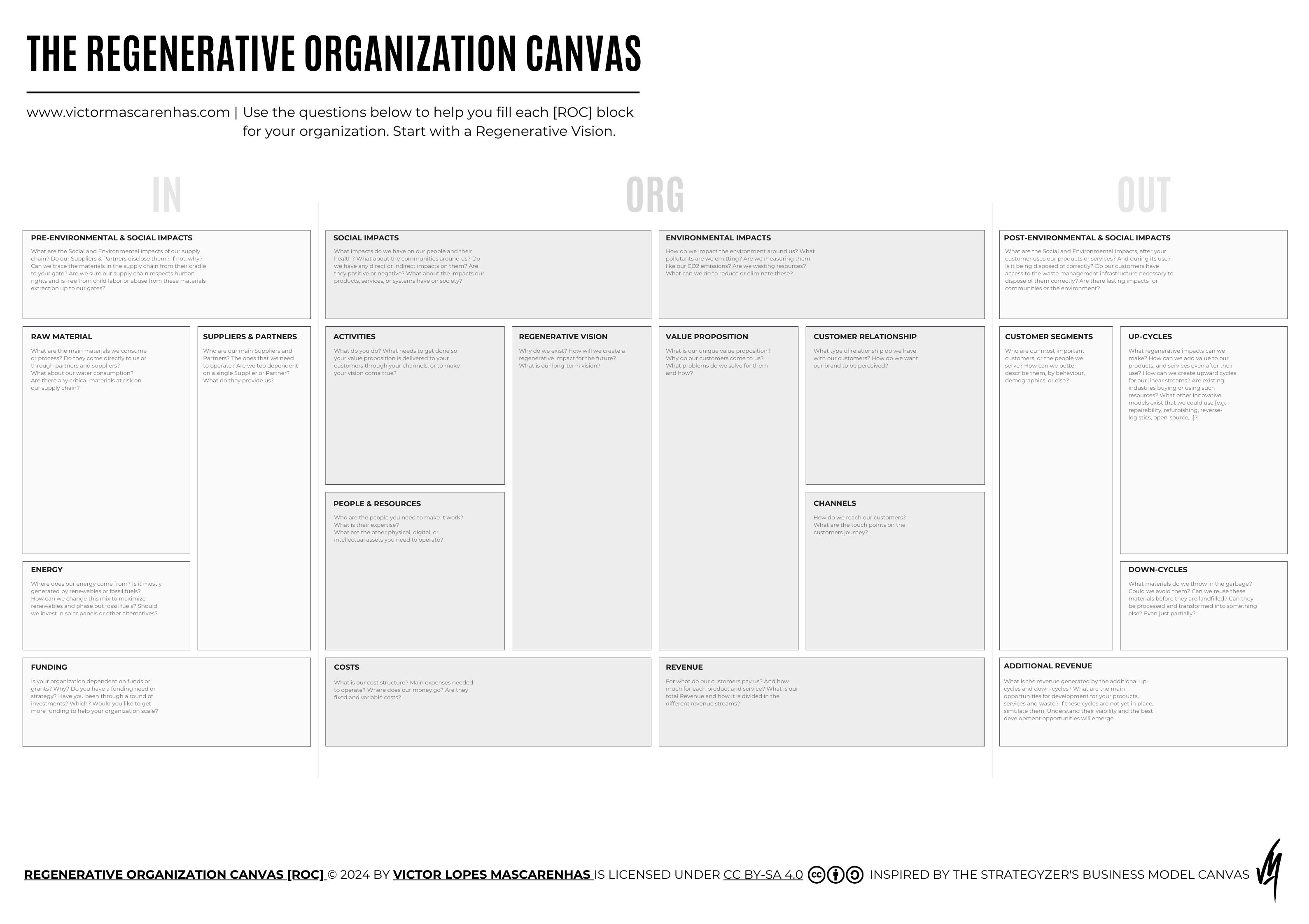 The Regenerative Organization Canvas [ROC] is a strategic framework that transforms traditional business models into regenerative systems. Moving beyond conventional sustainability, it helps organizations maximize positive impact through optimized resource flows and ecosystem relationships.