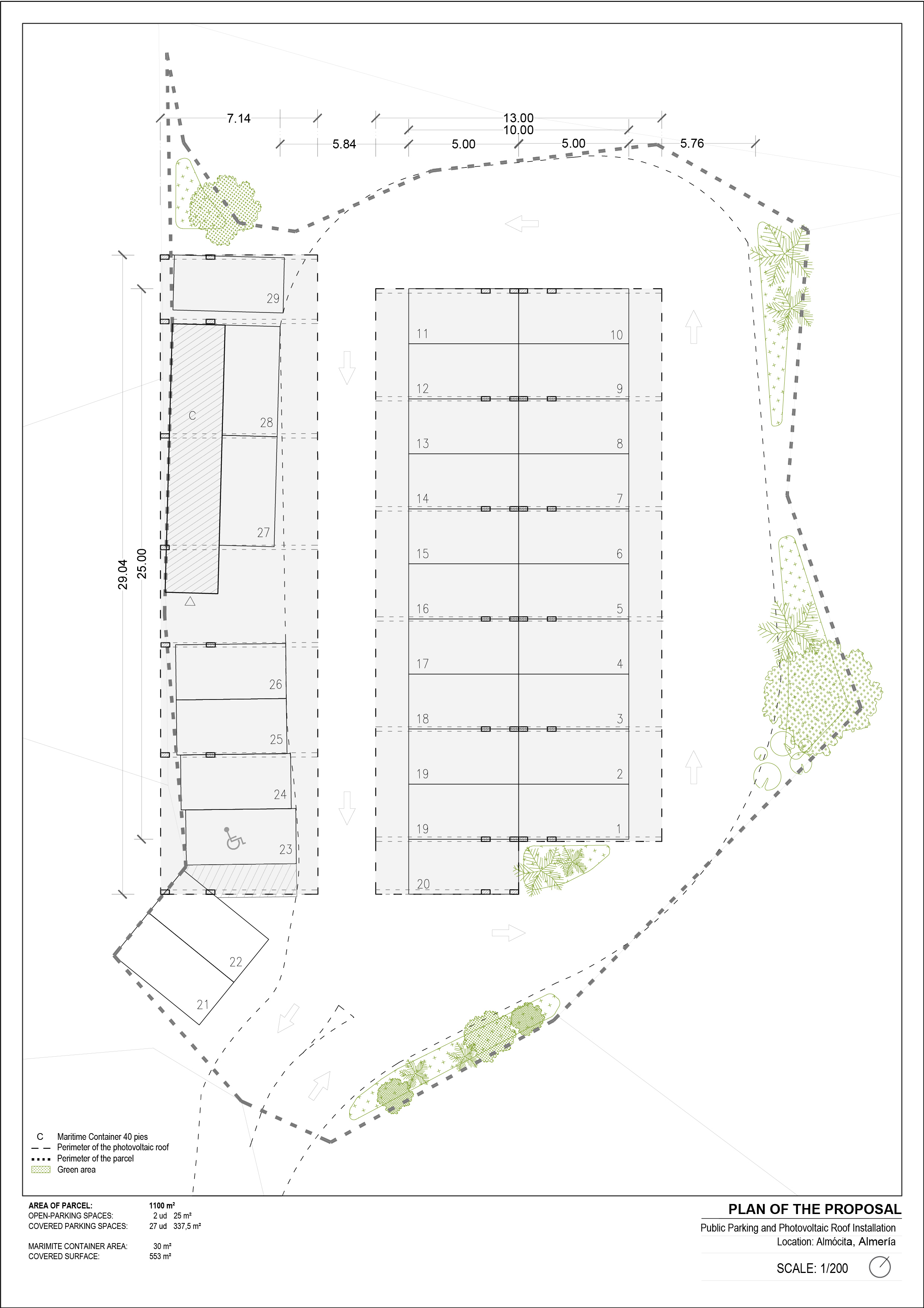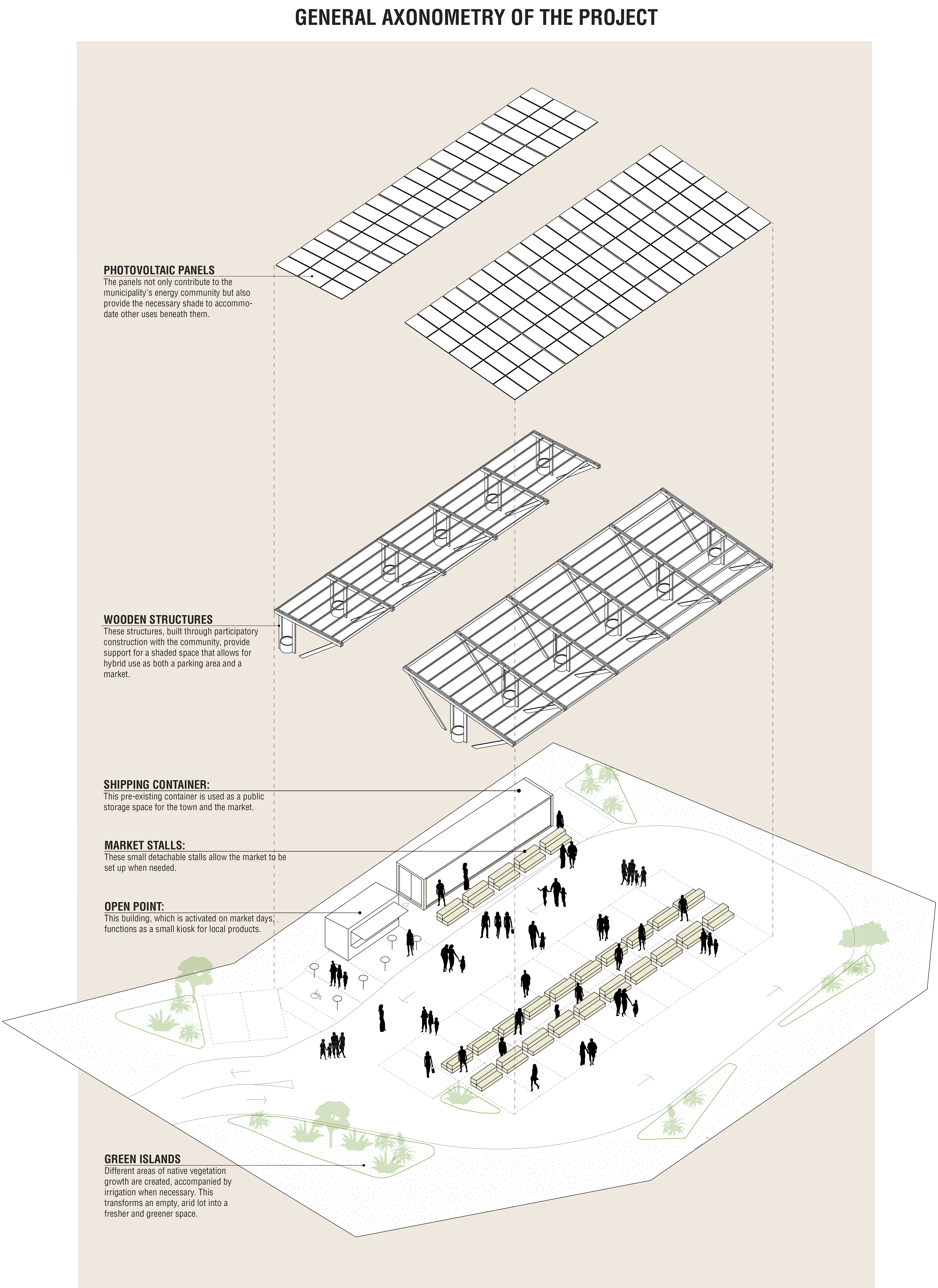 The design incorporates vegetation to improve the area’s aesthetics and lower the temperatures. Along with that, the solar panel structure will provide a shaded area, offering relief from the sun while generating clean energy, making the space both practical and enjoyable. We are located in southern Spain, in an area at the frontline of desertification, where intense solar radiation makes shaded spaces essential for comfort and usability.