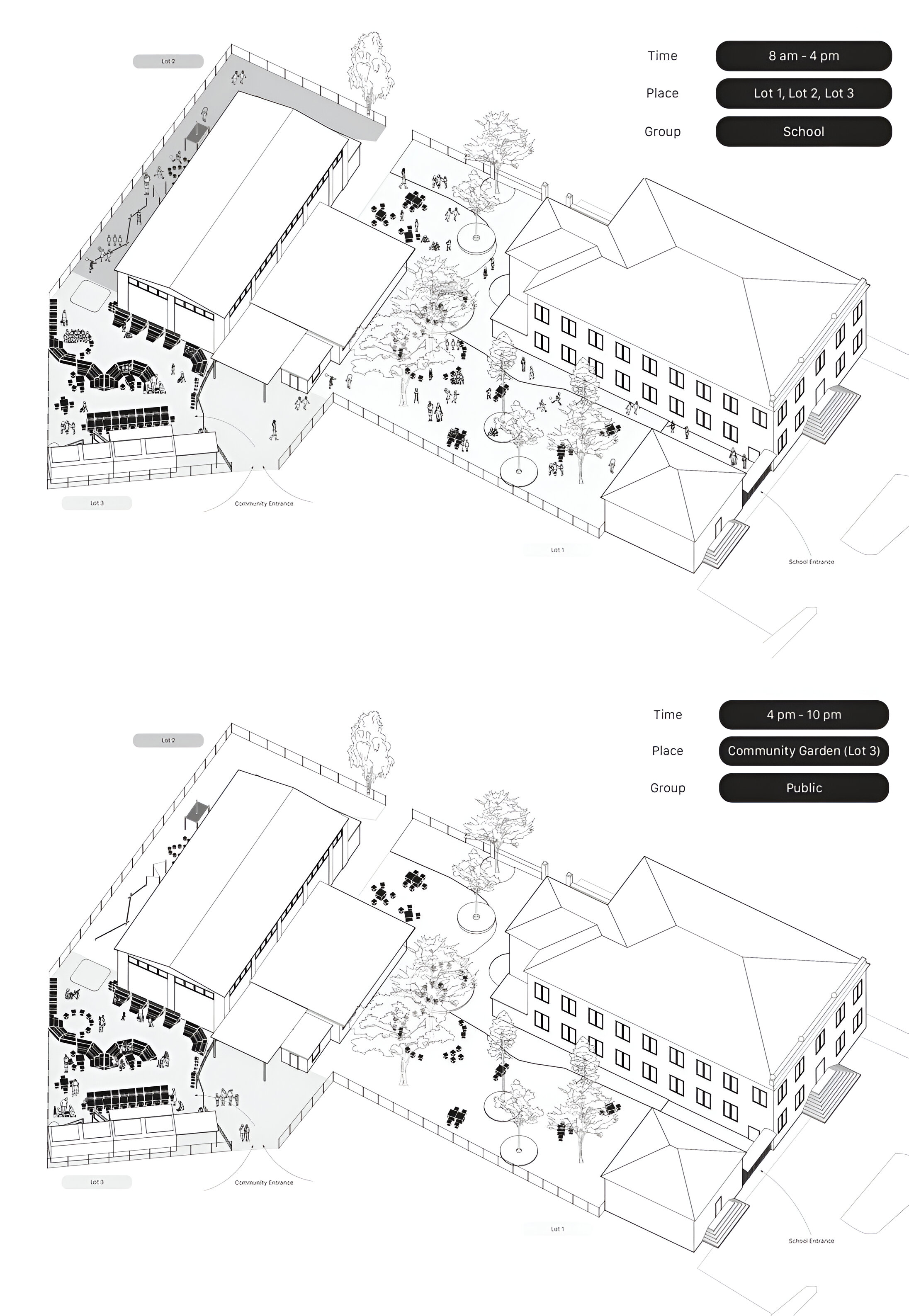 "School of Collective Care" reimagines a secondary school courtyard as a dynamic space for learning, play, and community life. Starting with a re-design that offers students a brand-new open area, the project extends beyond the school gates. A shared orchard invites locals to care for nature, while a dedicated space hosts community-led events, strengthening social ties. More than a schoolyard, it’s a place where education, sustainability, and collective belonging come to life.