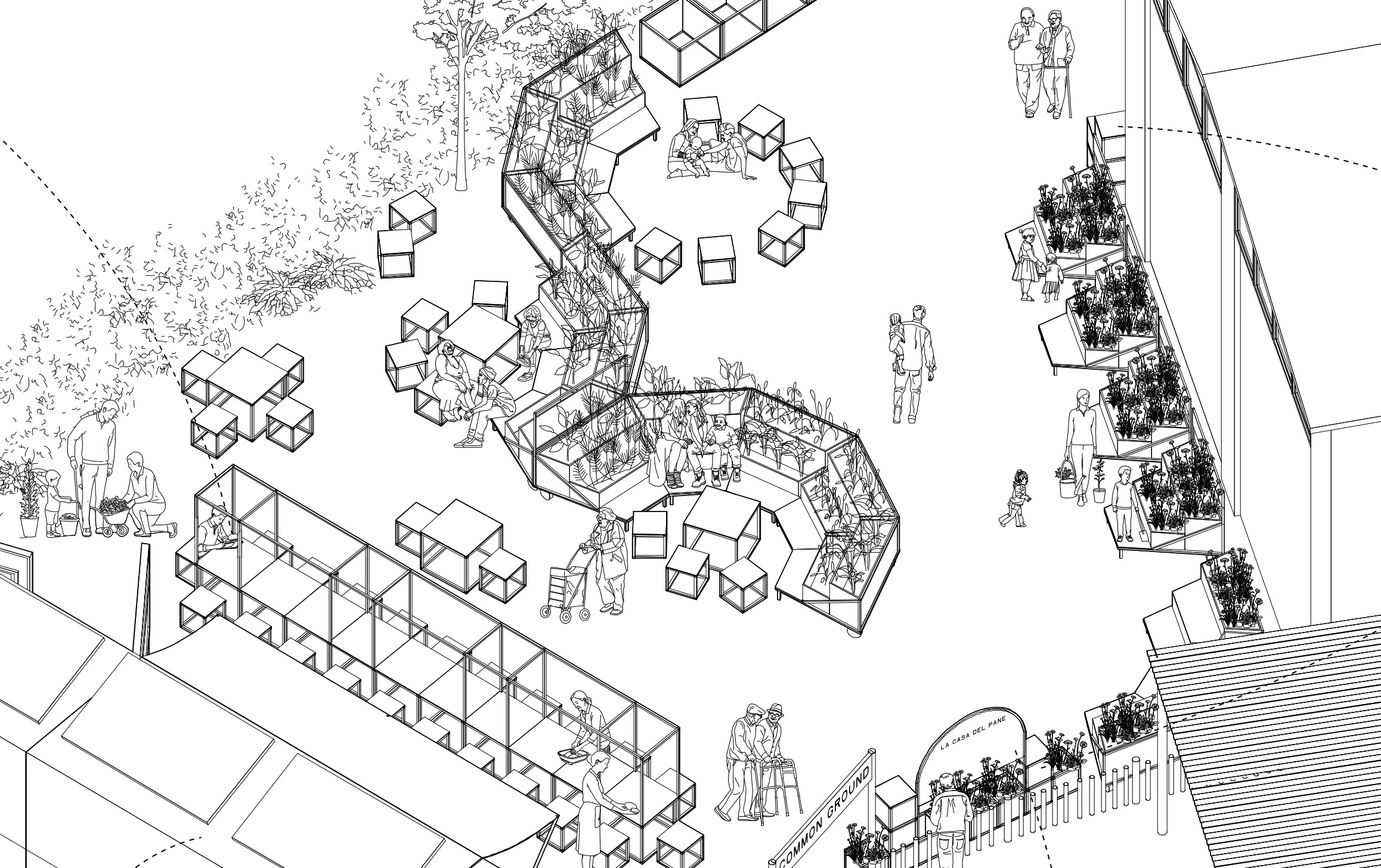 A key component of Lot 3 is the adaptive reuse of two repurposed containers, transformed into a Baking Home ("La Casa del Pane") and a community kitchen. These modular structures reduce material waste and embodied carbon while incorporating passive cooling and natural ventilation ensuring energy efficiency. Designed as a hub for food literacy and low-tech sustainable practices, they encourage hands-on climate education, where students and citizens engage in activities that enable low-impact living and climate responsible resource management.