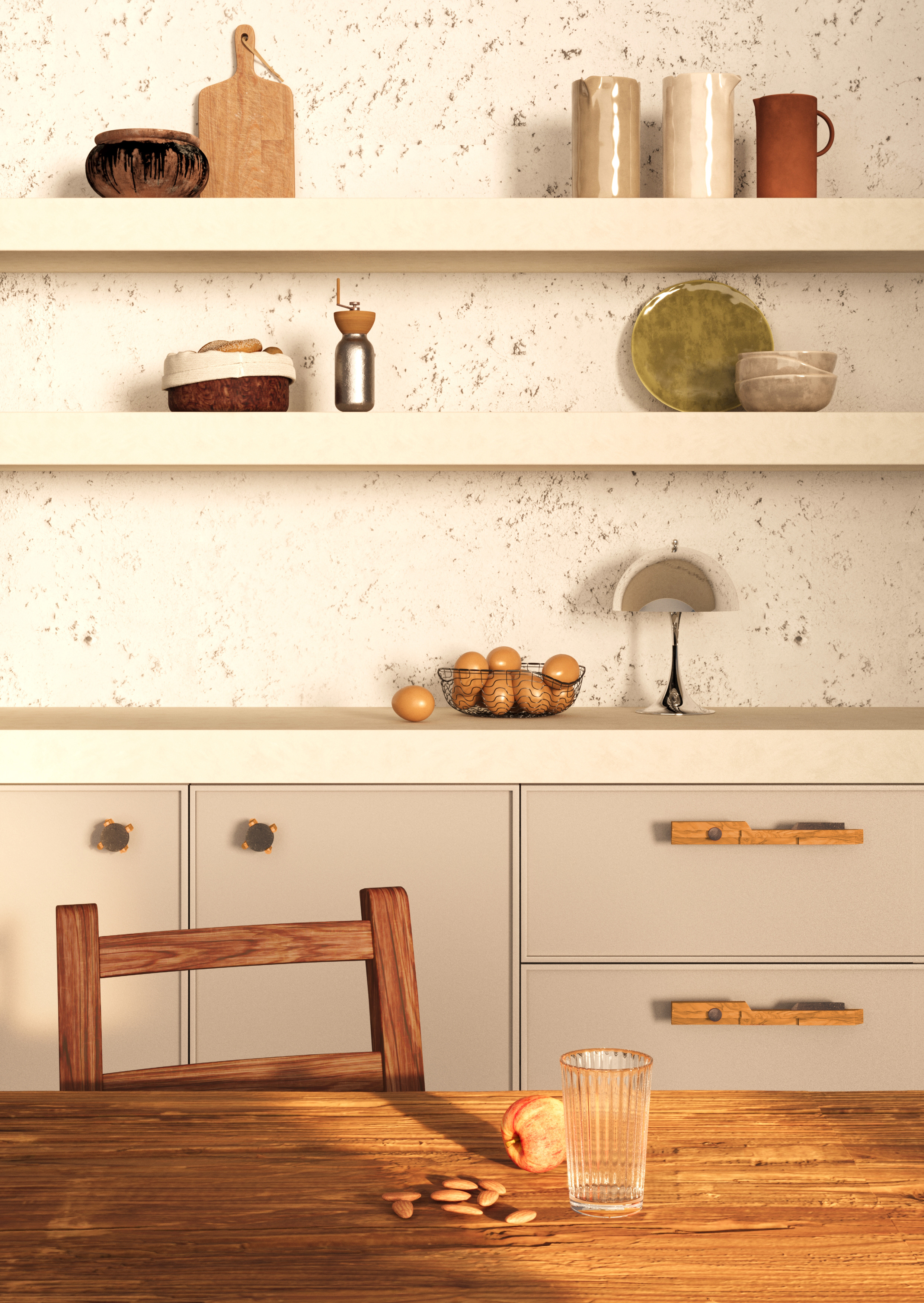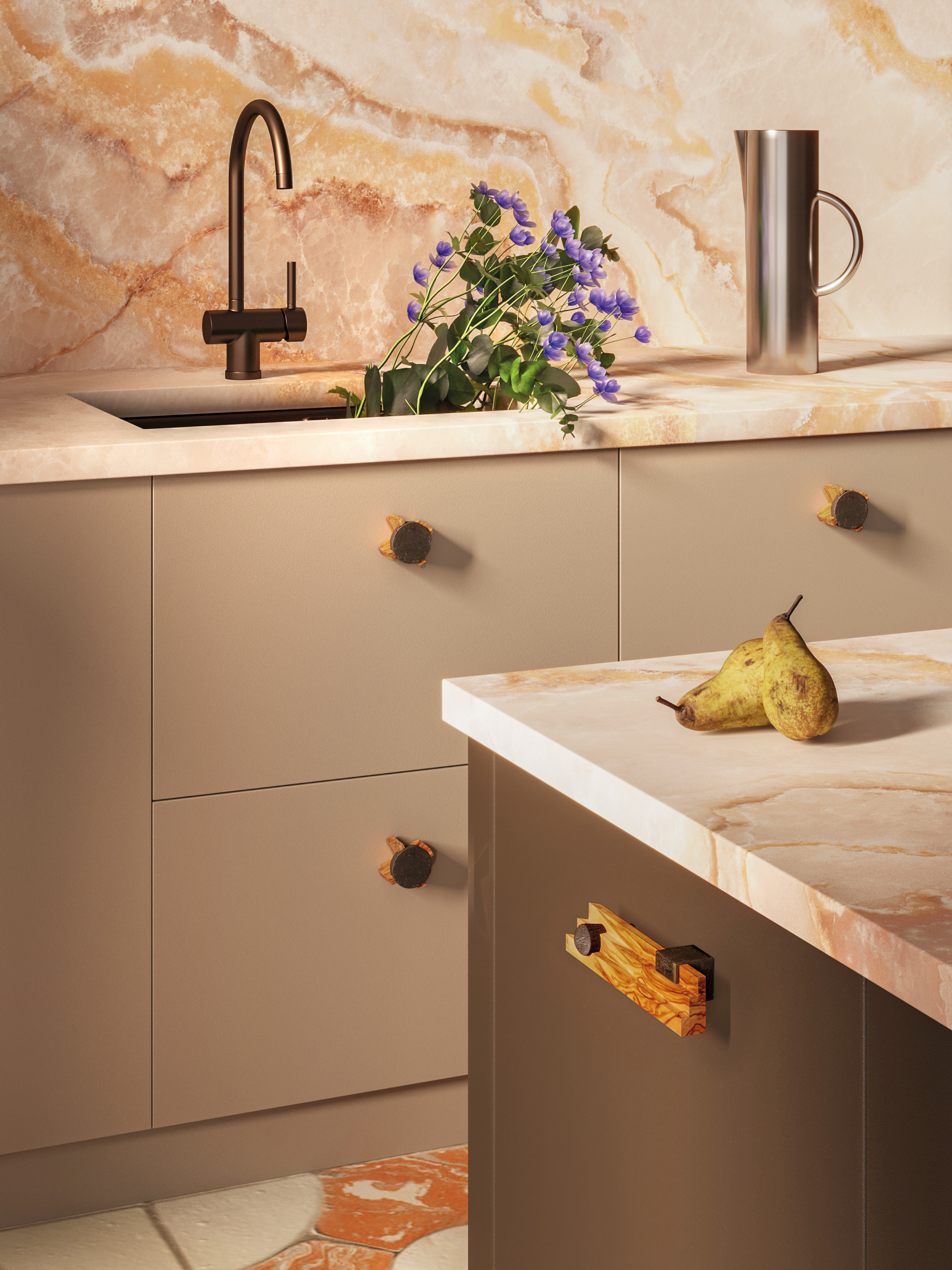 A key aesthetic feature is the interplay between materials. The ceramic inserts come in two variations: raw, unglazed ceramic: A deep, stone-like texture that contrasts with the smooth olive wood. And secondly, glazed ceramic: a polished finish in various colors, offering a refined, adaptable design. This material contrast transforms handles into sculptural elements, enriching furniture with depth and character.