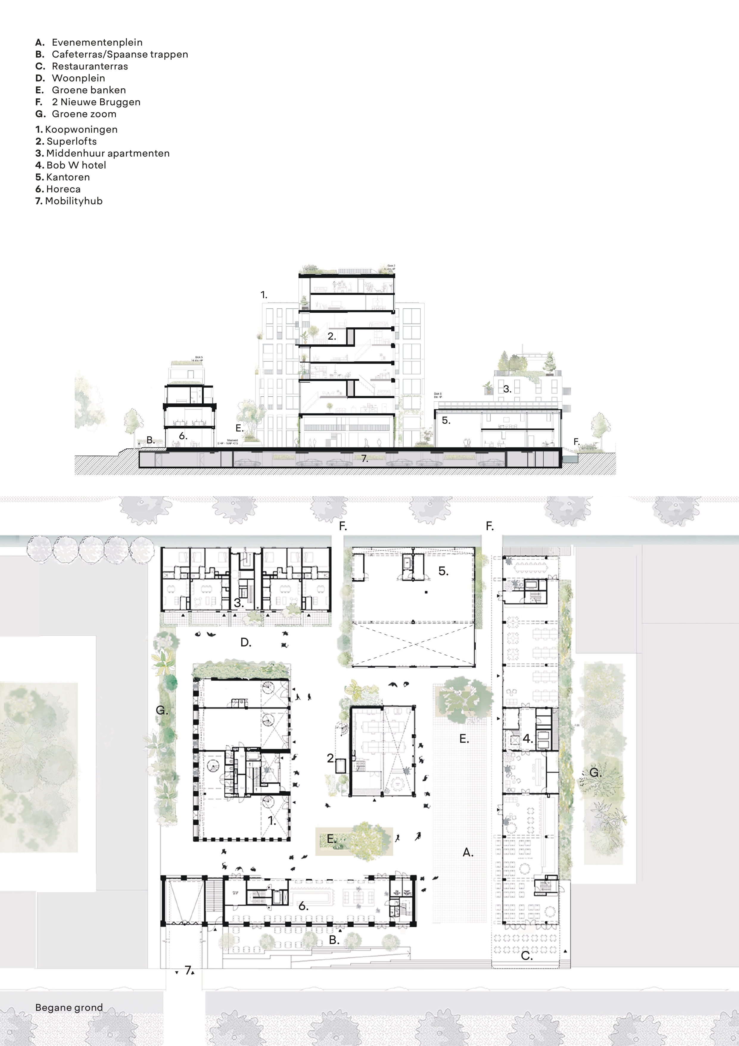 Inclusion and accessibility are at the core of Republica’s design, promoting social cohesion, safety, and equitable access for all users. The car-free super block enhances livability and social interaction by prioritizing pedestrian spaces and shared public areas. The ground level remains open and vibrant, with all technical functions—such as parking, bike storage, waste separation, and logistics—concealed in a semi-underground garage, ensuring the streetscape is welcoming and accessible from all sides also by making two extra bridges.