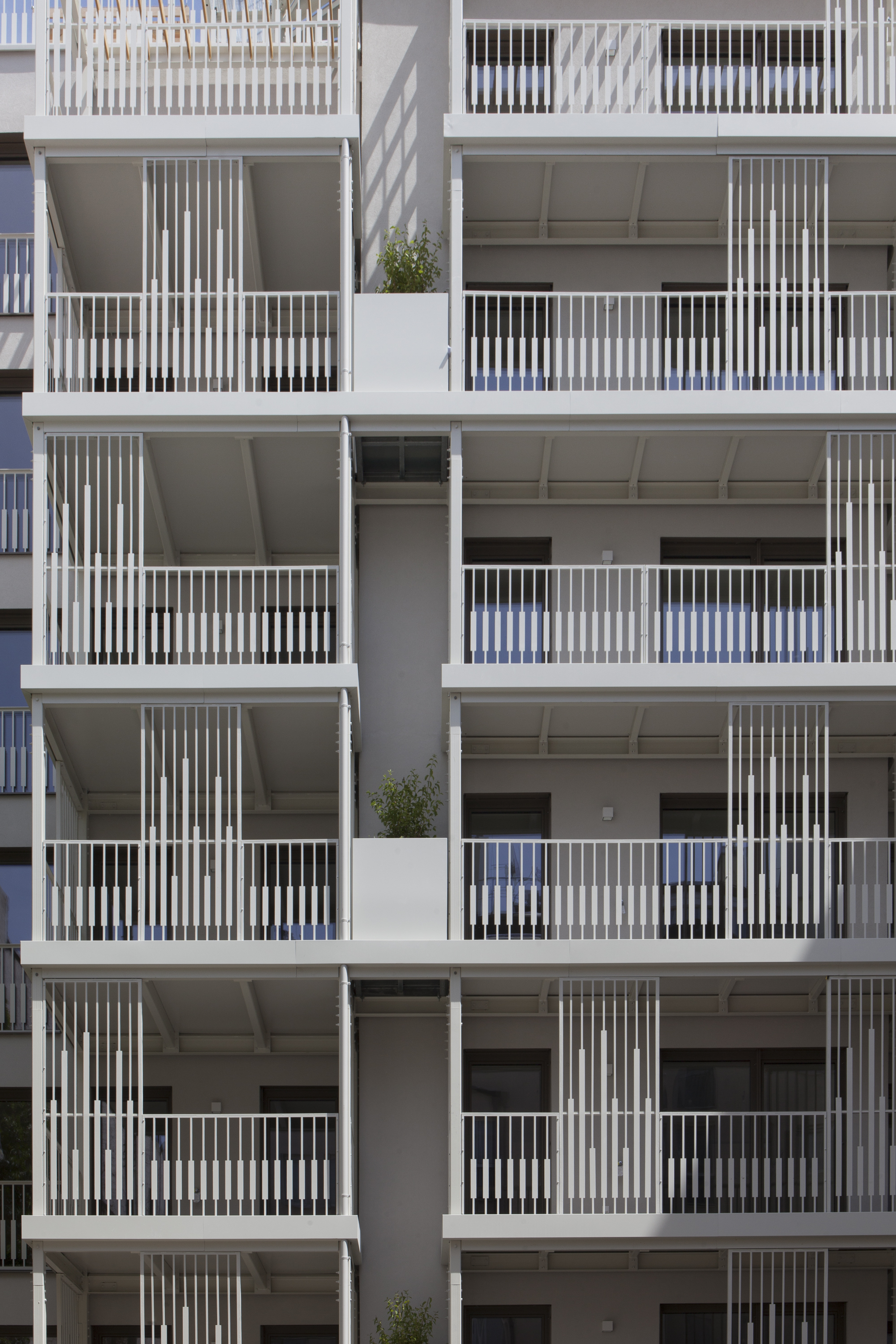 When designing the street-side façade, special consideration was given to the appearance of the building and the color and materiality of the neighboring buildings were considered. Light gray clinker brick slips, alternating horizontally and vertically with the floor boundaries, give the front facade of the building a classically structured appearance. The street image inspired the color of the dark window frames. Two high-quality apartments with a two-storey terrace are now located on the top floor instead of the old pitched roof. For a building from the 1990s, the house had a generously wide staircase, which was retained and equipped with an elegant gray stone floor and wooden handrails. The existing room height of 2.70 m was also retained and is a bonus for the new residents. Most of the 24 apartments open to both sides of the building. This allows air ventilation and provides additional outdoor space in form of balconies and small terraces. Creating additional outdoor space was an important concern for the architects. The view to the outside and the ability to open the apartment not only increase the standard of living, but also visually enlarge the apartment. The courtyard-facing terraces are possible due to steel shelves in front with graphically structured metal railings. The north-facing courtyard features large windows. The existing rear building can be accessed through the spacious inner courtyard, which is equipped with play equipment and a sandpit.