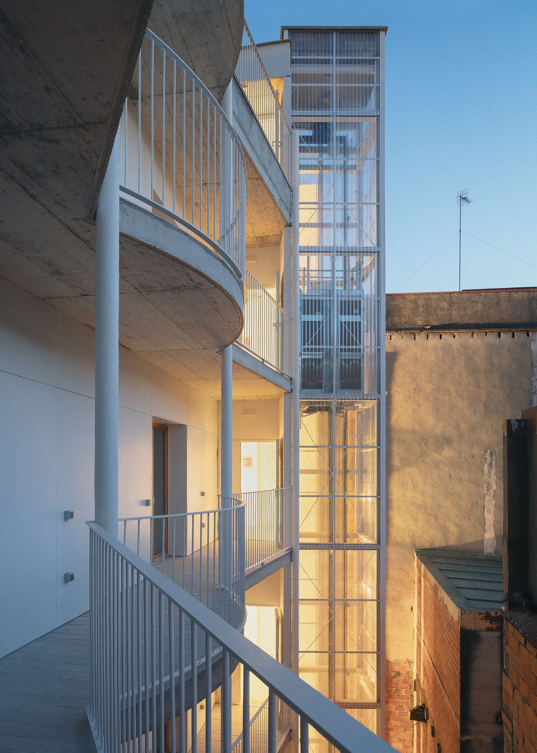 The building was not required to include parking facilities. After lengthy discussions with municipal technicians, a precedent was set in the La Borda project that led to a change in local regulations. Now, public housing buildings with an A energy rating that can demonstrate no need for parking are exempt from constructing it. This recognizes both the shift in mobility models and the high environment costs associated to underground construction.