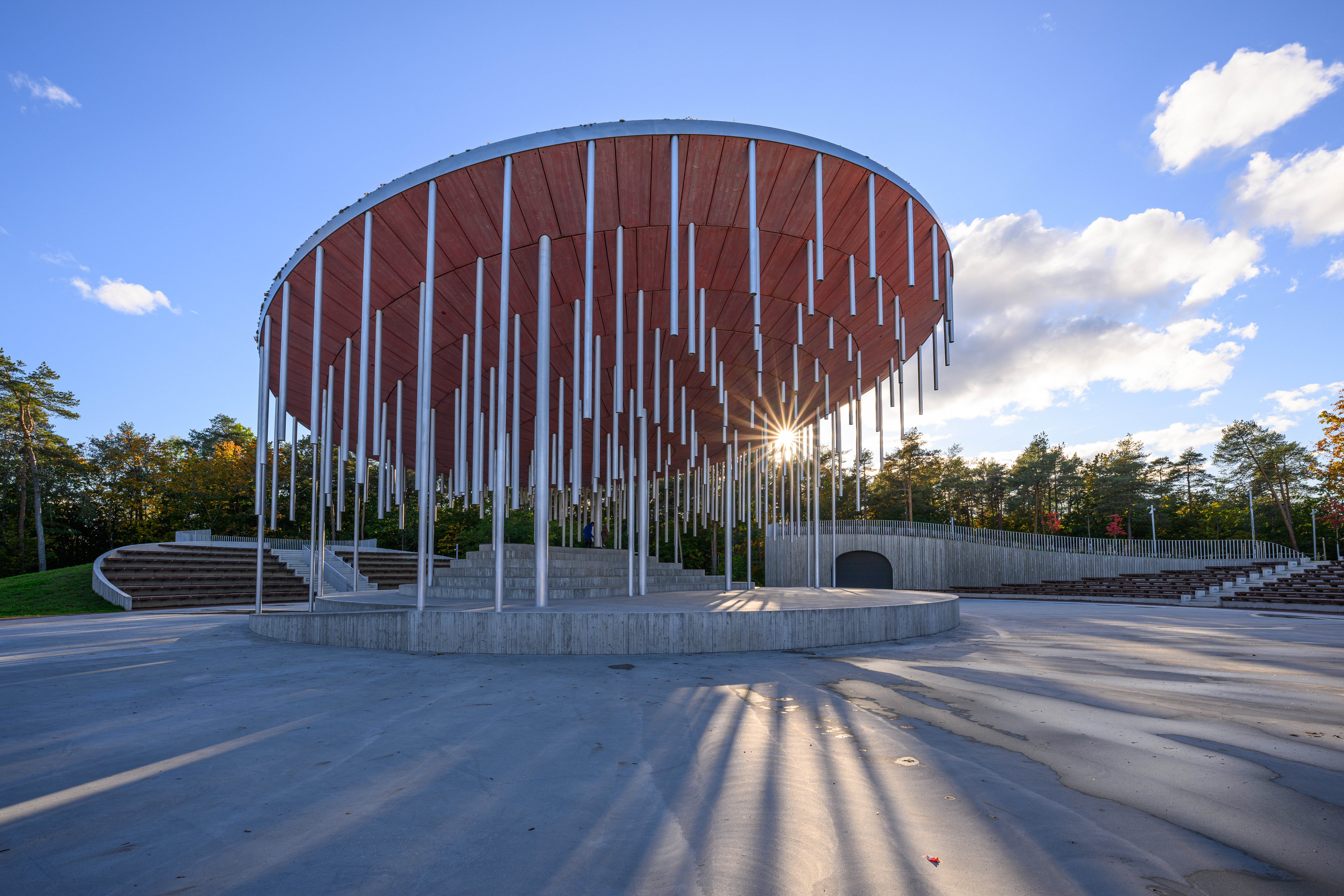 A public landscape architecture competition was held in the second half of 2020 to find the best solution for public space. Song festival grounds now stands as an instantly recognizable work of art built with diligence and attention to detail. Water-permeable innovative paving materials (Ecogrus) are used to lessen the effects of rain during summer events as well as the strain on public rainwater drainage system. Bamboo seating is expected to be peasant to sit on for decades to come. Flowering fields around seating areas have been designed to provide constant flourishing through vegetation period. But several years of weeding and sowing are needed to achieve a long lasting and biodiverse and low maintenance environment.