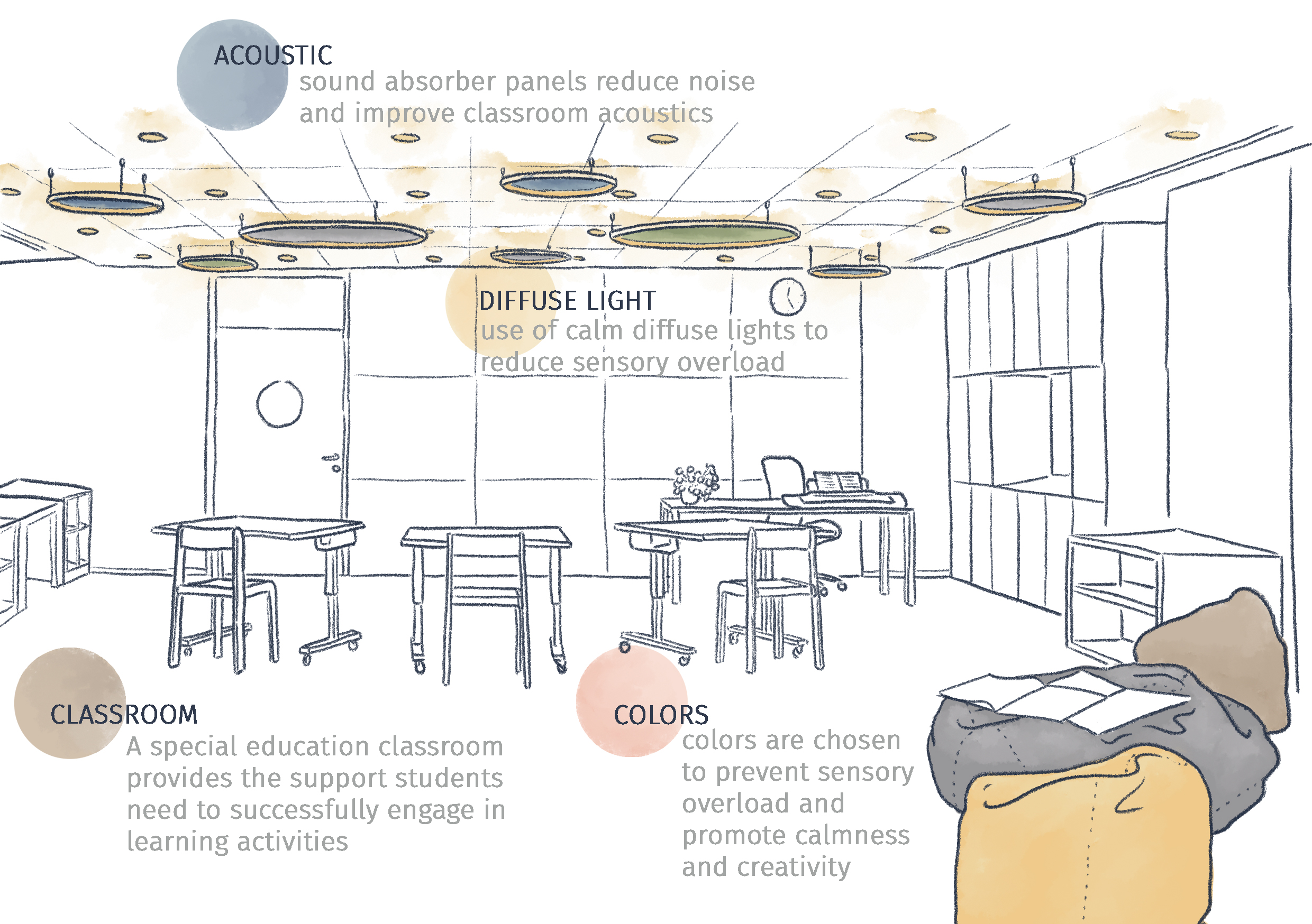 By addressing physical, sensory, and social needs, the design creates adaptable, supportive spaces that prioritize inclusion. This project serves as a model for human-centered design, providing a learning environment where all children can thrive.