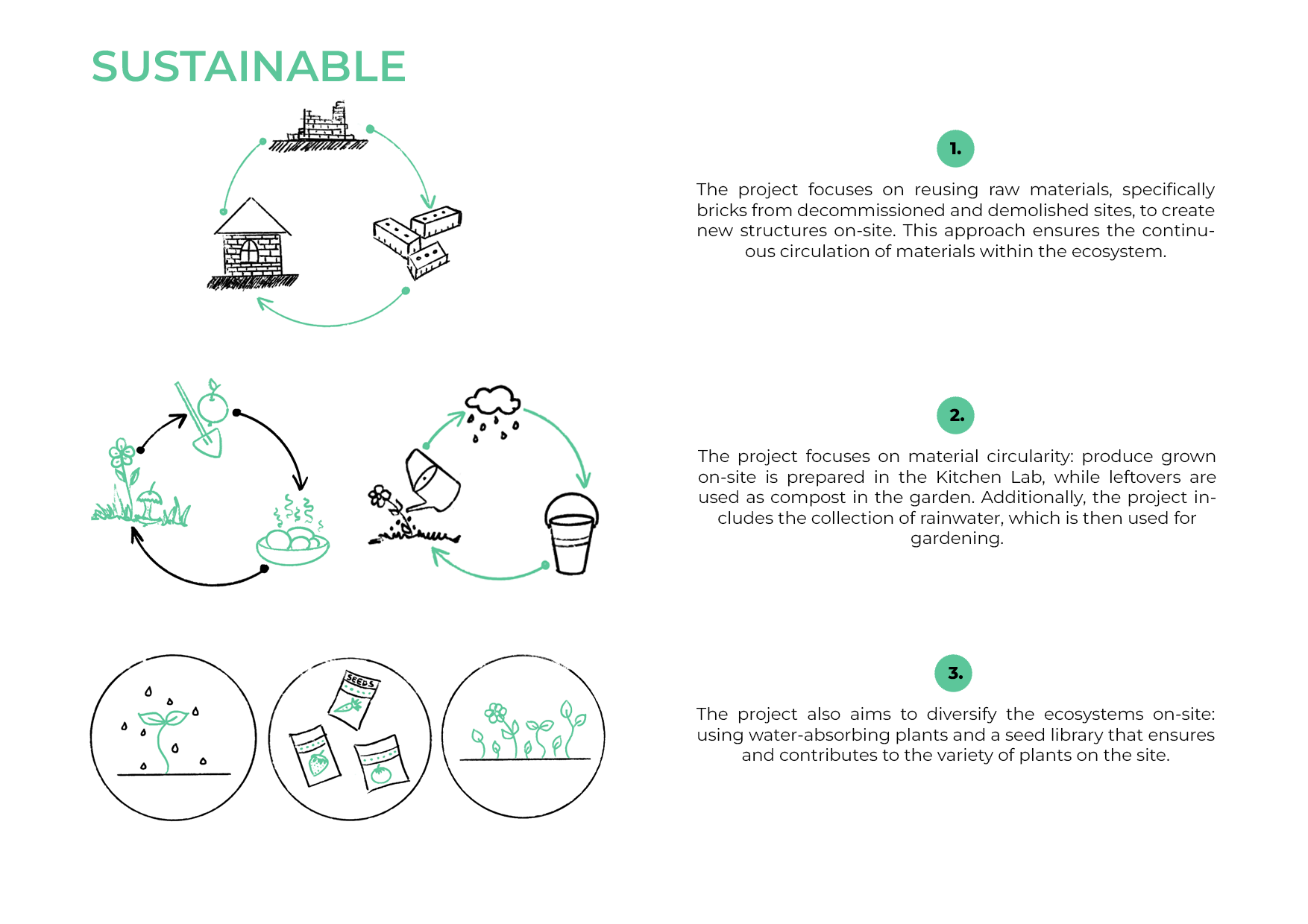 The project focuses on material circularity: produce grown on-site is prepared in the Kitchen Lab, while letfovers are used as compost in the garden. Additionally, the project includes the collection of rainwater, which is the used for gardening. It also aims to diversify the ecosystems on-site: using water-absorbing plants and a seed library that ensures and contributes to the variety of plants on the site.