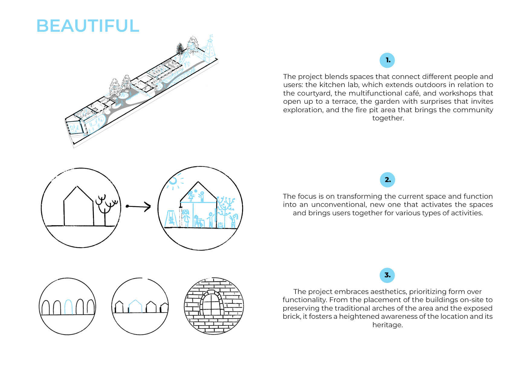 From children to seniors, and from locals to visitors, the project removes barriers and creates a space that is open to diverse needs. Adaptable spaces, such as the multifunctional café, creative workshops, and outdoor areas, allow flexibility in use, accommodating various activities and abilities. The project actively fosters social inclusion, ensuring that everyone can engage and contribute.