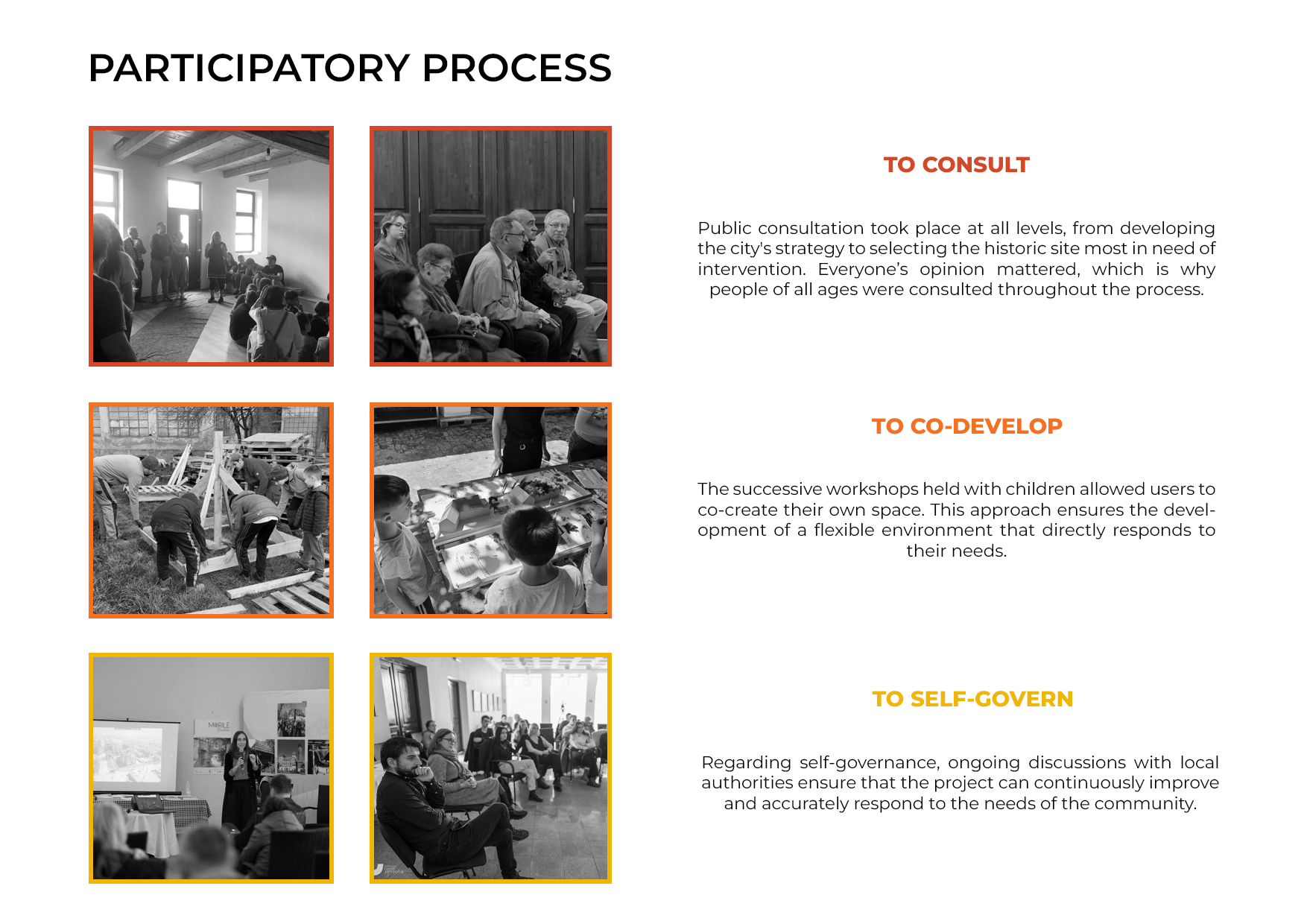 Participatory and co-creation methodology: A core aspect of the project is the active involvement of the community at every stage, from consultations to public workshops and brainstorming sessions. This participatory approach ensures the final result meets the needs and aspirations of the community, making it a model that can be applied to any heritage site or public space transformation.