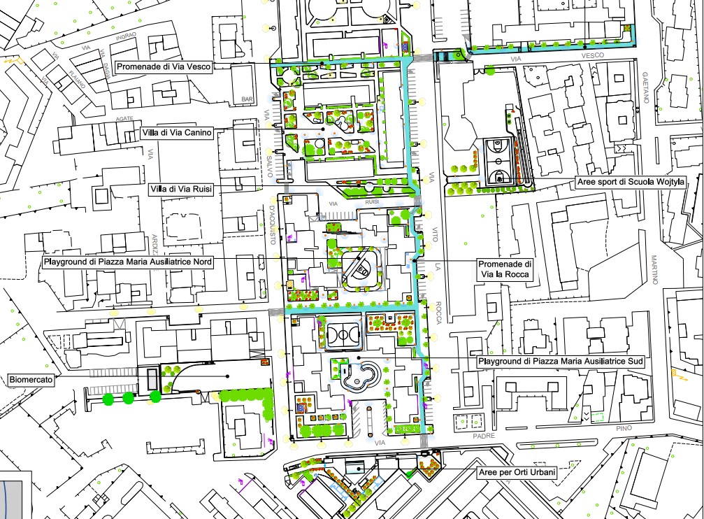 The project aims to foster urban integration and economic revitalization by promoting a model of an inclusive, sustainable, and well-being-oriented city. It achieves this through the regeneration of degraded urban spaces, combining sustainable infrastructure, inclusive practices, and the enhancement of cultural and artistic heritage. Target Groups: Neighborhood Residents: Young people, families, and older people facing economic and social challenges. Youth and Students expanding educational and recreational opportunities. Local Organizations and Institutions: Schools, associations, religious institutions, social housing agency and fire departments to support urban culture and education. Local economy: small businesses, farmers and artisans involved in revitalized markets. Visitors and tourists: attracted by cultural regeneration, public art and urban transformation. Specific Objectives: Sustainability: Create green spaces such as urban gardens and greenhouses. Promote soft mobility through cyclepaths and pedestrian routes. Social Inclusion: Converting enclosed spaces into open areas, fostering interaction through meeting spaces, events, sport and cultural activities. Cultural and Artistic Enhancement: Develop a Public Art Park with street art and themed furniture. Promote educational and artistic activities tied to the neighborhood’s identity and heritage. Local Economic Development: Redevelop the neighborhood market to support local producers. Attract shops, caféés and other businesses to revitalized areas.Expected outcomes: Improved Quality of Life: Reduce social deprivation and inequality. Enhance safety with lighting and video surveillance.Increased Urban Attractiveness: Transform degraded spaces into functional, welcoming and visually appealing areas. Boost visitors and tourists through cultural revitalization. Economic Growth: Create opportunities for micro-enterprises and local associations. Foster greater environmental and social awareness in the community.
