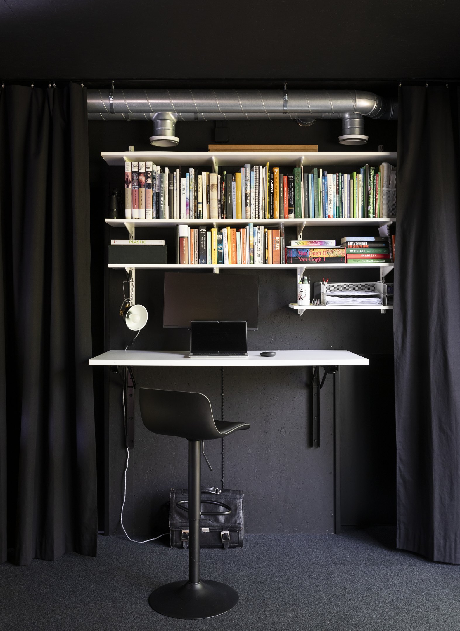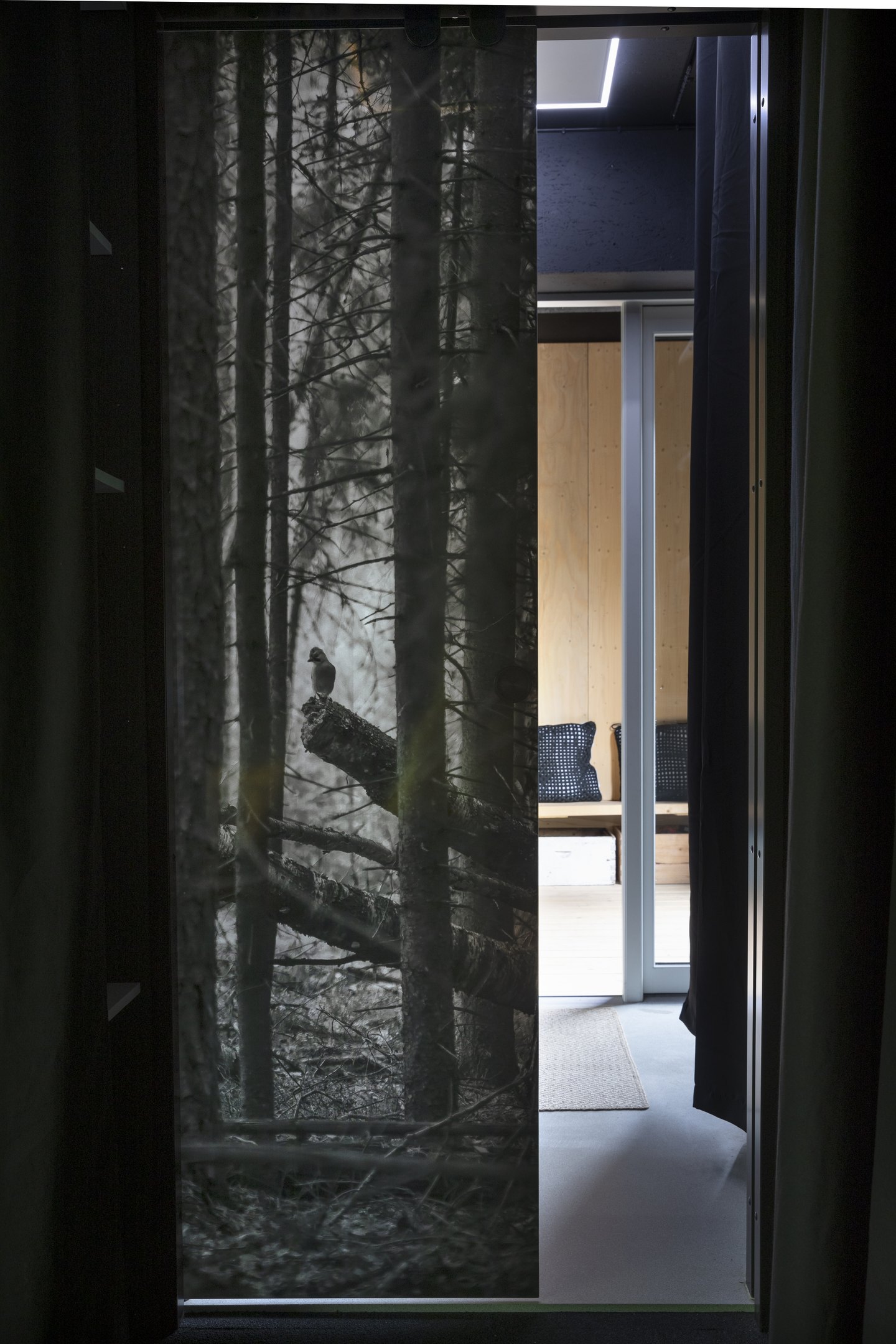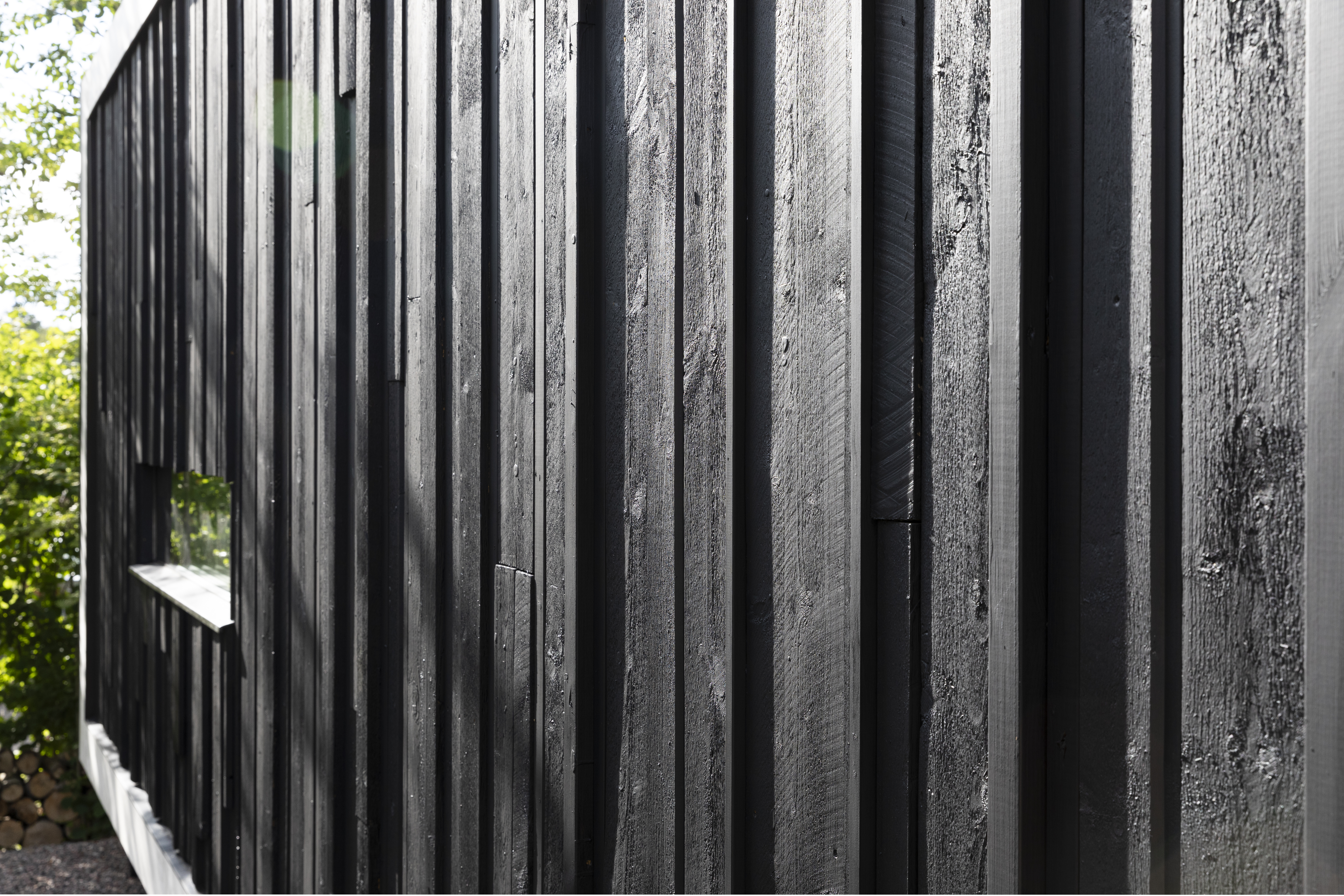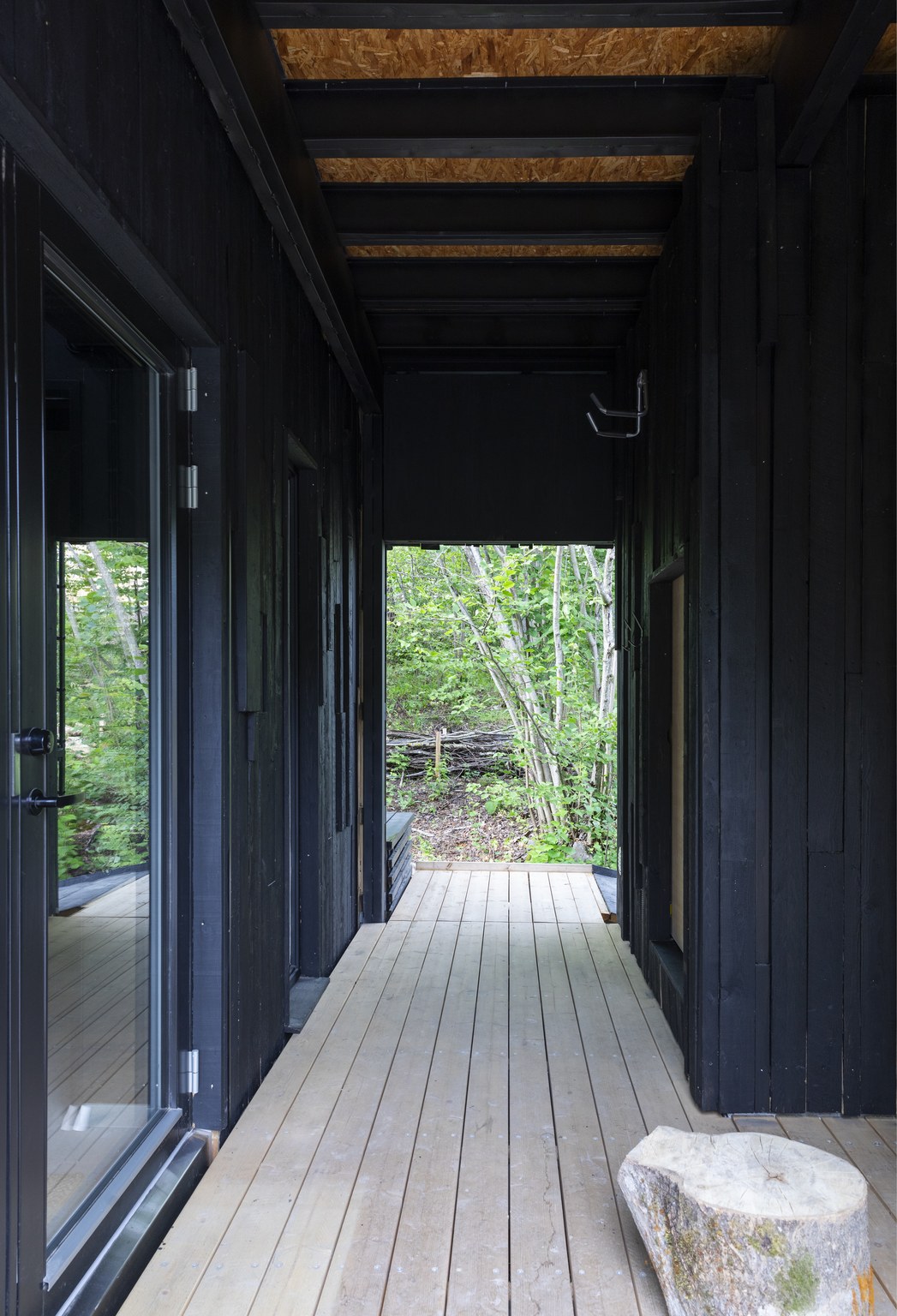 Following Tanizaki´s remark, the aesthetics of the project are interpreting two different types of “shadows”. First, the buildings surfaces are meant for studying the interplay of light and shadow. The reused planks of the façade make a relief that changes its appearance in relation to Earth´s rotation. Inside, the walls are covered with black, translucent and softly undulating full-height curtains. Together with black floor and ceiling, they generate a calming, meditative environment. As a radical paradigm shift to a fully circular economy begins with change of values, house Shadow offers a safe space for contemplating new ways of building and living in harmony with our home planet.