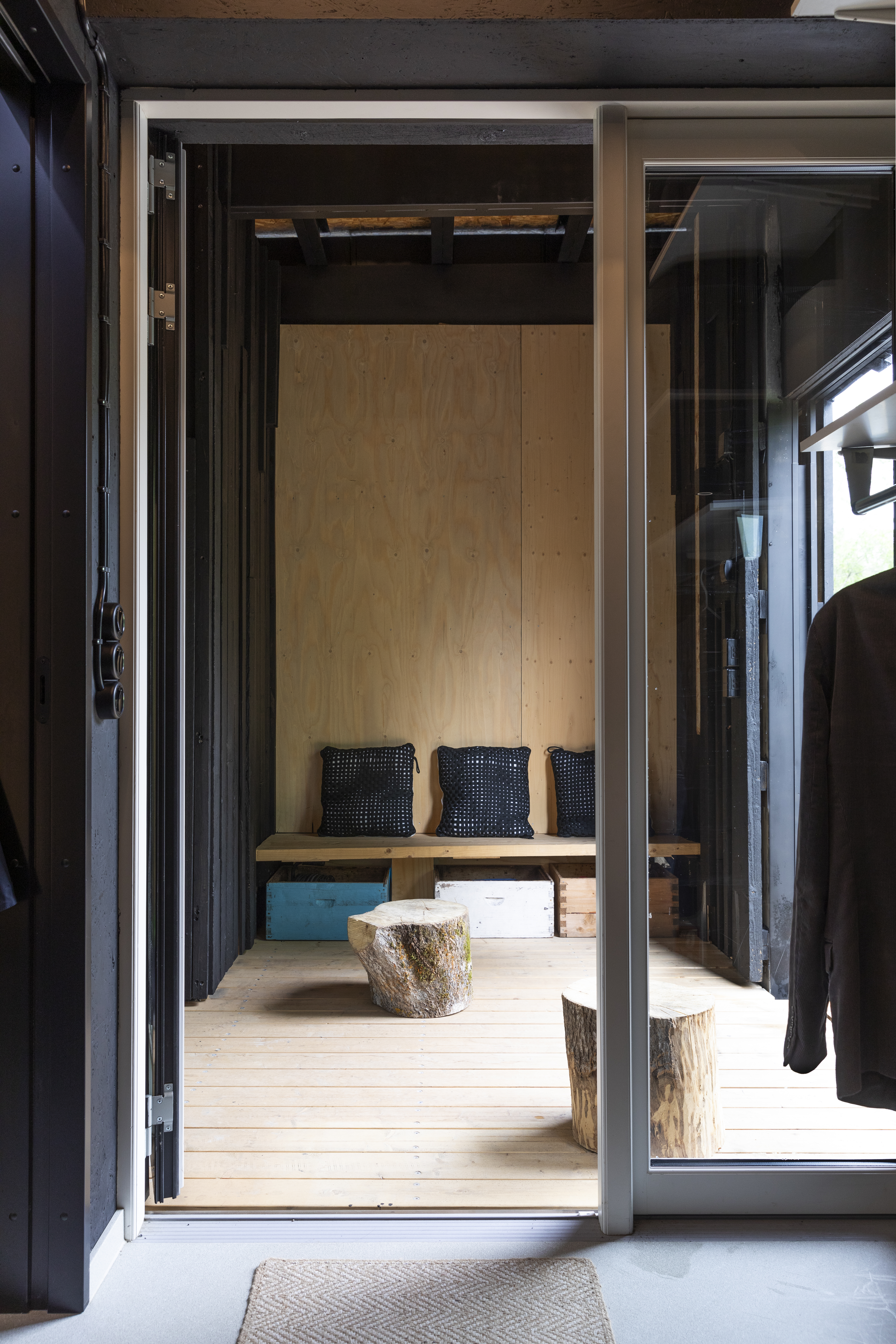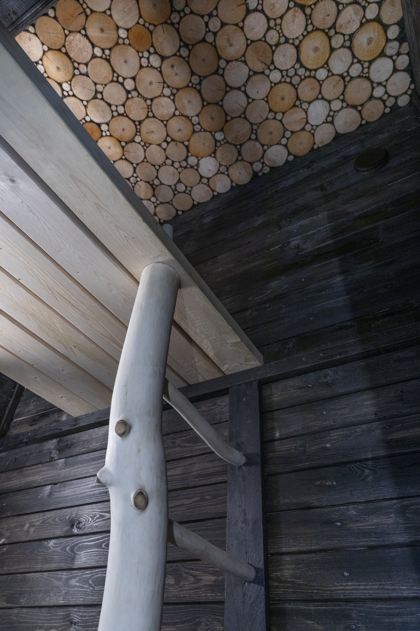 As an innovation niche, the house has probably the smallest wood-fired sauna in the country. It has less than 2 m2 floor area but is built in two floors. The platform that is directly above the stove is a downsized reinterpretation of the historical type of multifunctional saunas in the Häme region that had platforms for bathing and for drying food. This small sauna offers bath for two and is partially built from the trunks of the aspens that were cut from the site. They are sawn into discs and installed to the ceiling. Hence, the cells of the wood are open for maximising the moisture buffering effect. This small detail maximises the quality of the steam and makes the bath experience very enjoyable while reducing the need for energy.