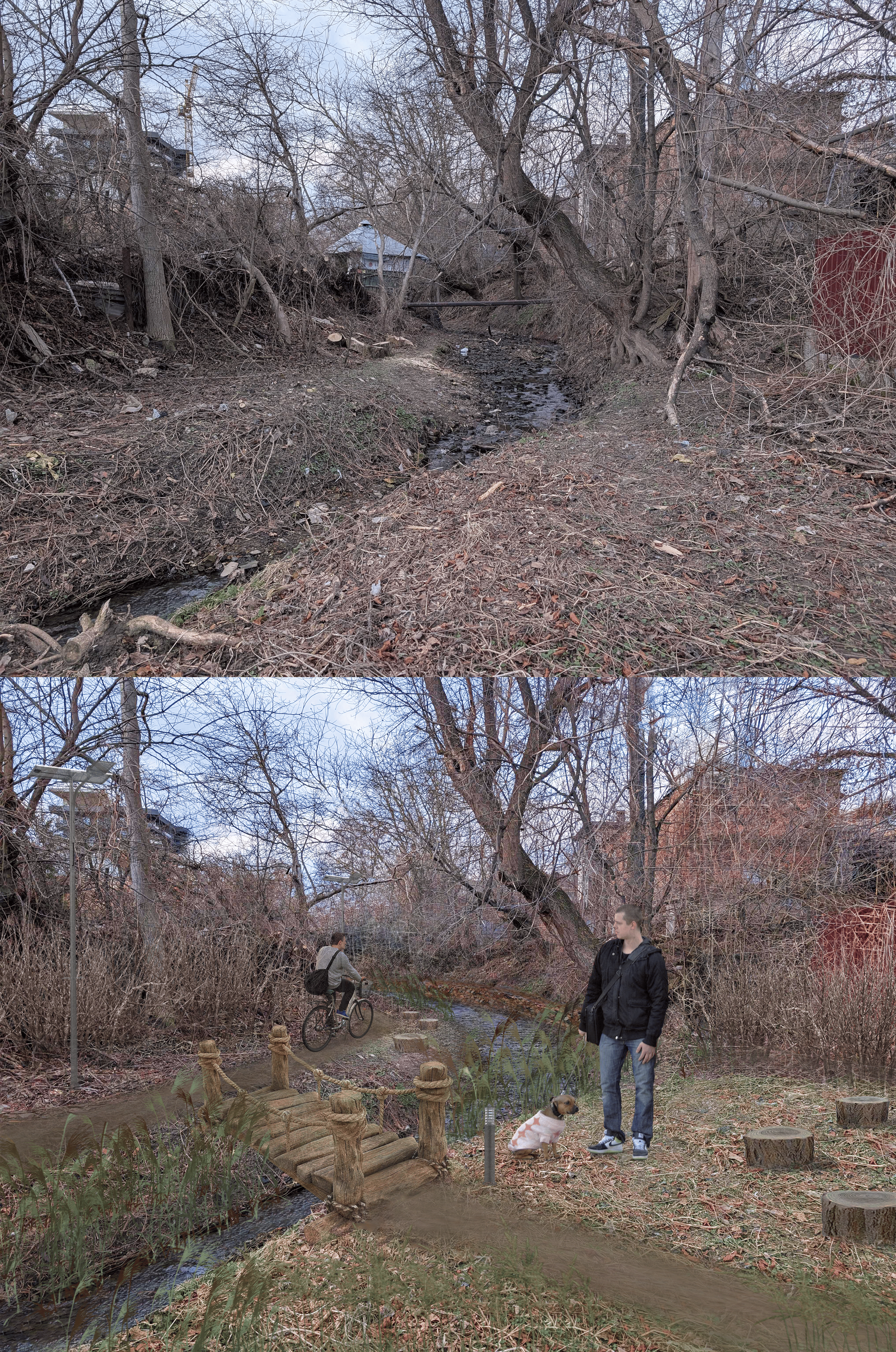 Being in a river valley surrounded by manor houses and architectural heritage will serve as an interesting contrast and make people rethink the role of nature, particularly small rivers, in the city. Another of our goals is to change the paradigm of how the locals perceive Kalicha, acknowledging it as a heritage, because the river is a natural object that has existed here for a long time, perhaps even before the humans showed up. Understanding this and spending time at Kalicha will fill people with new meaning, help them develop a sense of belonging to the territory and create a new cultural space.