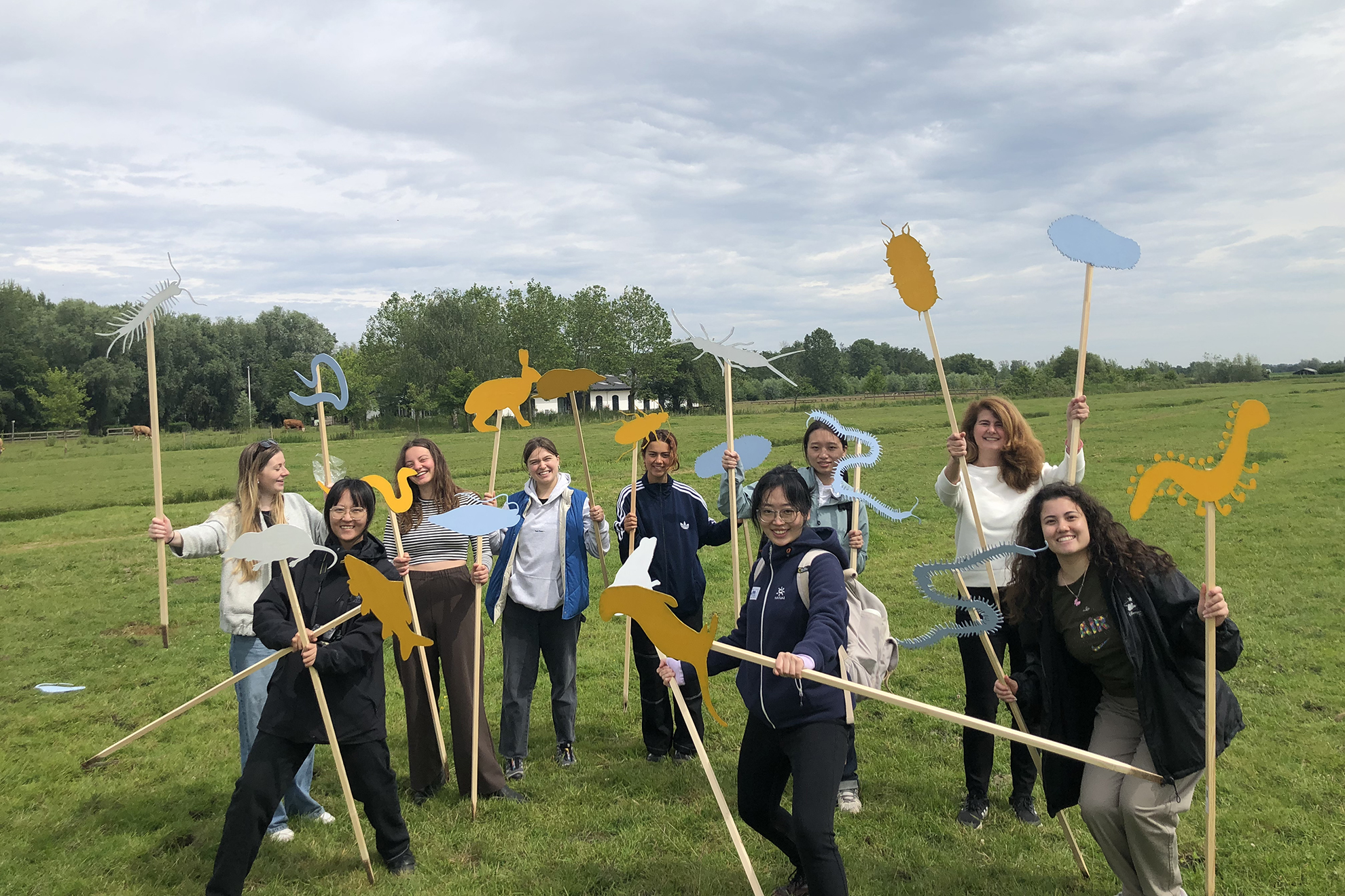 Nine TU Delft students from landscape architecture, architecture, and urbanism programs led different phases based on their expertise. Three landscape architecture students directed the first phase, "Exploring and Playing the Landscape," focusing on landscape understanding and sustainability. Three urban design students led the second phase, "(Co)Designing the Landscape," emphasizing urban-landscape planning according to sustainable principles, while the last three architecture students managed the third phase, "(Co)Creating the Landscape," addressing architectural composition and bringing aesthetic quality to the installation. The involvement of both international and Dutch-speaking students fostered inclusive communication with children.
