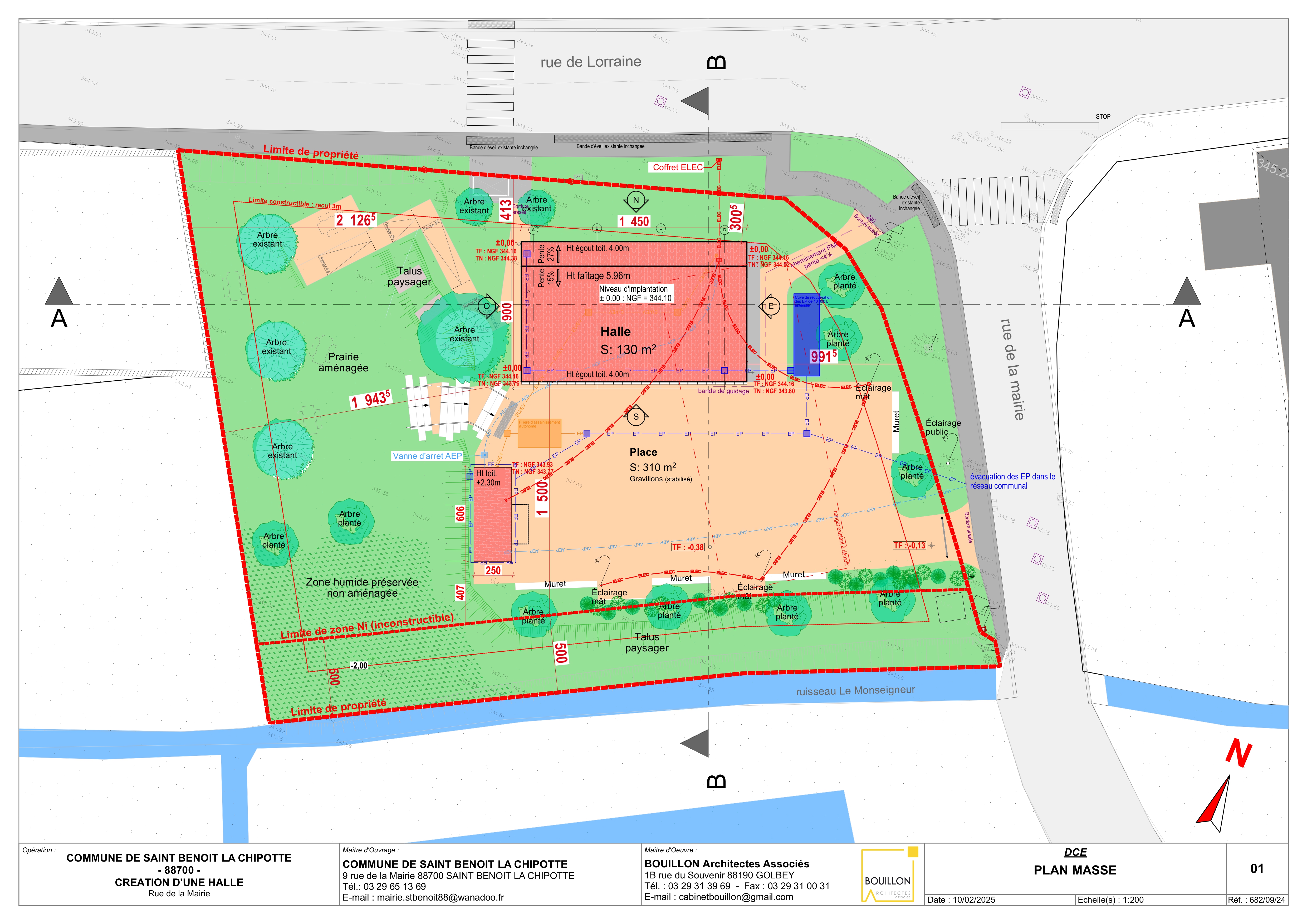 The hall will be designed to accommodate photovoltaic panels in the future. It will constitute a green lung in the village center, and constitutes the first stage of requalification of this rural commune, since a second phase is planned with the creation of a path towards the Town Hall square, the Church passing through a developed and secured space on communal land including a ruined building to be redeveloped in a future project.