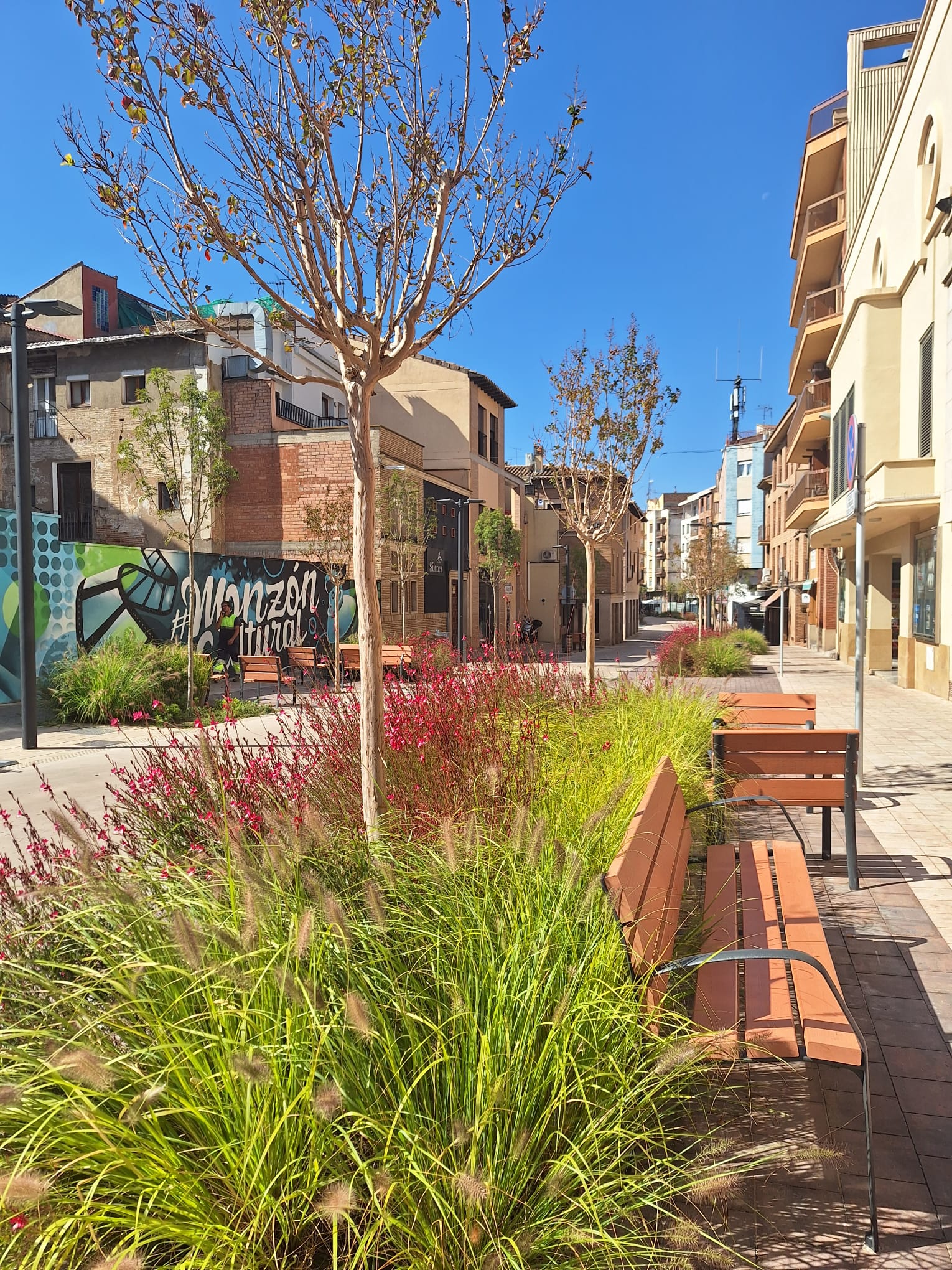Public space has been transformed into a narrative canvas, incorporating archaeological and historical elements that reinforce Monzón’s cultural identity: