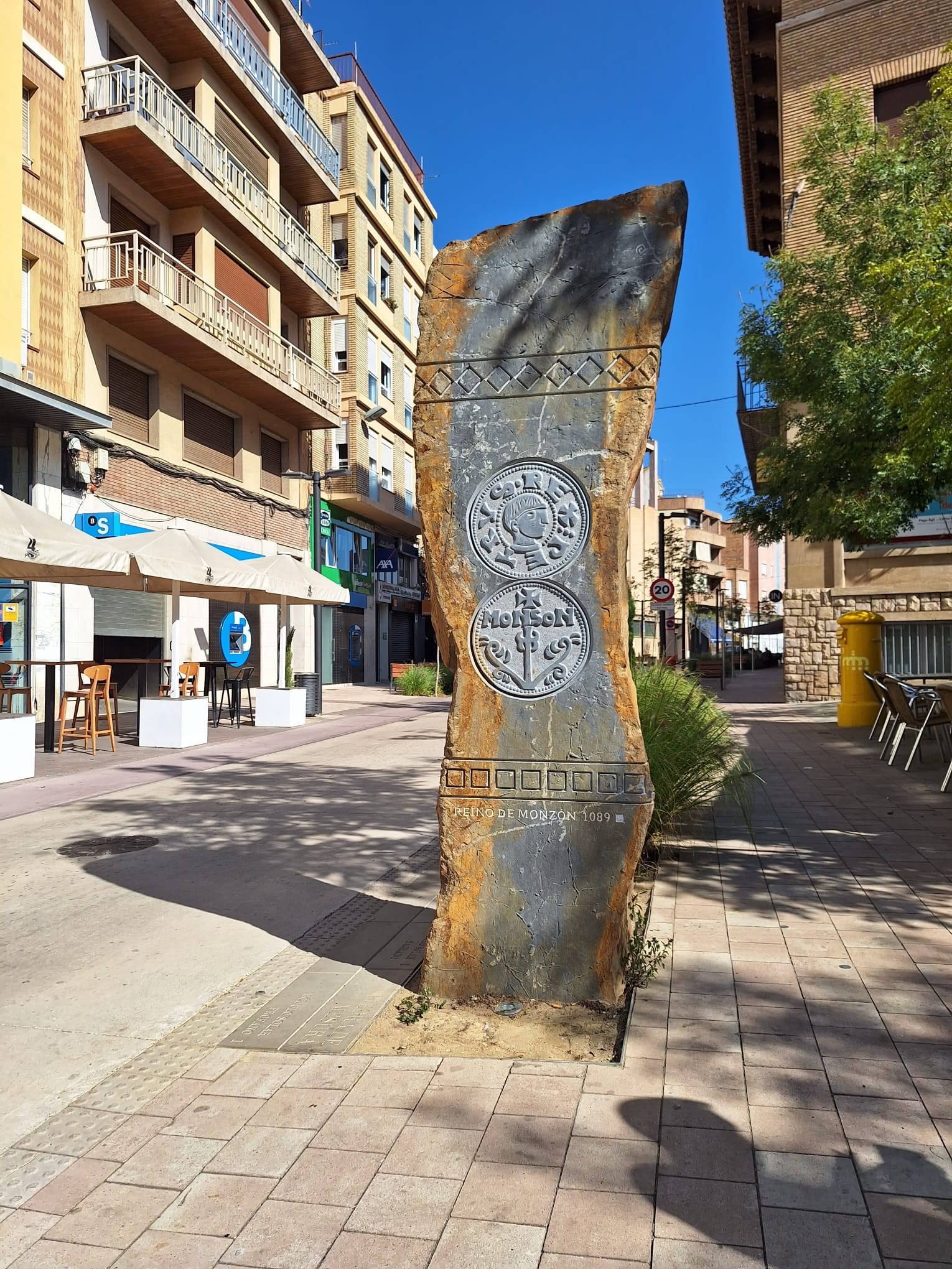 • Engraved stone of a medieval Monzón coin symbolizes the city’s historic commercial and political relevance.
