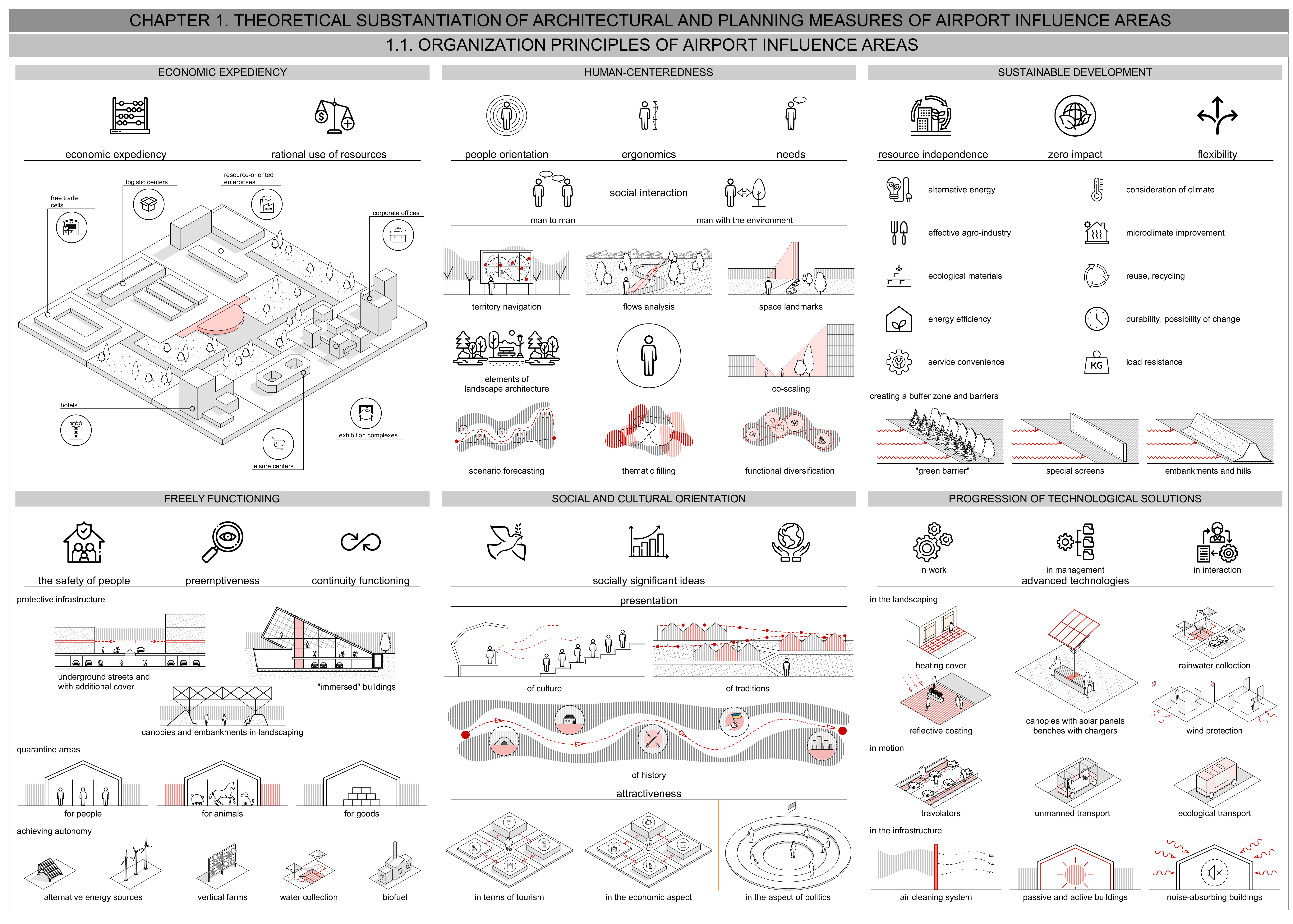 During the design process, I also relied on the work of researchers who studied modelling and architectural-planning organization of transport hubs (I. Dreval, V. Shchurova, O. Ryabova), the placement of monofunctional developments near airports (N. Avdeyeva, O. Semikina), the architectural-planning organization of airport development objects (H. Ageyeva, M. Kasim), aerotropolises or airport cities (J. Kasarda, K. Veretennikova, S. Timchenko, D. Rundin, N. Ismailova), inclusive harmonization and design of the architectural environment (N. Shebek), as well as counteracting the spread of noise and electromagnetic fields (L. Levchenko).