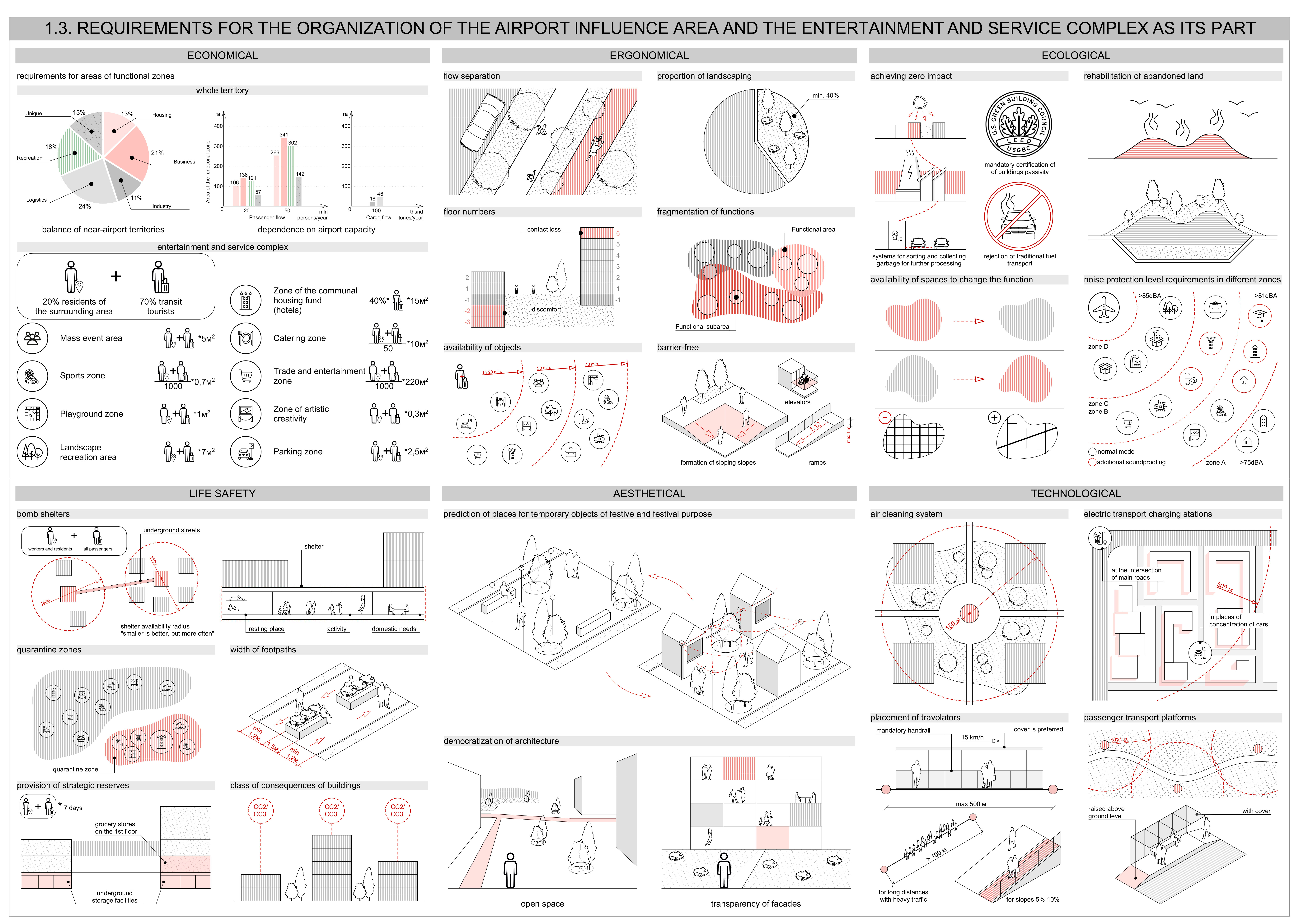 Before the design process began, an analysis of scientific studies and existing solutions related to this topic was conducted. This work resulted in a theoretical justification for the architectural and planning organization of airport impact zones. It includes principles, compliance requirements, and a comprehensive model of airport-adjacent areas, detailing what can be located there, how elements interconnect, and how to balance functional spaces.