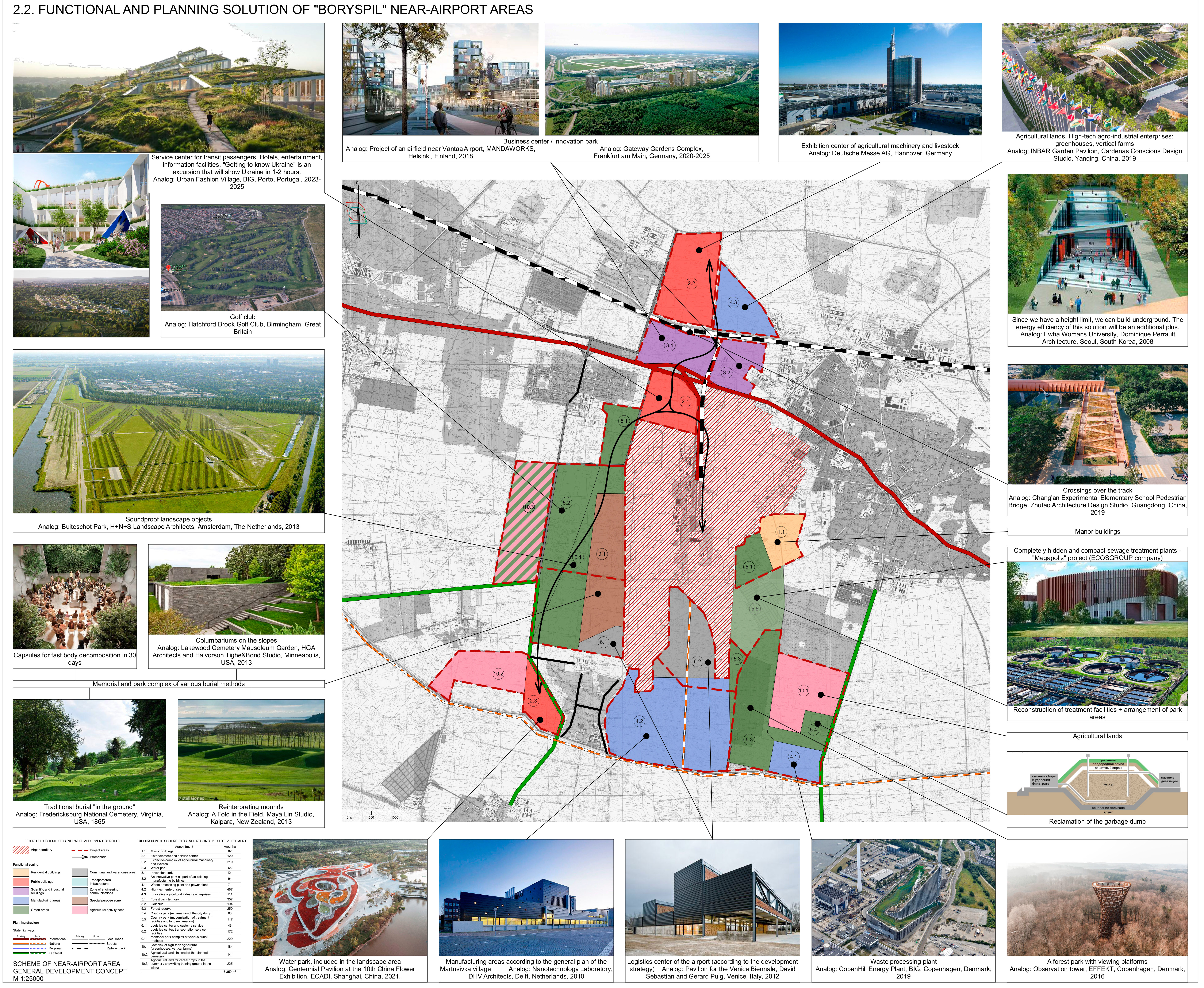 The project aims to revitalize neglected areas around the airport by introducing functions that serve travelers, locals, and businesses that rely on transportation mobility. This would create more jobs and activities in the region, reducing daily migration to Kyiv and easing pressure on the transportation network. Additionally, the proposal addresses existing issues: the landfill will be replaced with a waste processing plant, while the freed-up land will be turned into a park to help reduce aircraft noise. The planned cemetery will be relocated farther from residential areas and reimagined as a park, serving as a noise barrier by reviving the ancient tradition of burial mounds.