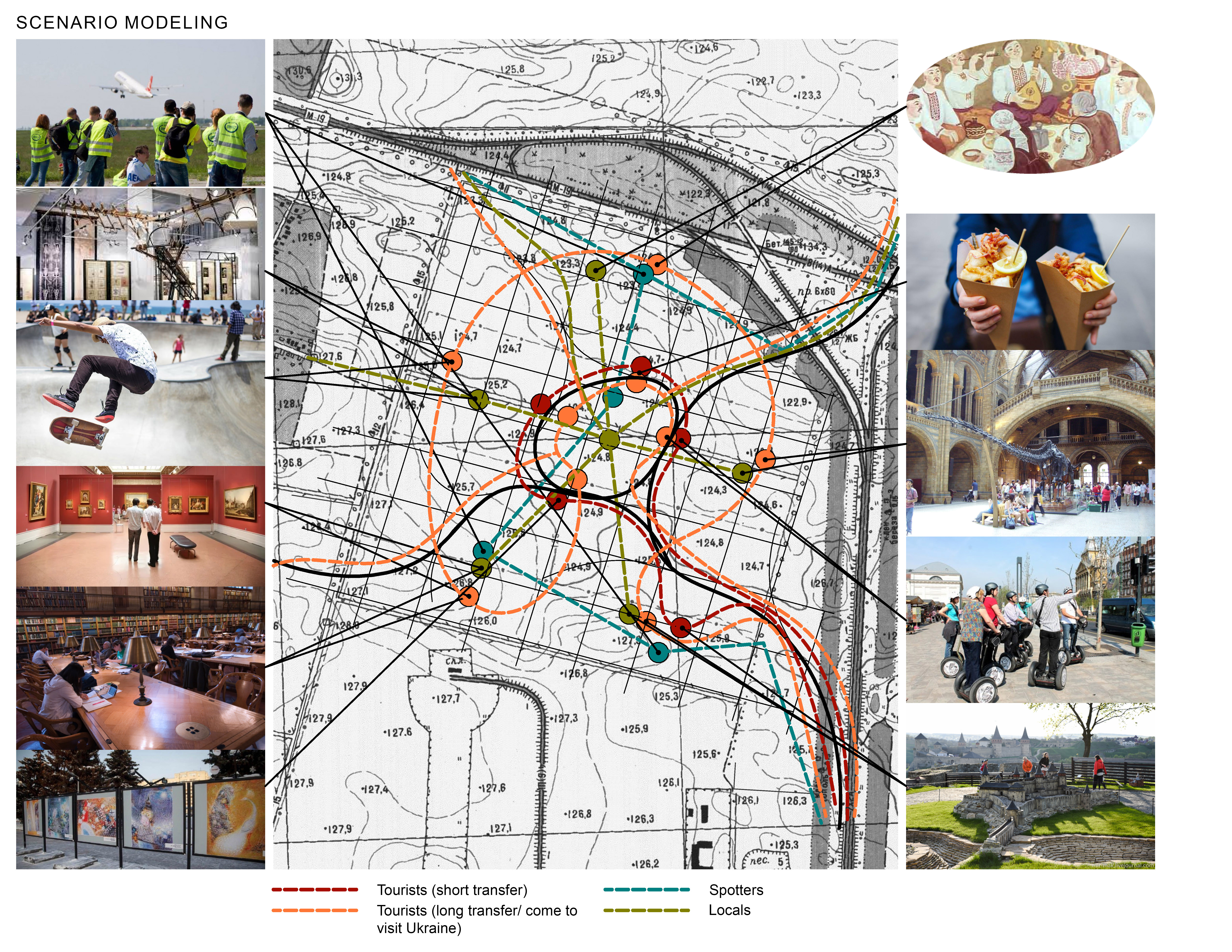 Next, information was gathered on Boryspil and its surroundings. The study covered the evolution of the area over ten centuries, its identity, and existing social, political, economic, and architectural planning challenges and constraints.