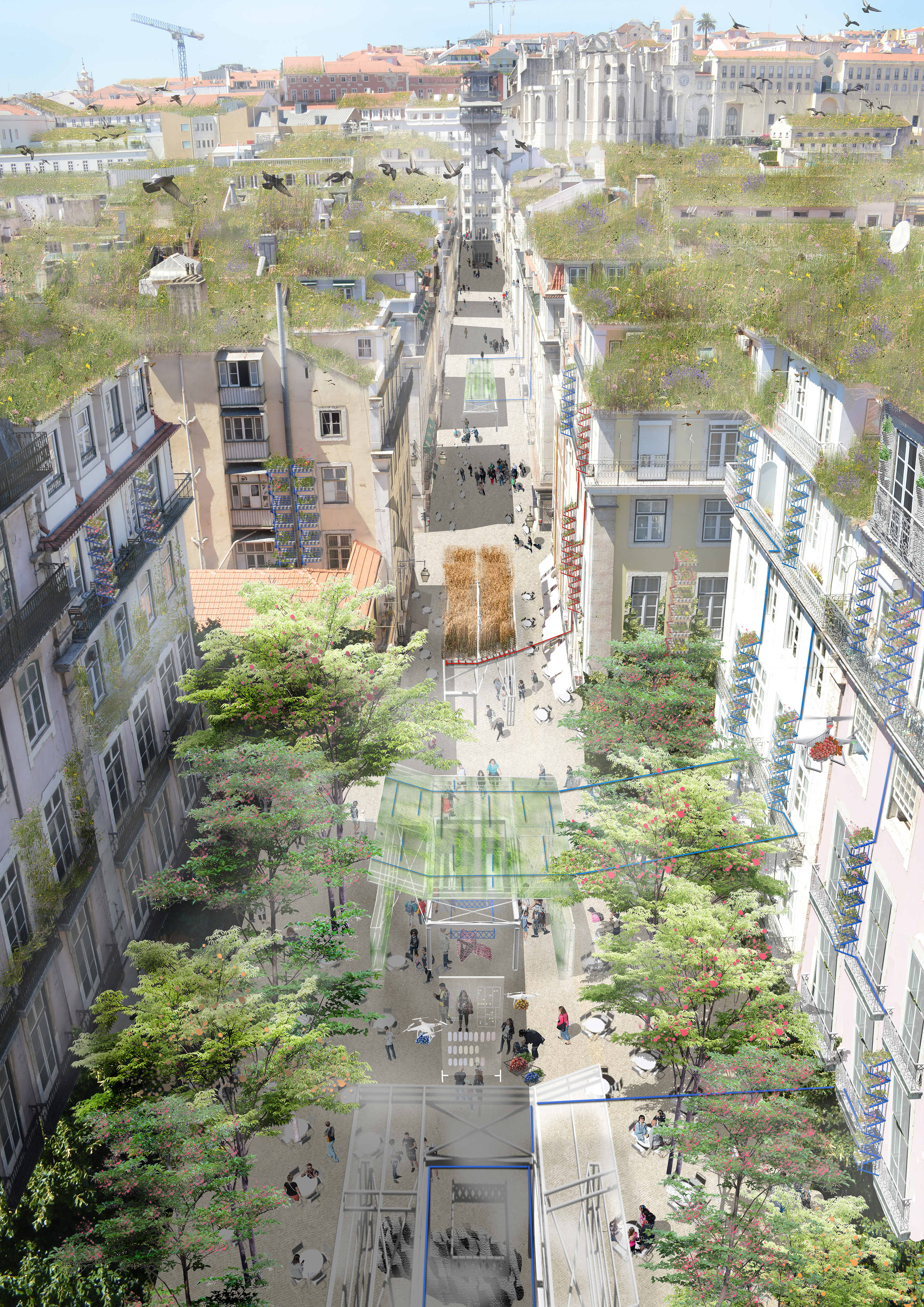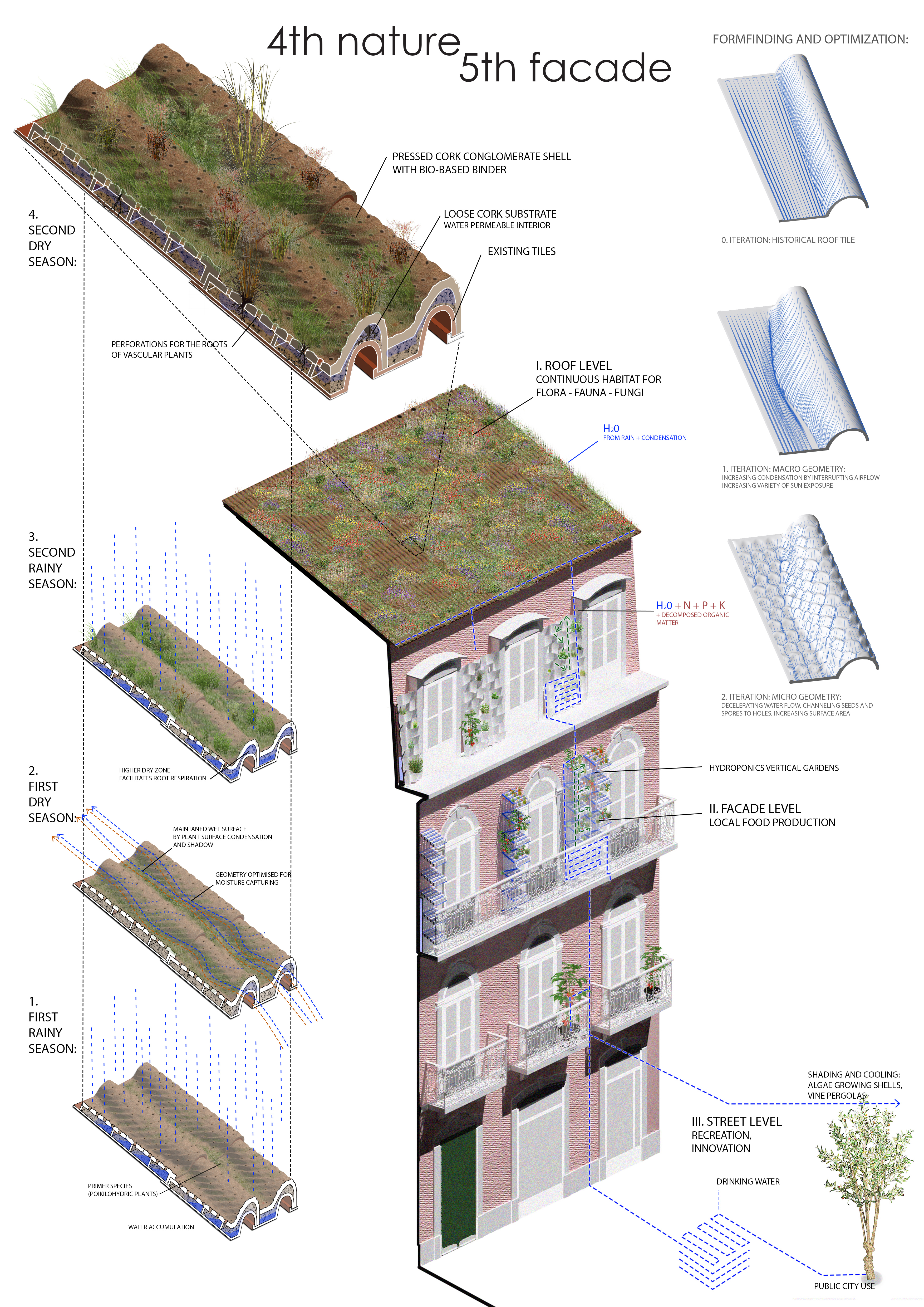 4th nature 5th facade is a platform for the seed of life to grow freely, and evolve into a continuous ecosystem. While respecting the historical fabric of the centre of Lisbon, this green infrastructure improves biodiversity by connecting fragmented habitats, and mitigates floodings and extreme heats by retaining water and regulating moisture. By following distributed design principles, this upgrade of the traditional roof tile—together with nature—can spread and make cities more resilient.