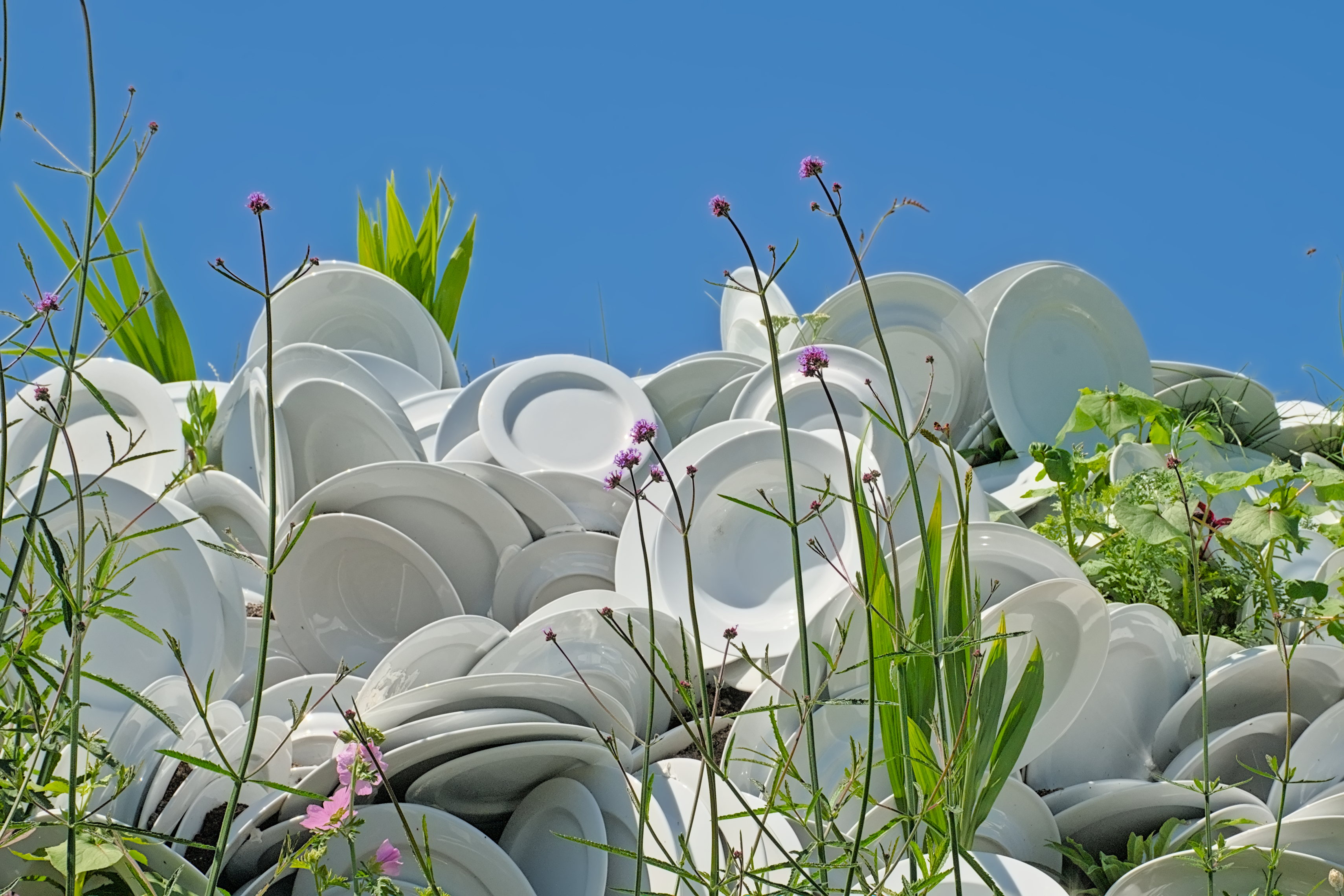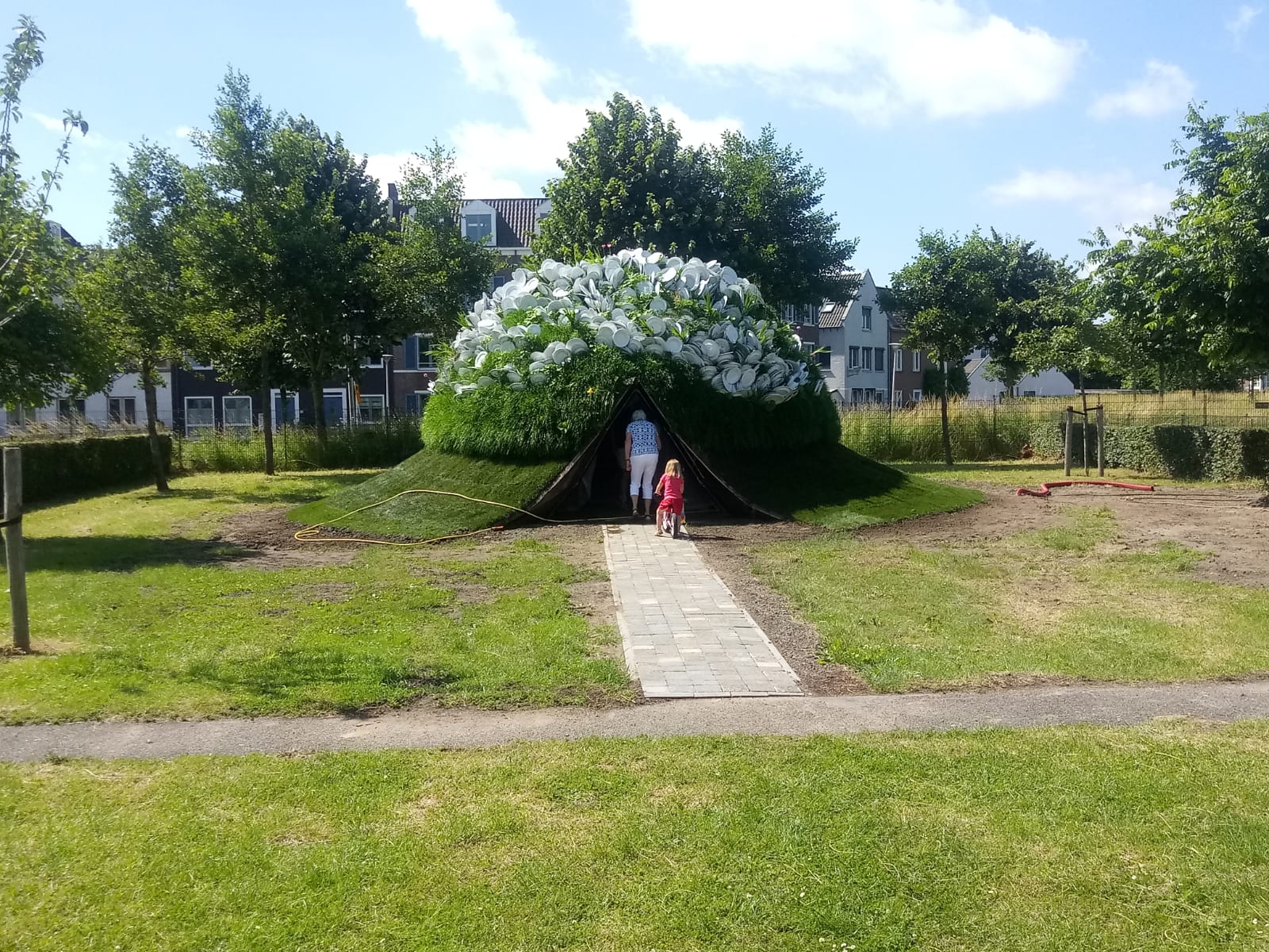 After two years, we relocated and transformed the sculpture in Utrecht, the Netherlands. Using the same skeletal structure, we rebuilt it as a circular pavilion with salvaged construction wood and 3,000 discarded dining plates, once again creating a flowering, green outer shell with an integrated irrigation system. As before, we collaborated with newcomers learning the local language, partnered with the Art & Society division of Utrecht University, developed an educational game, launched a parallel program called Pollinations featuring works by Dutch and Belgian artists, and participated a workshop for young landscape architects.