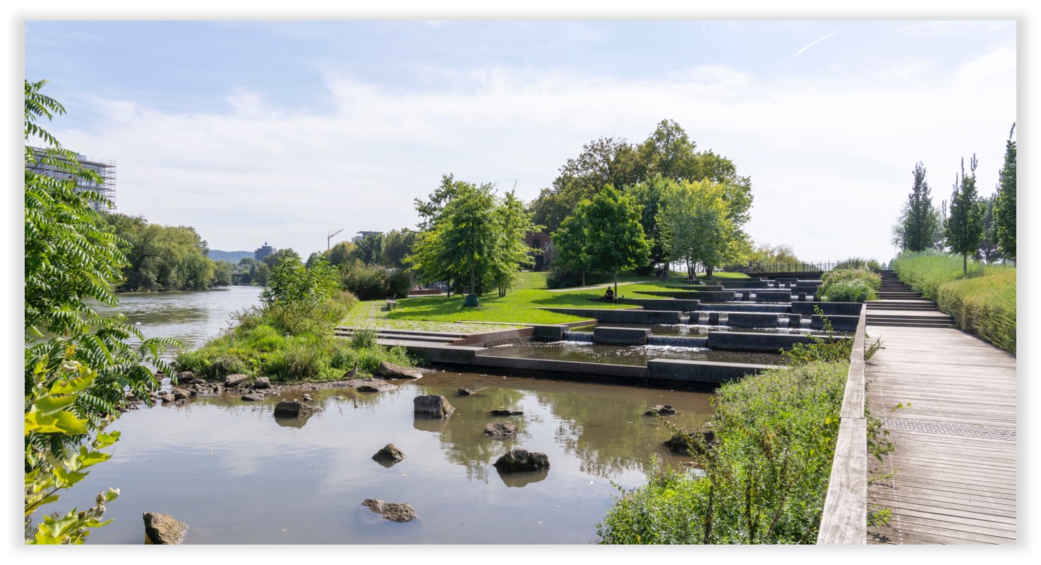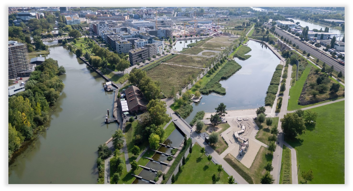 Neckarbogen spans 17 hectares of green spaces, transforming a former brownfield into a sustainable district. Five parks - Neckaruferpark, Hafenpark, Campuspark, Floßhafen, and Stadtdschungel - complement a renatured riverbank, lakes, a promenade, and diverse plant habitats to ensure rich biodiversity.